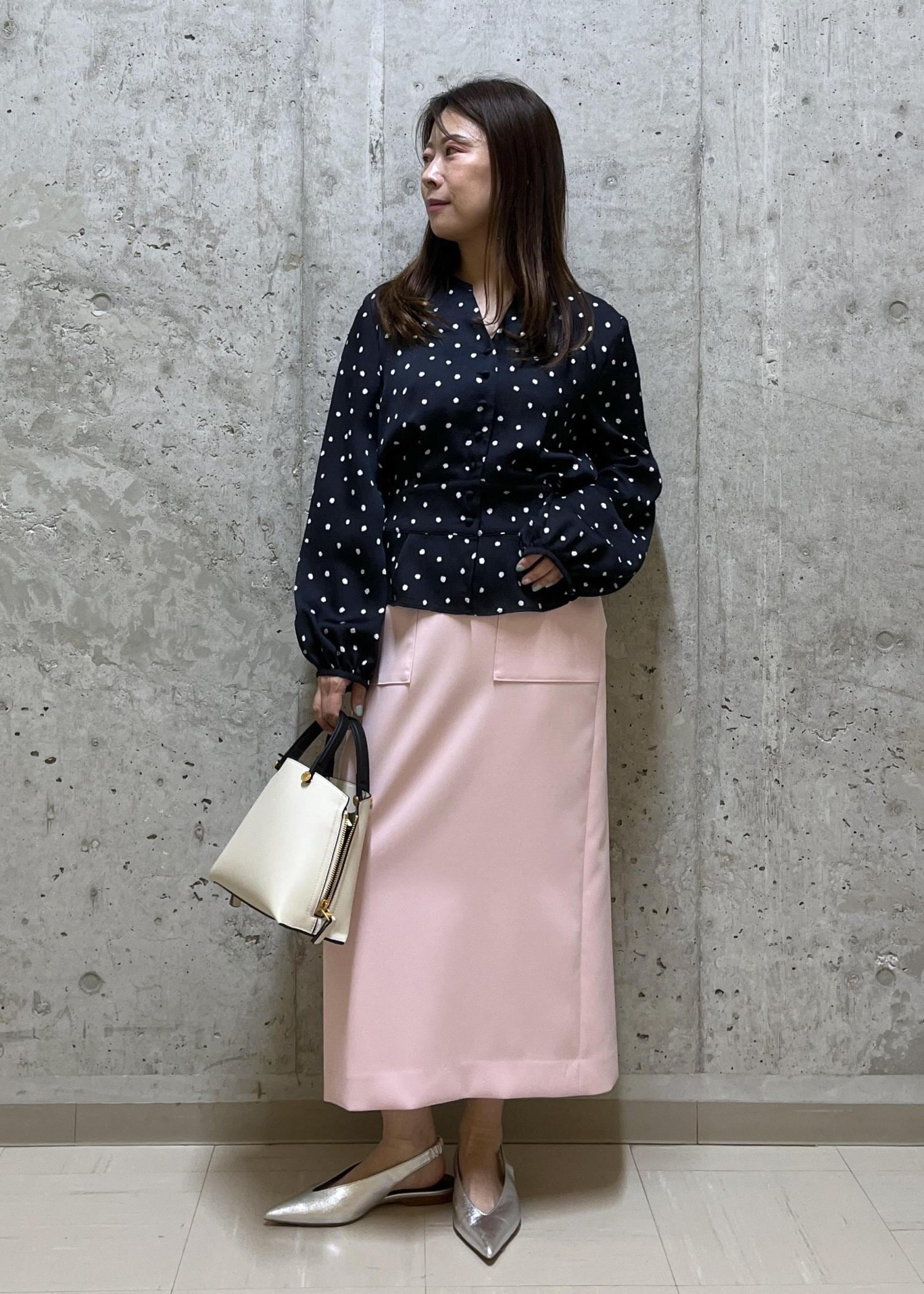 ピンクのスカートとドットのブラウスで少し甘めのスタイルです。