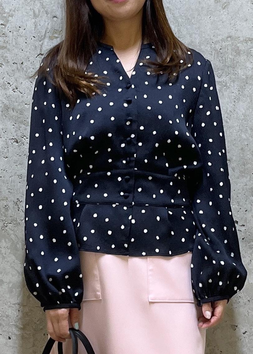 Vネックで小顔効果もあり、大きすぎないドットプリントで着痩せ効果もあります。 -
