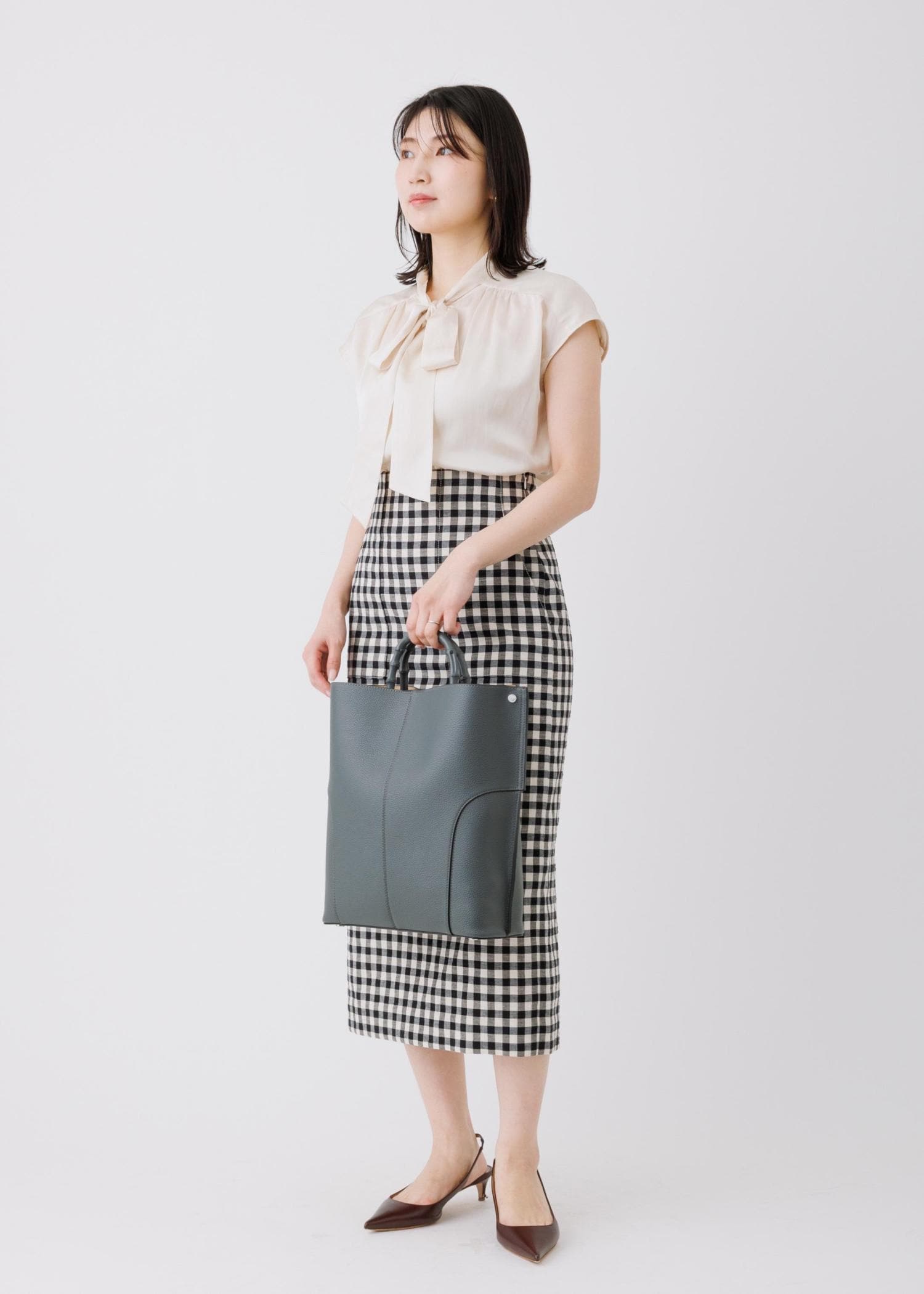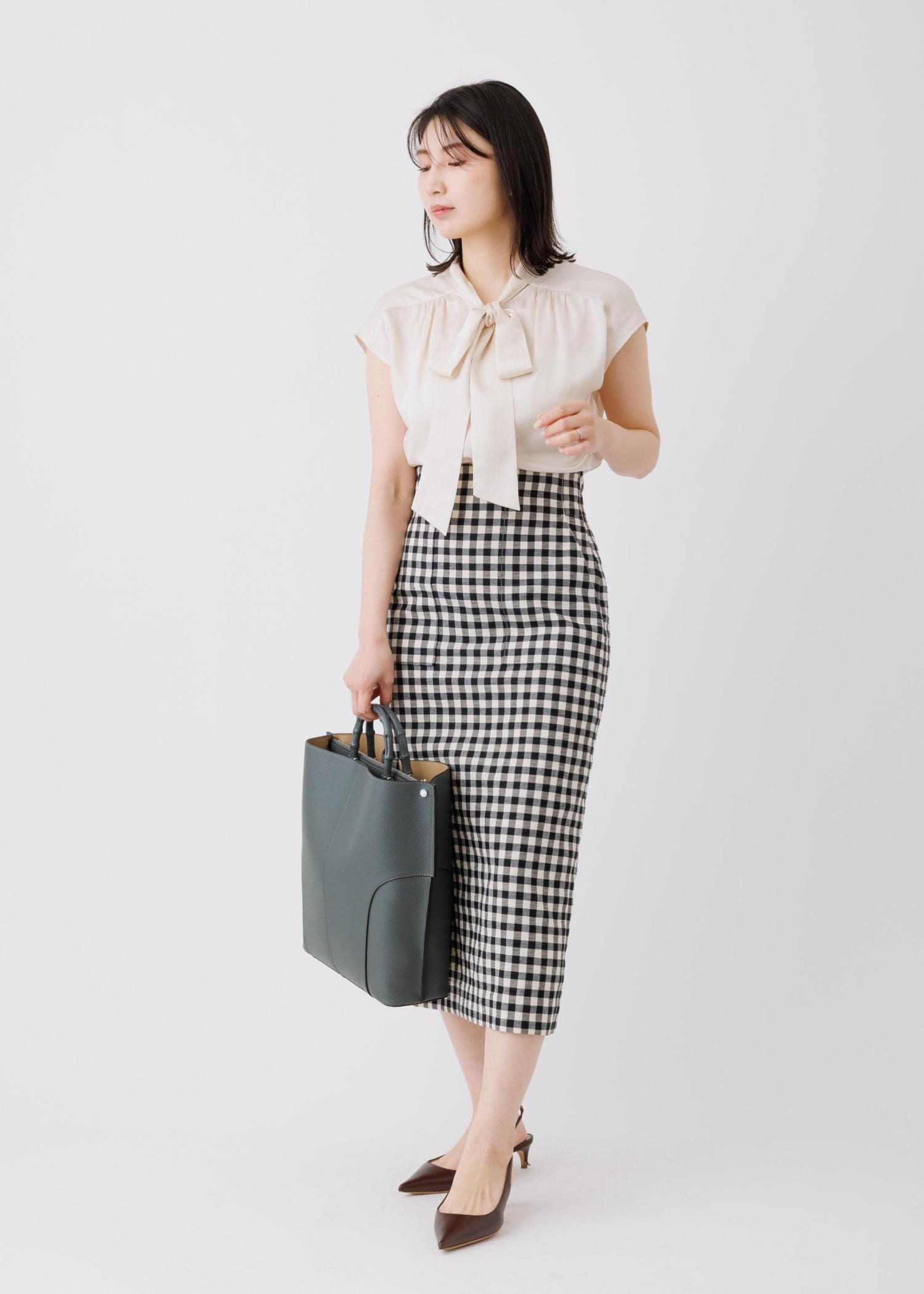 上品なアイボリーのボウタイブラウスと合わせて、