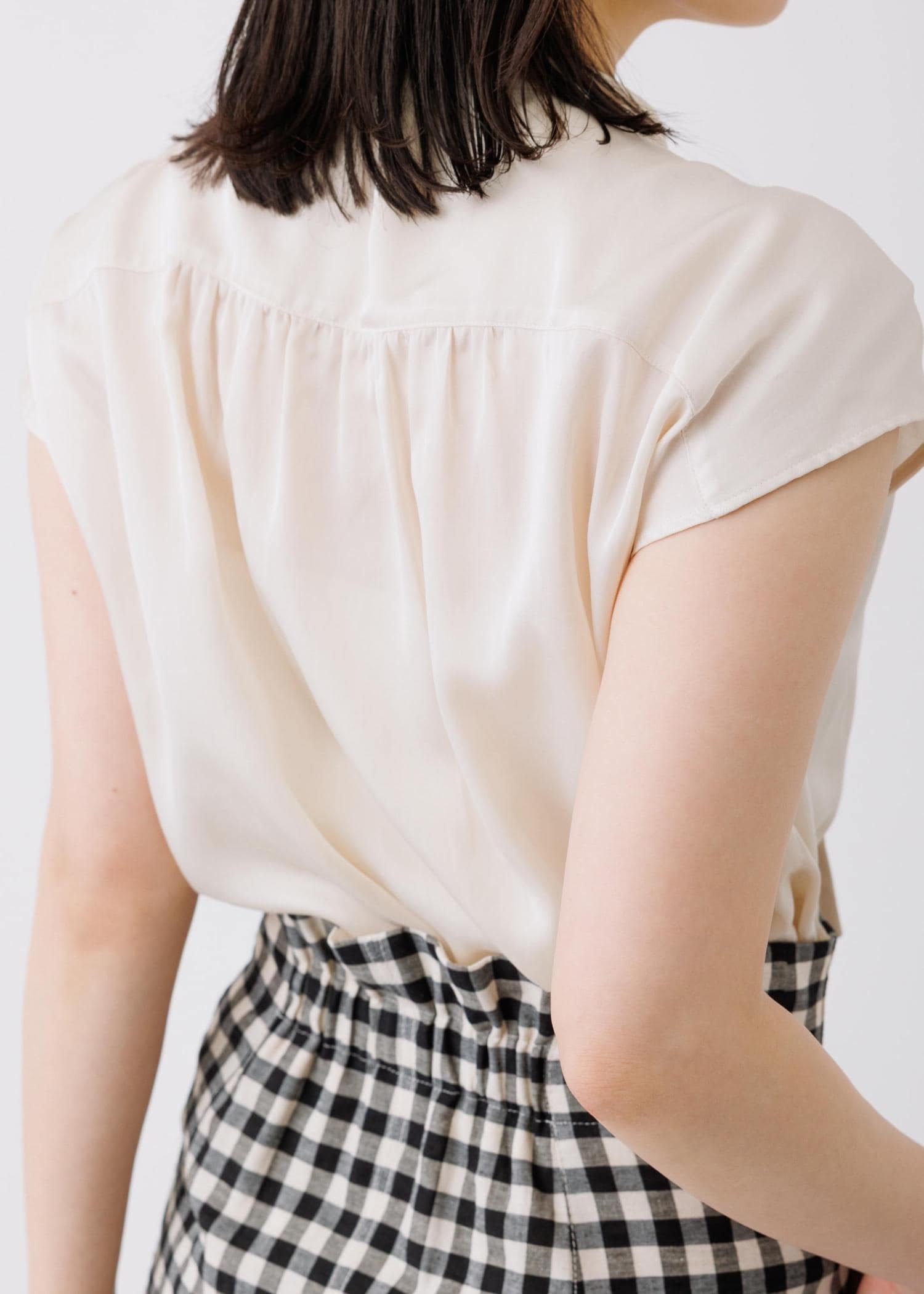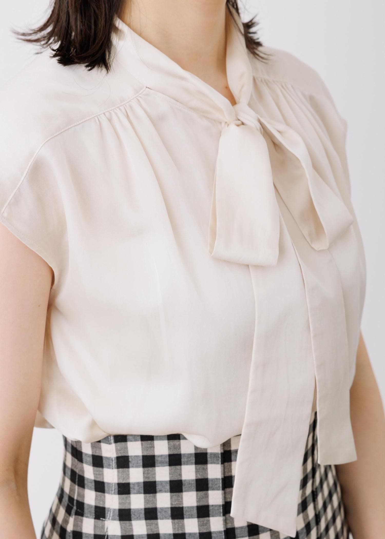 予約ROPÉサテンシルケットボウタイブラウス/イージーケアベージュ / 38¥23,100レビュー身幅はゆとりがあり、ギャザーでドレープ感が出るのでふんわりとしたシルエットで着られます。
