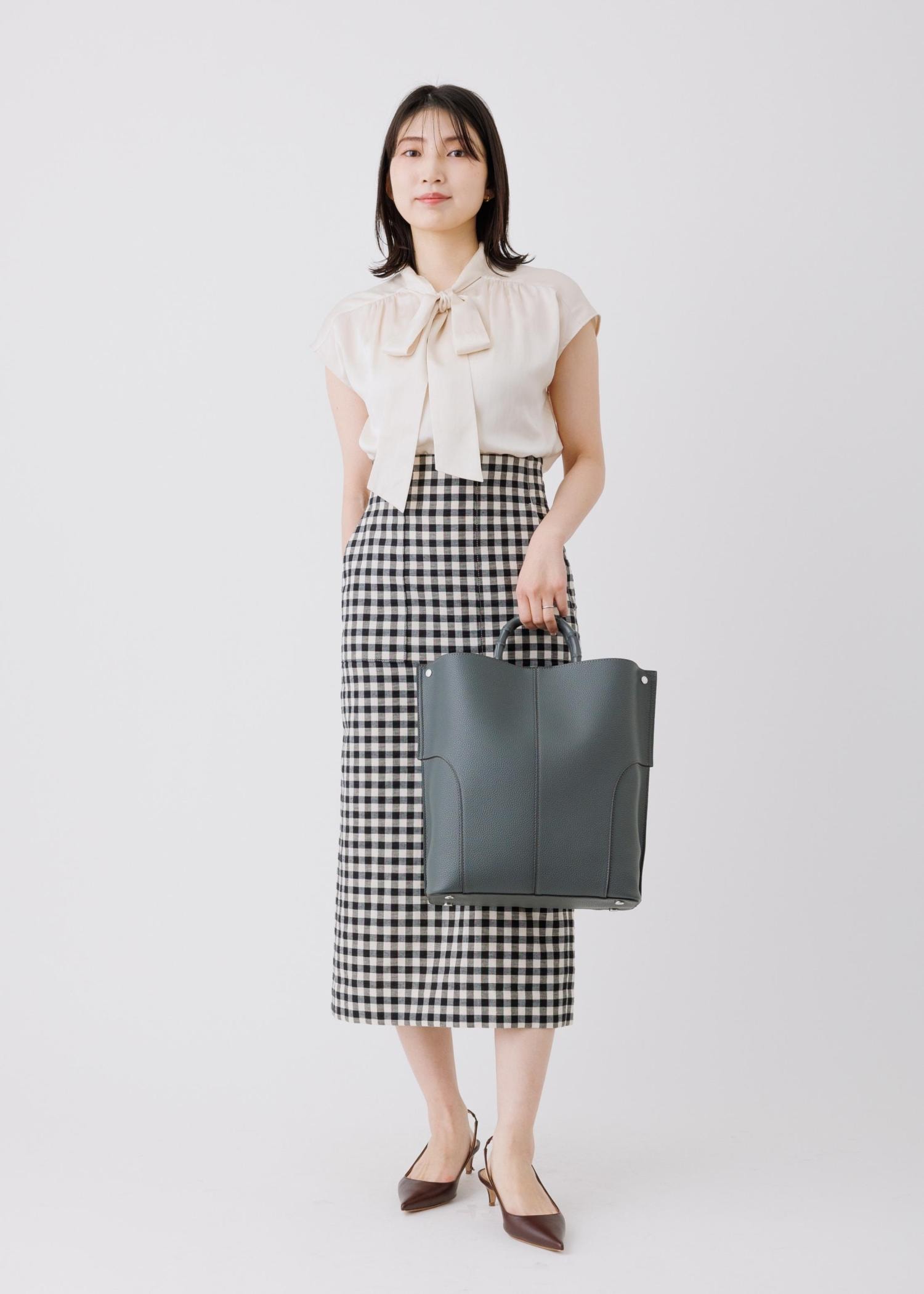 ウエストリボンをせずに着るとややAラインの、広がりすぎないシルエットで身体のラインを拾いません。
