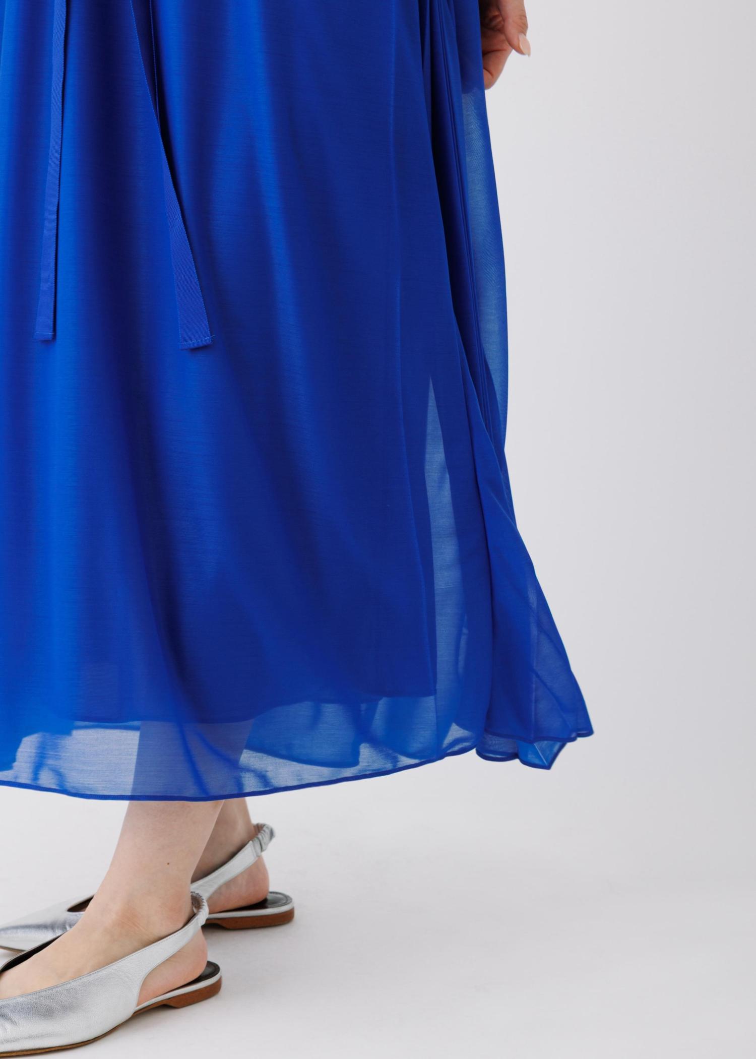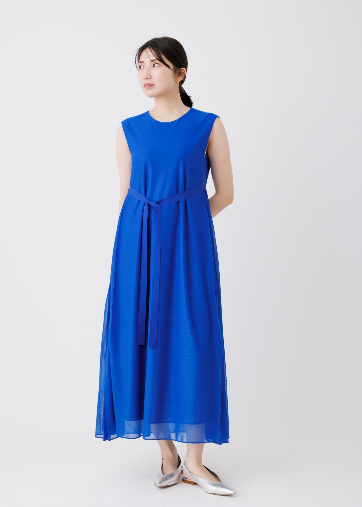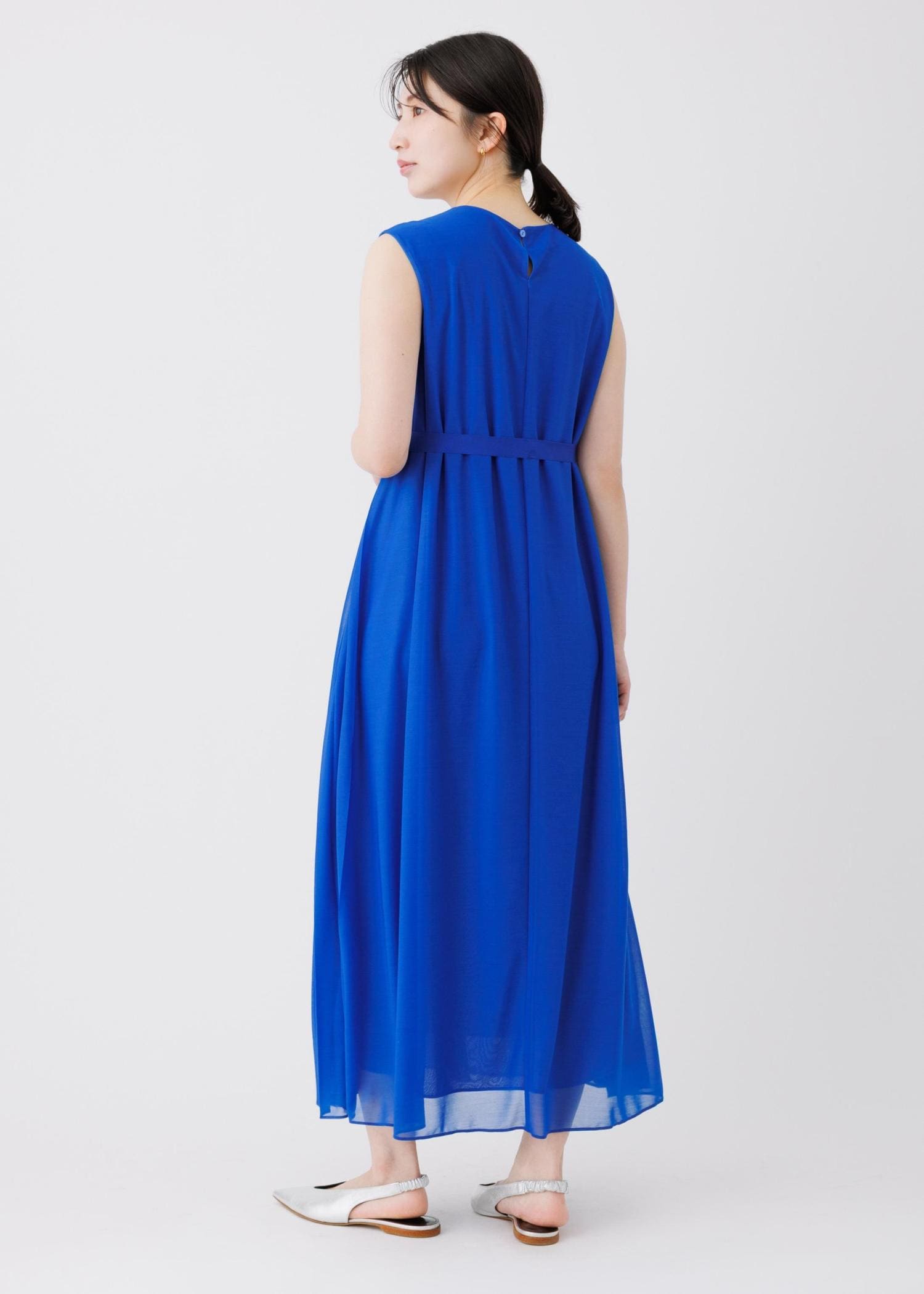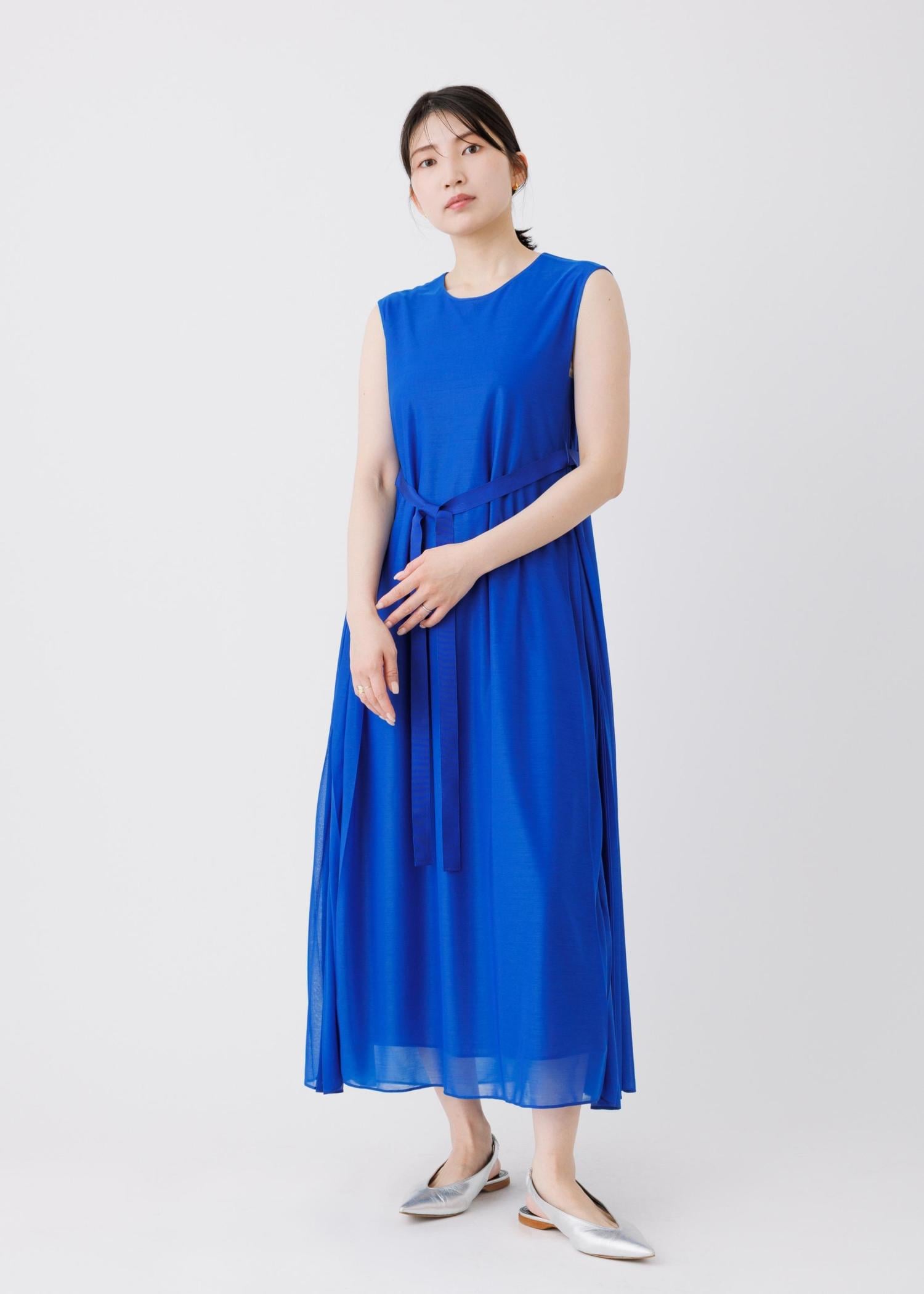 目を引く鮮やかなロイヤルブルーがきれいなロングワンピースの上から