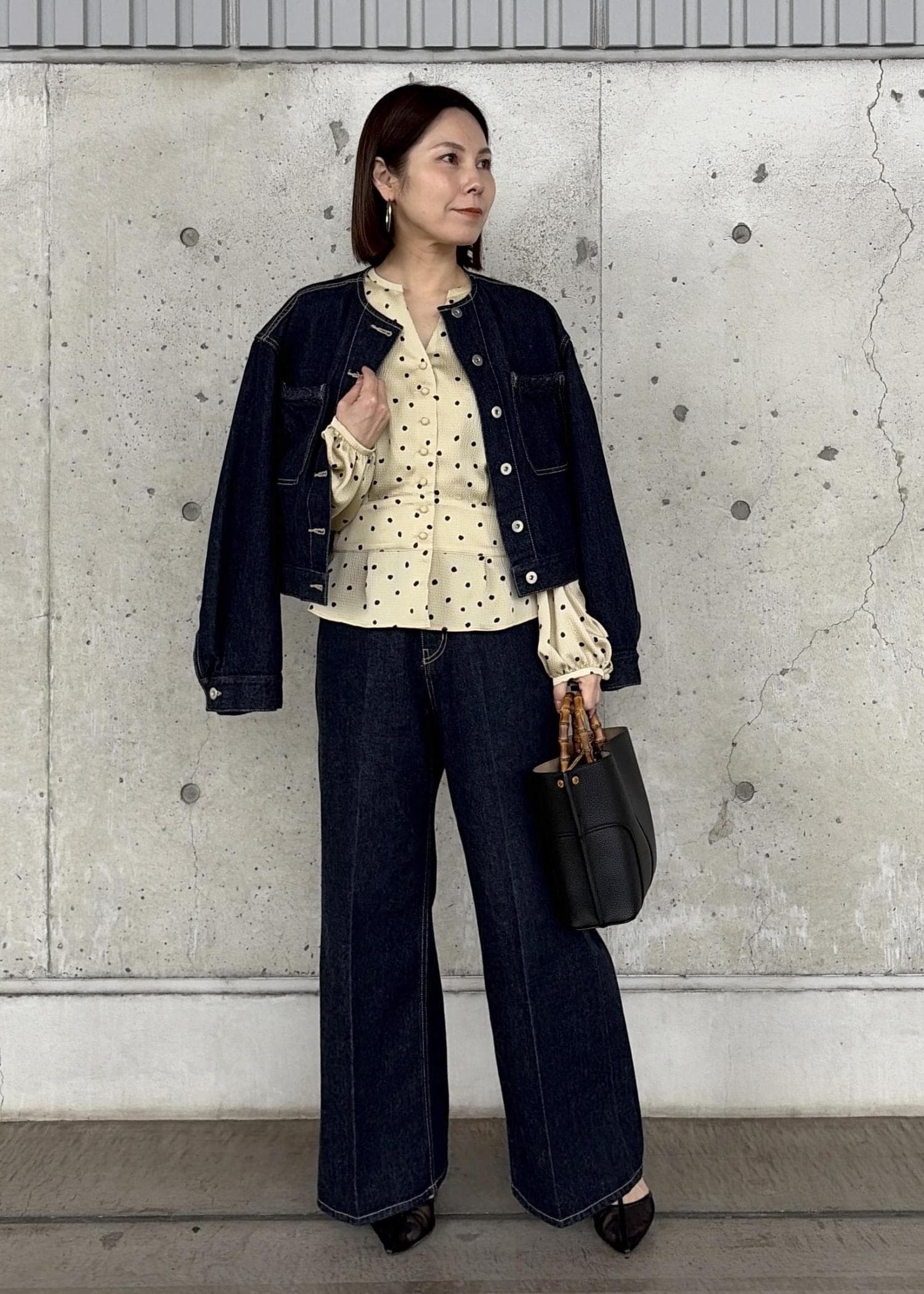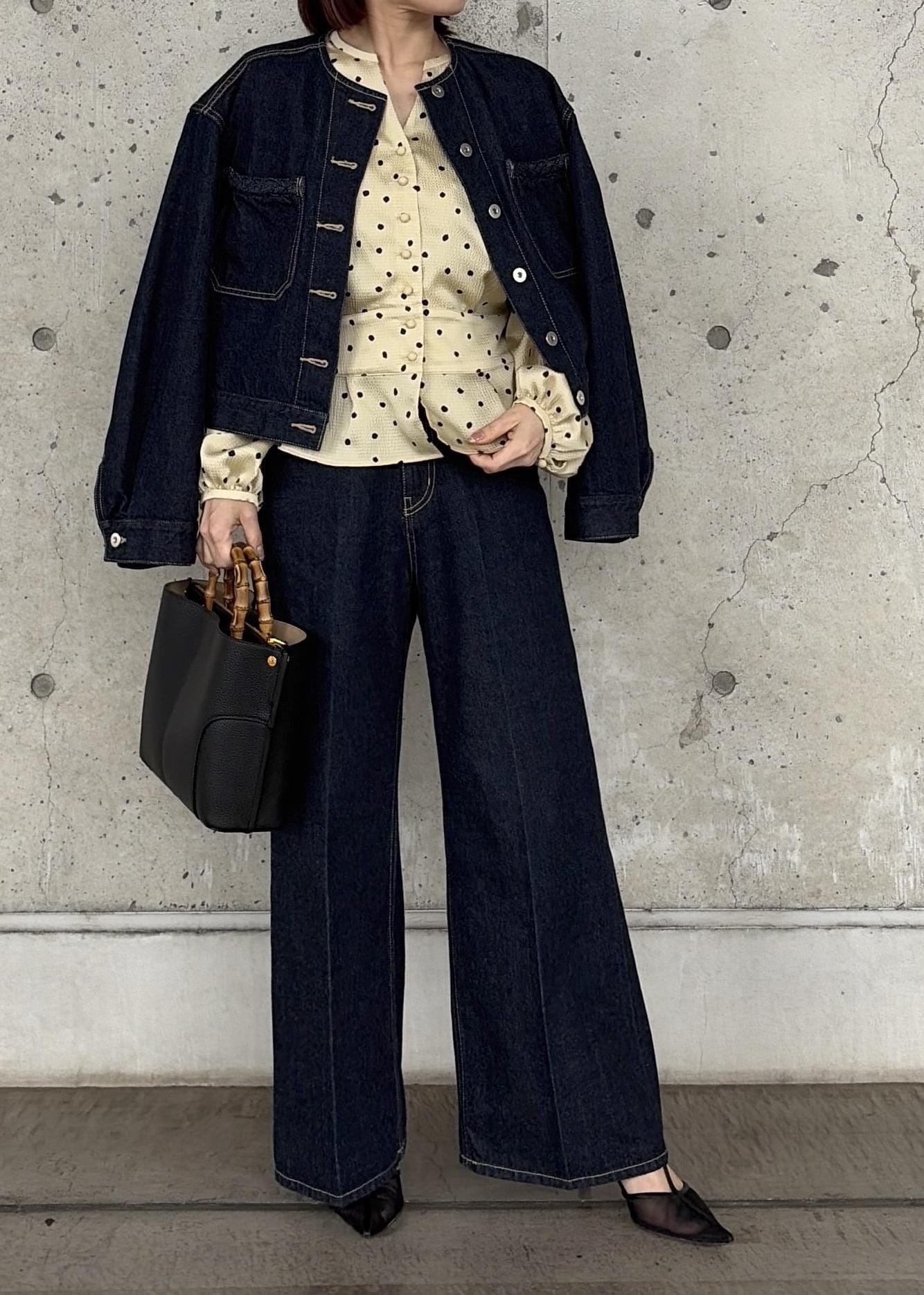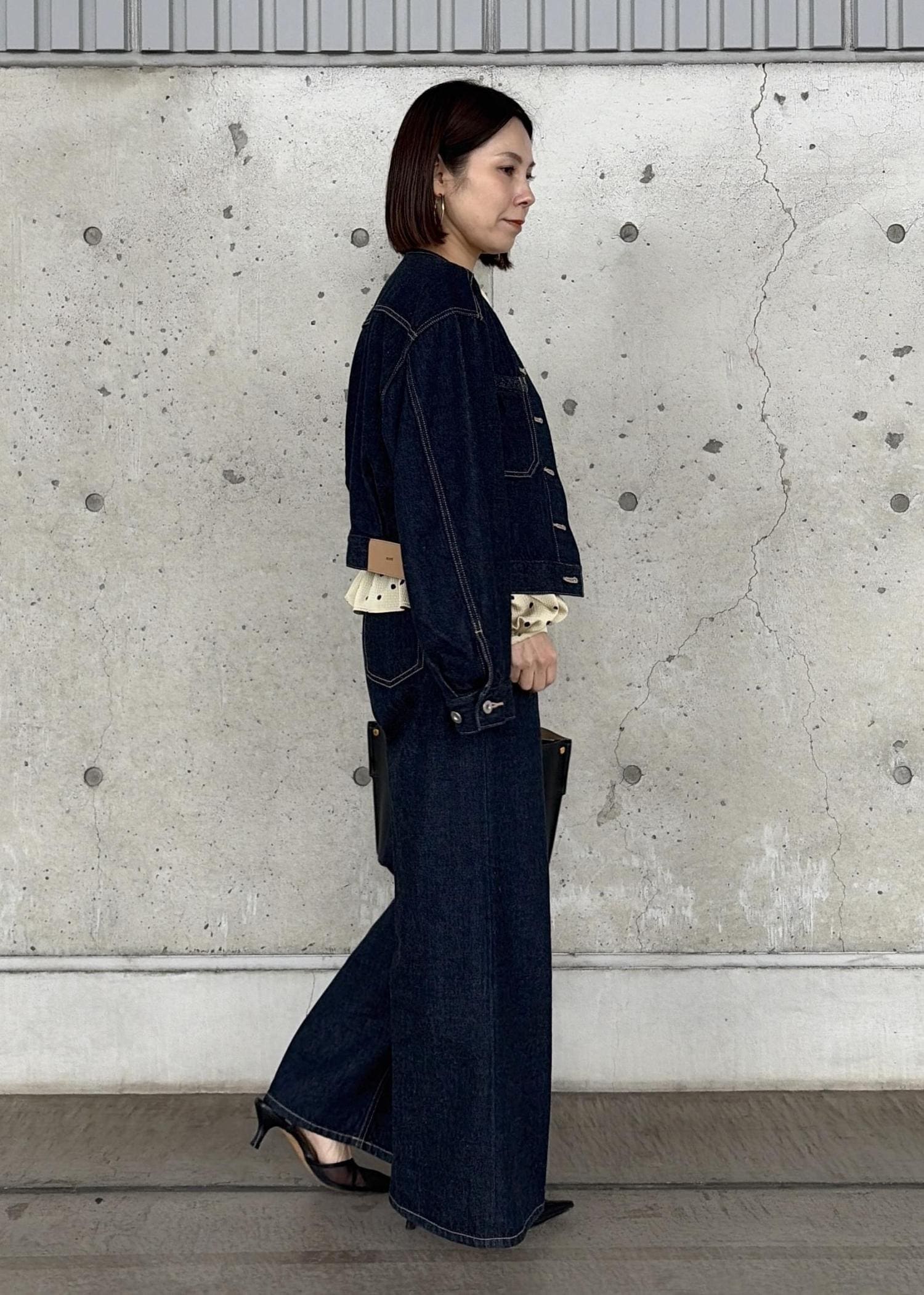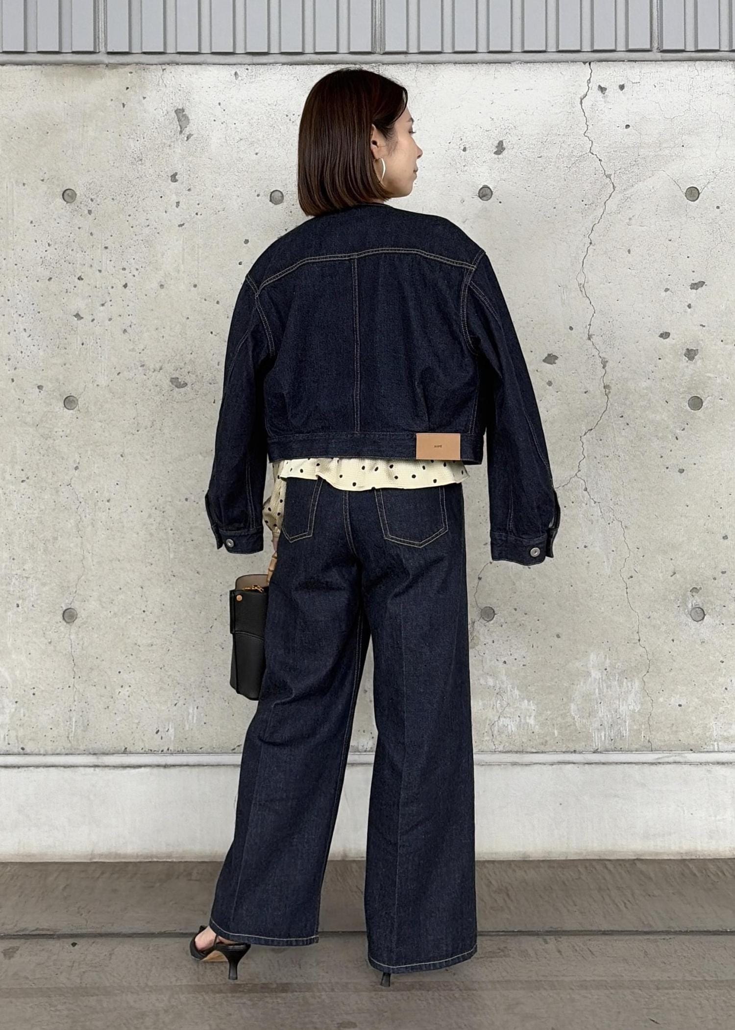 ROPÉノーカラーデニムジャケット(岡山デニム)/セットアップ対応・イージーケアネイビー / F¥39,600レビュー身長156cm、Fサイズ着用。