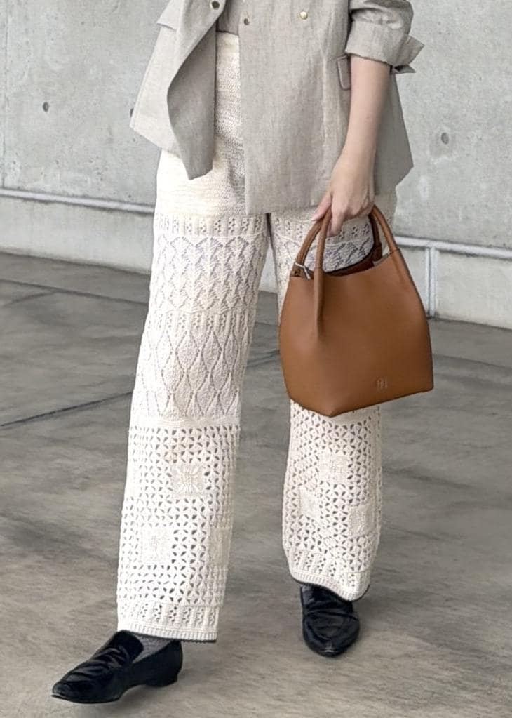 編み柄が涼し気で軽やかな透かし柄のニットパンツです。