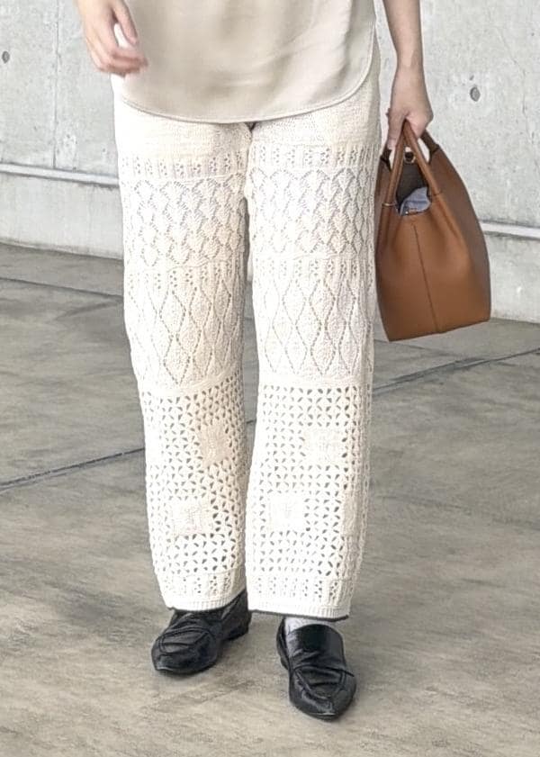 編み柄が涼し気で軽やかな透かし柄のニットパンツです。