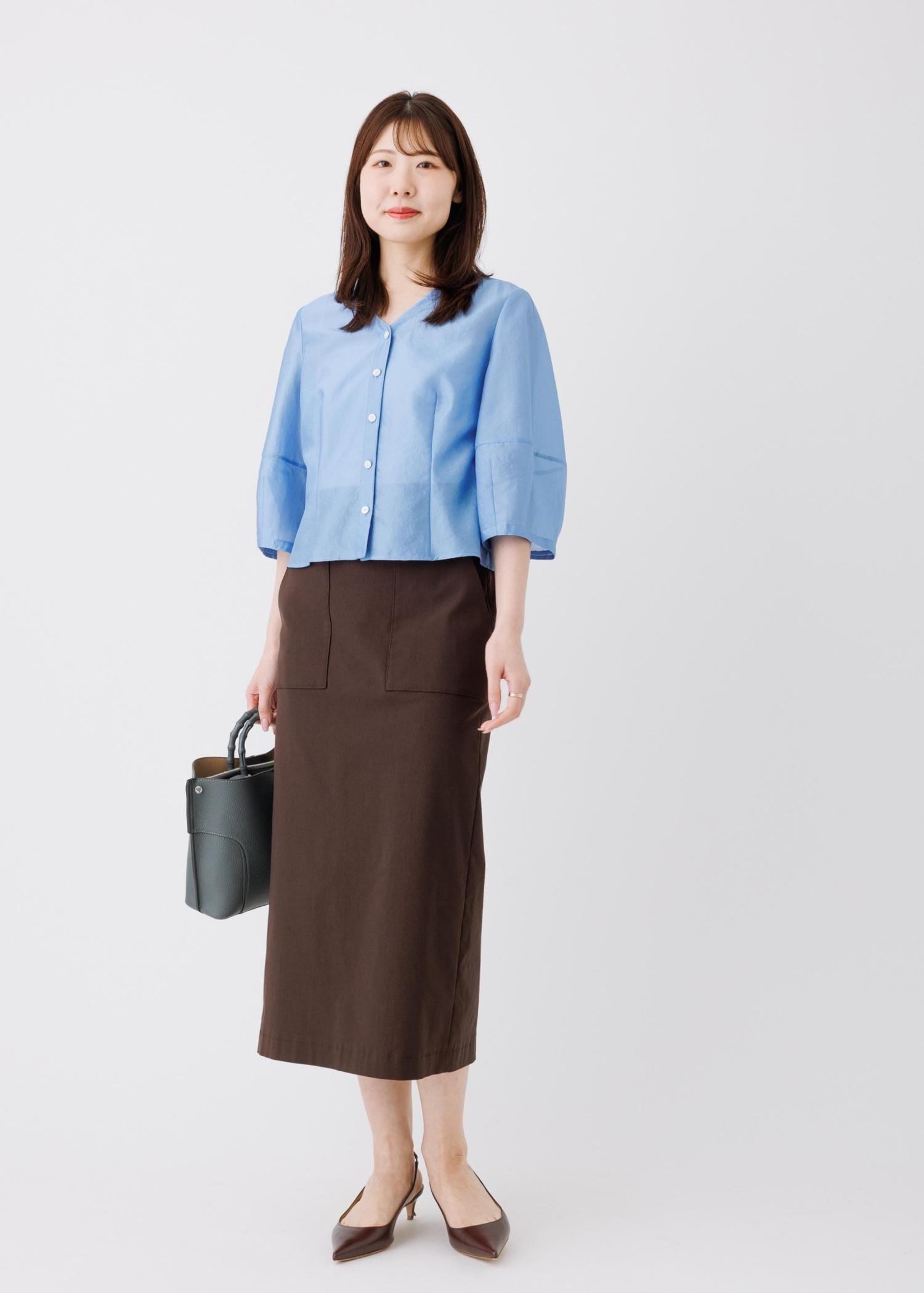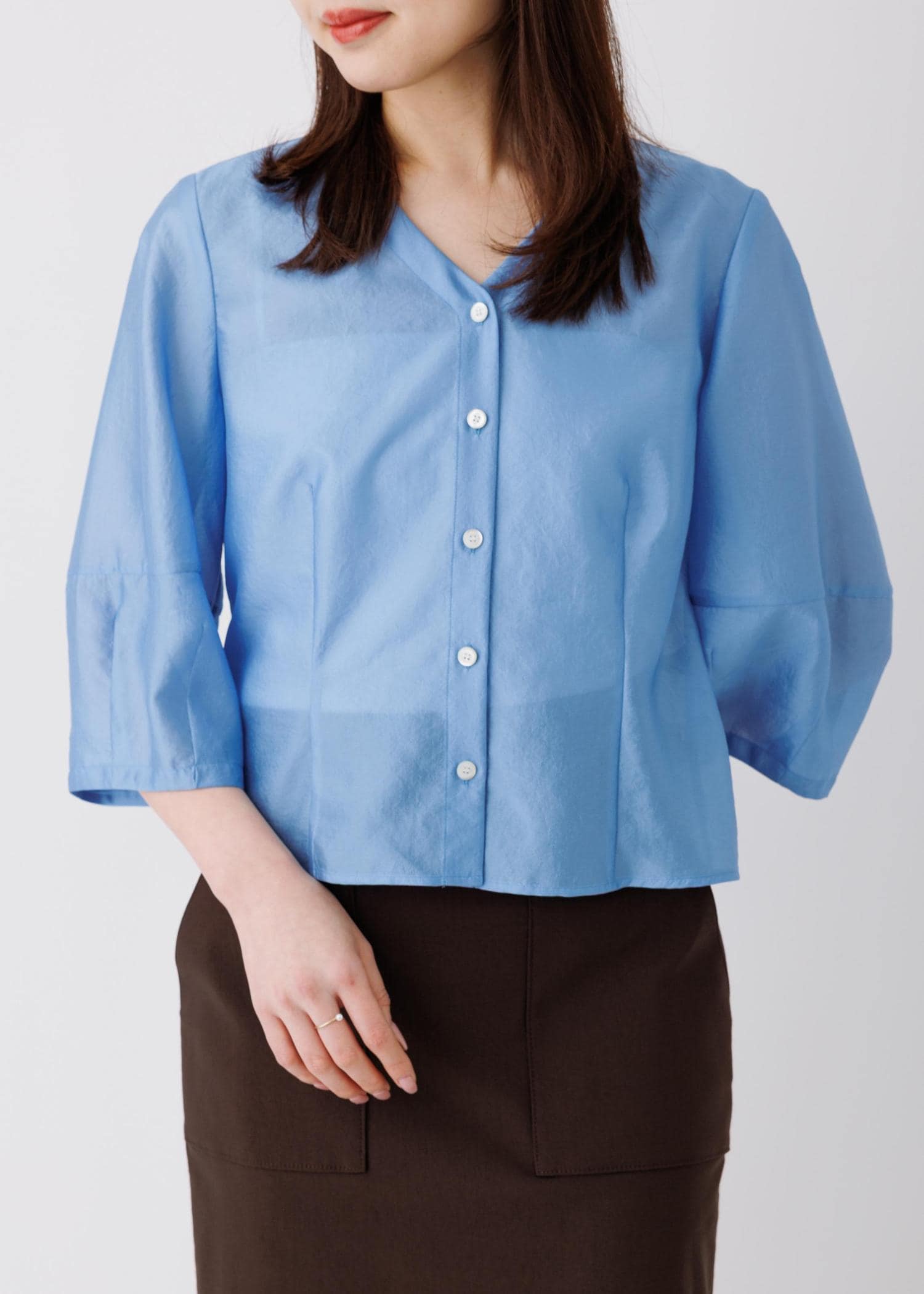 予約ROPÉランタンスリーブシルクライクブラウス/イージーケアブルー / F¥23,100レビューFサイズですが、ビッグシルエットにはならず、比較的スッキリとしたシルエットで着用いただけます。