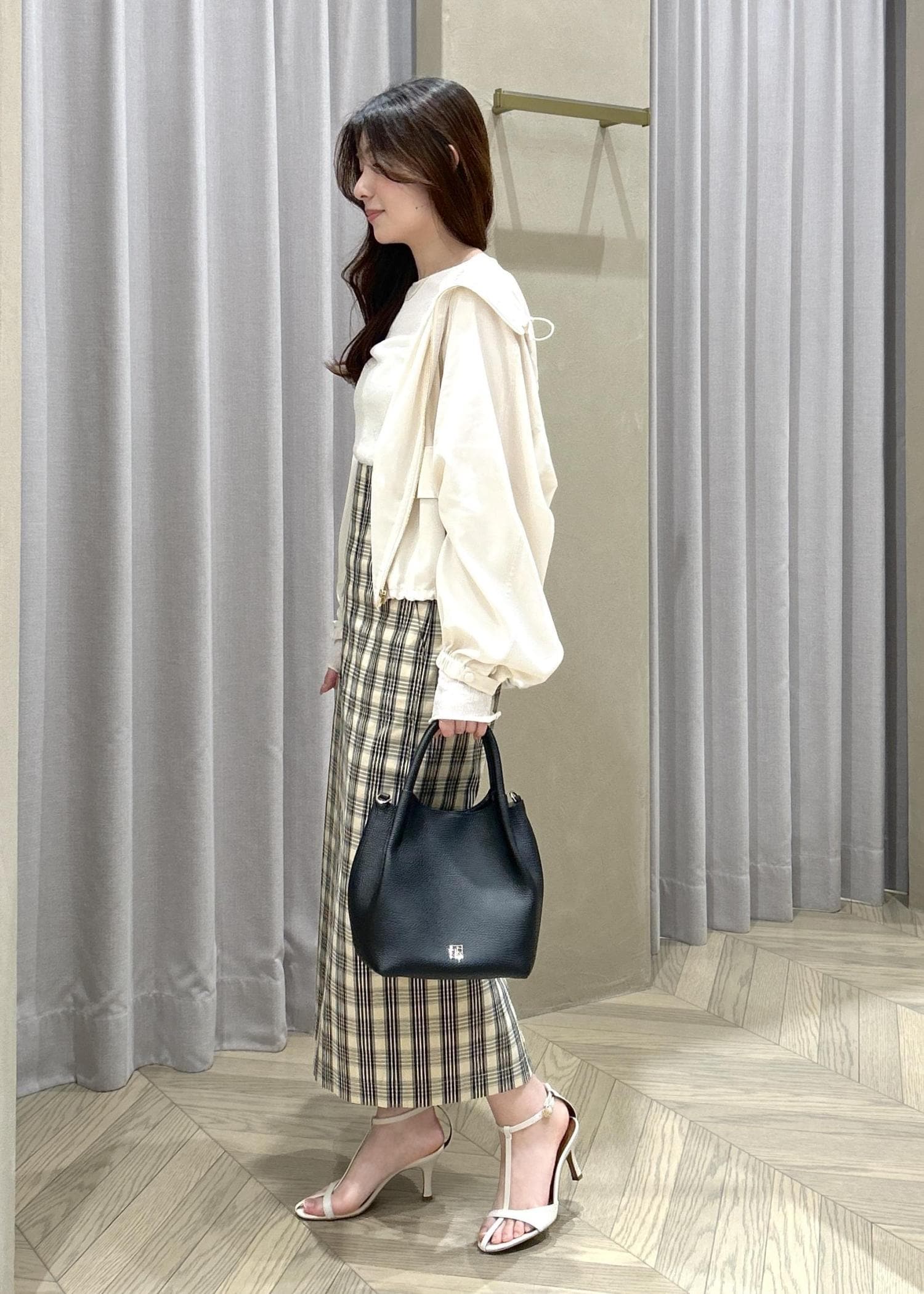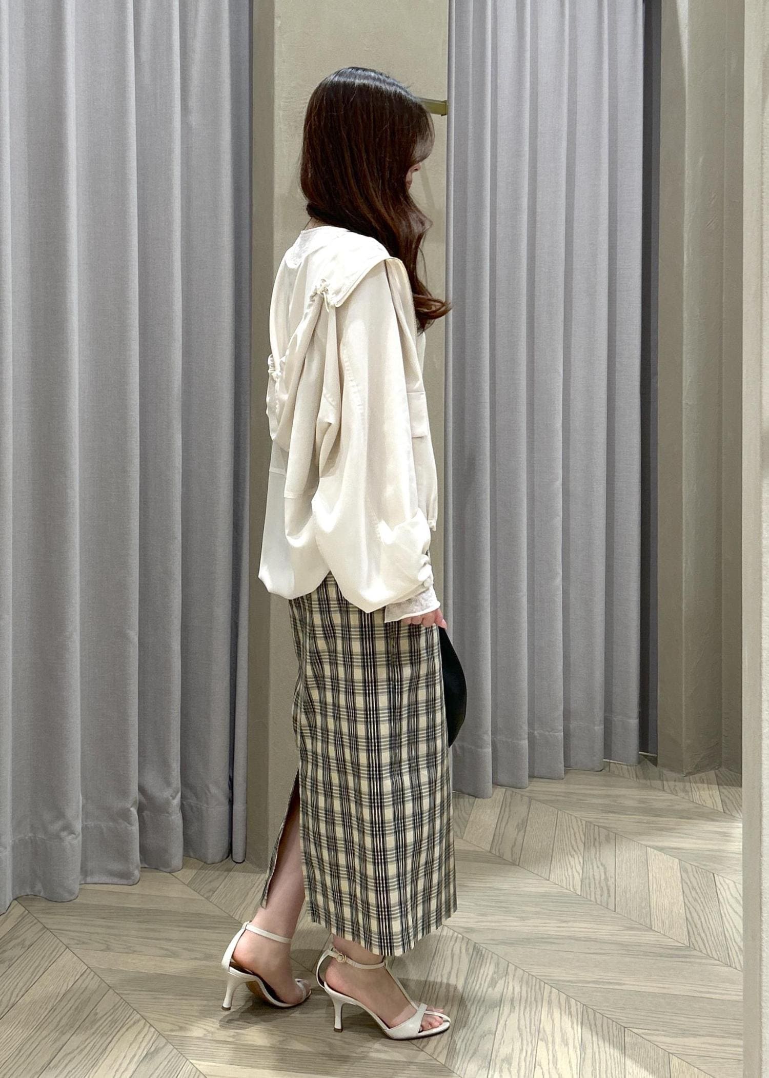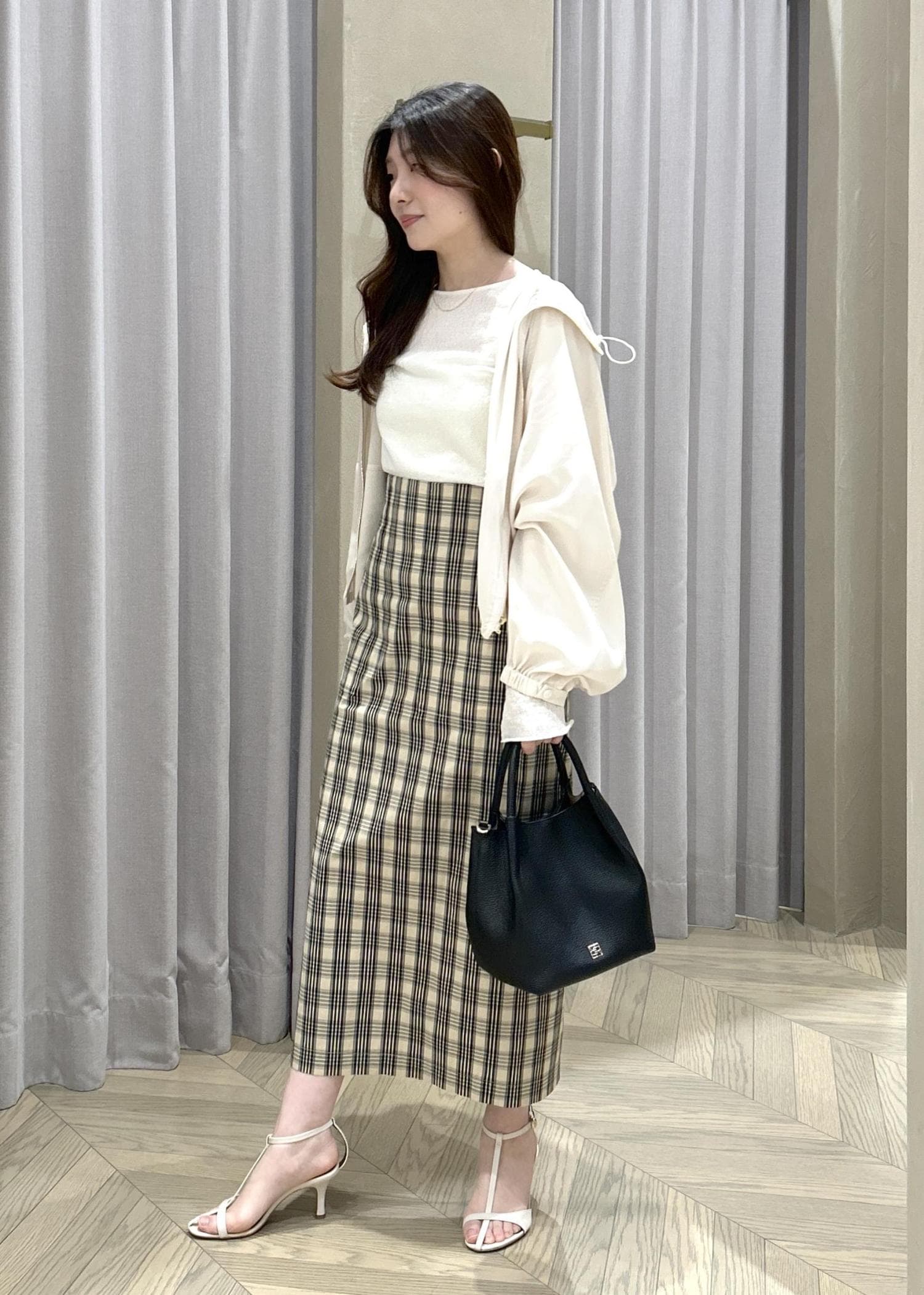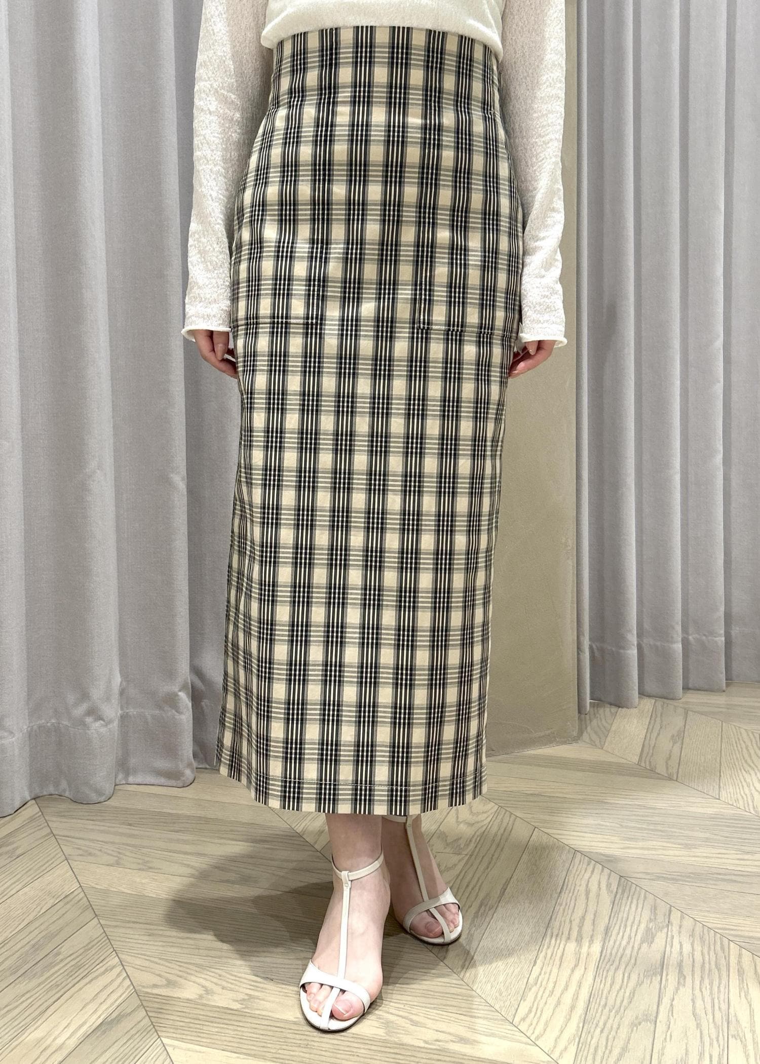 ROPÉ[美人スカート]【DEVEAUX(デヴォー)】別注ハイストレッチチェックポケット付きタイトスカート/イージーケア/26SSベージュ / 36¥29,700レビュー身長151㎝36サイズ着用で、ふくらはぎが隠れるくらいの丈感です。