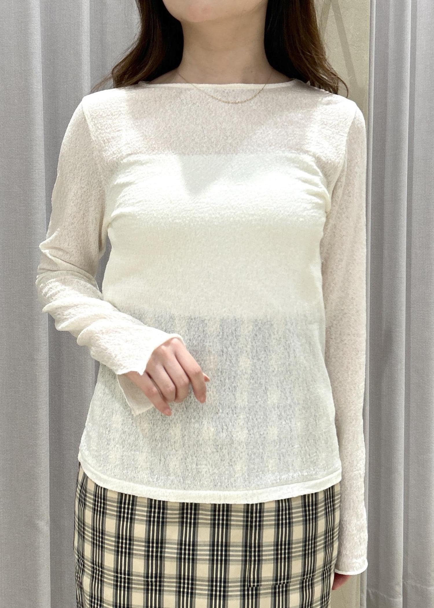 ROPÉコットンシアーロングスリーブカットソー/イージーケアホワイト / F¥16,500レビュー腰骨が隠れるくらいの丈感で、袖丈は手が半分隠れるくらいの長さです。