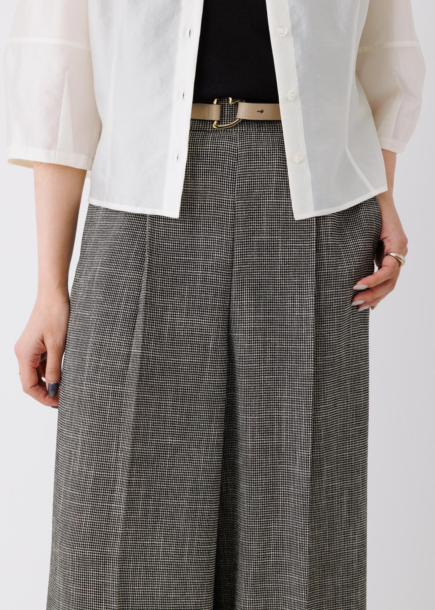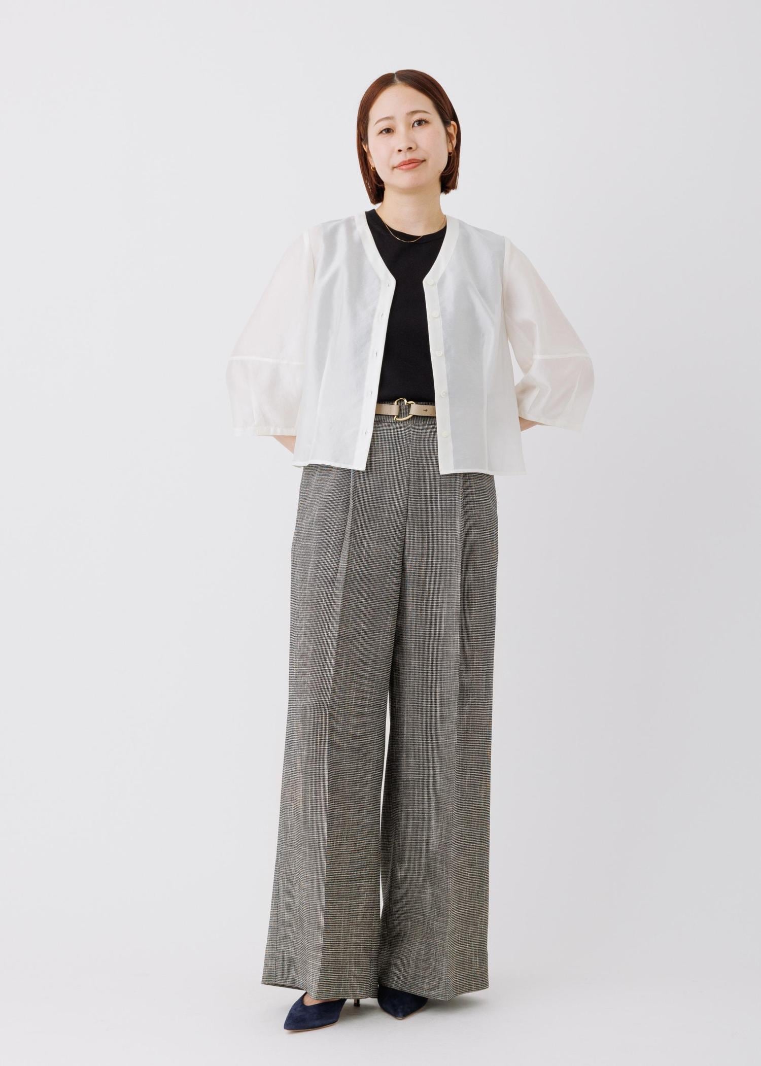 コンパクトな着丈のブラウスとワイドパンツを合わせた王道オフィスカジュアルコーデ。