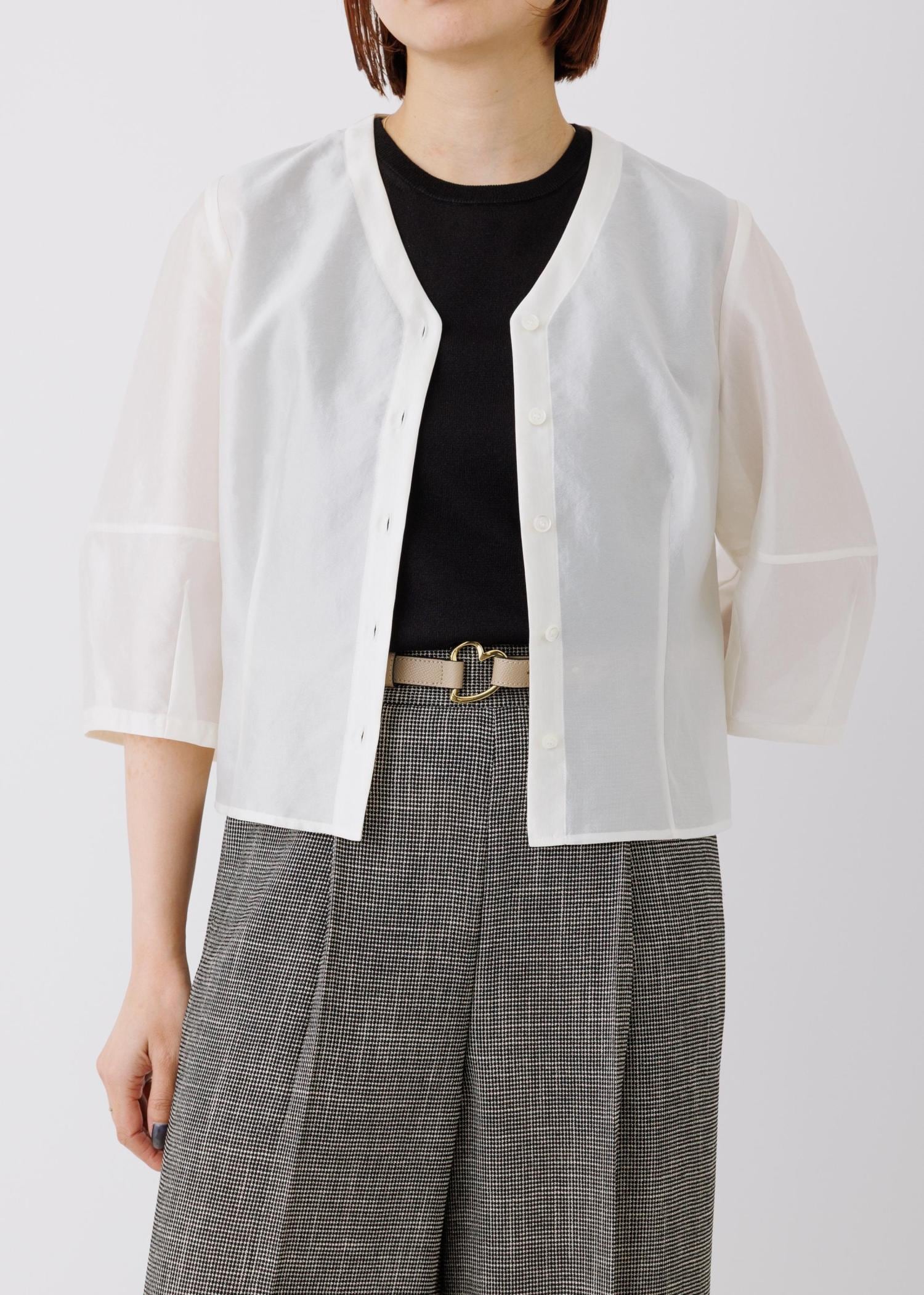 1枚着で着る際は着丈がコンパクトなのでトップスインしなくてもスッキリ見えるブラウスです。