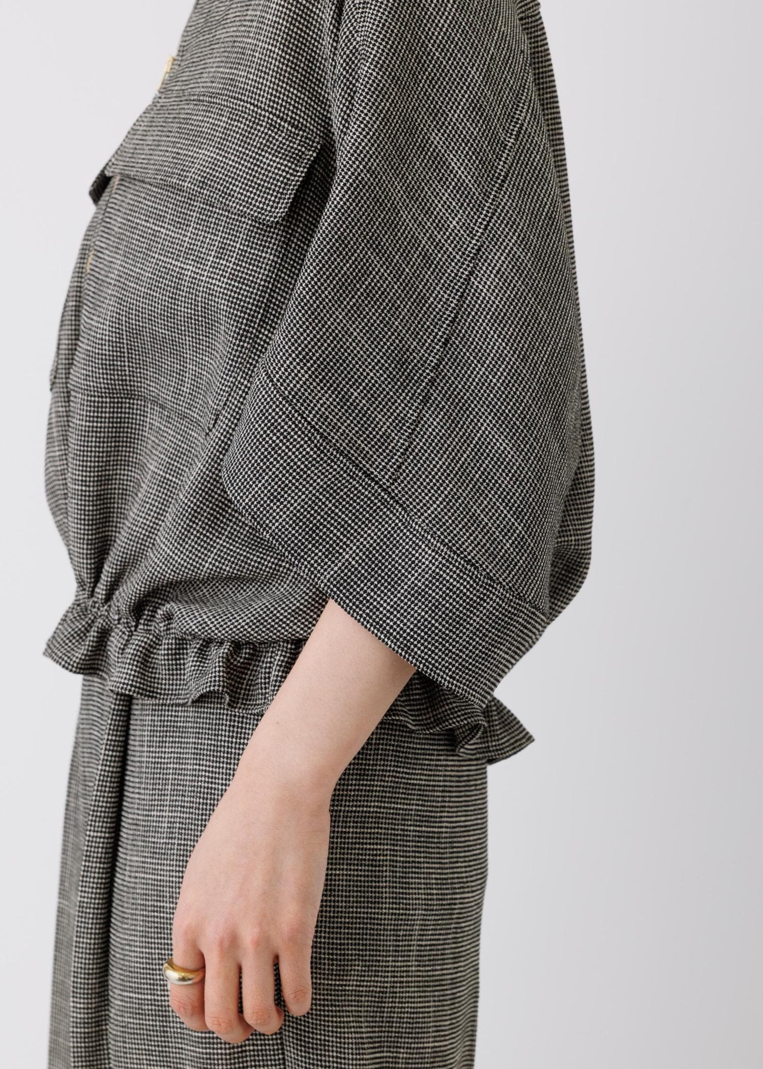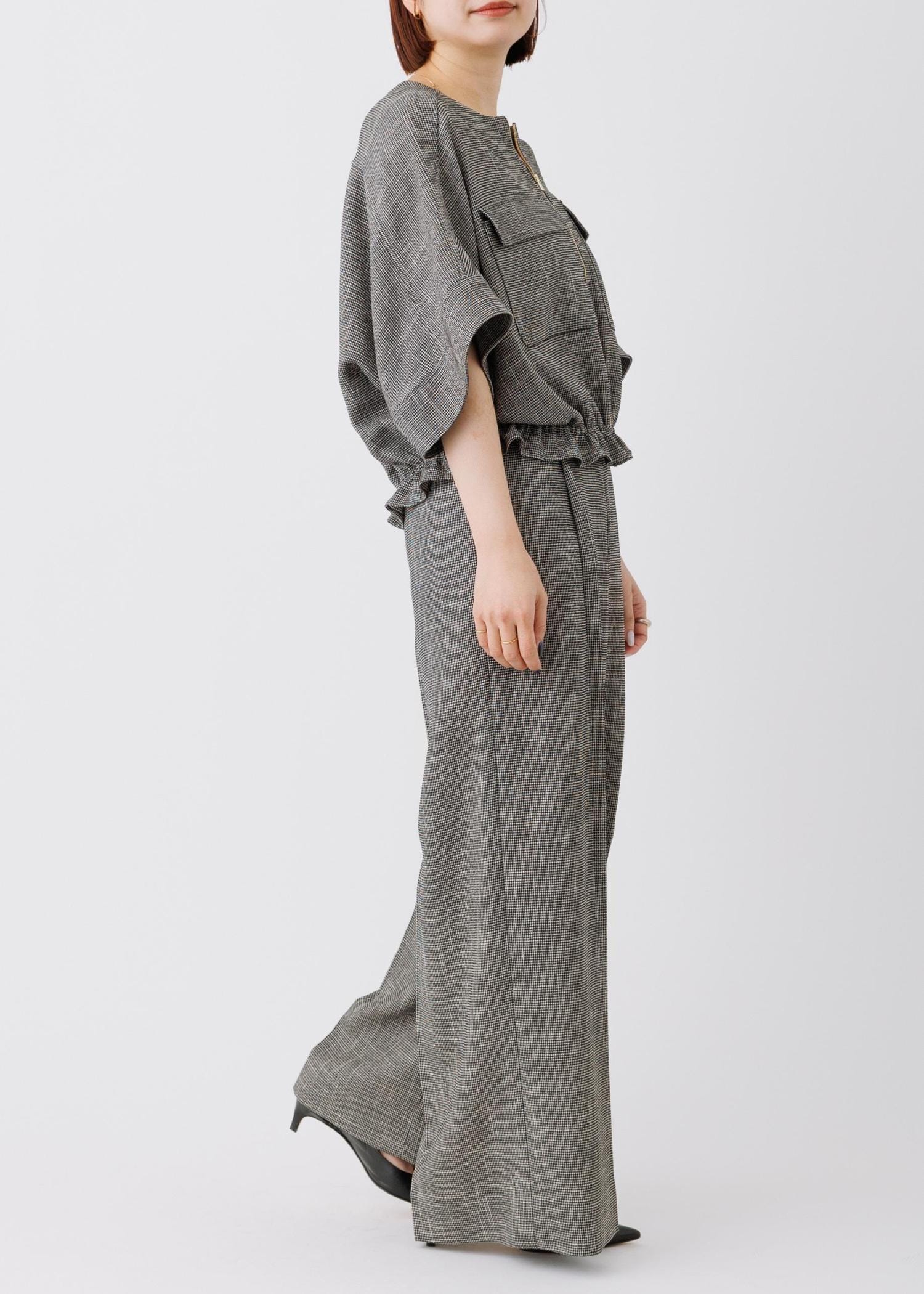 着丈は少しコンパクトで腰骨にかかるほどなのでワイドパンツ合わせがおすすめです。