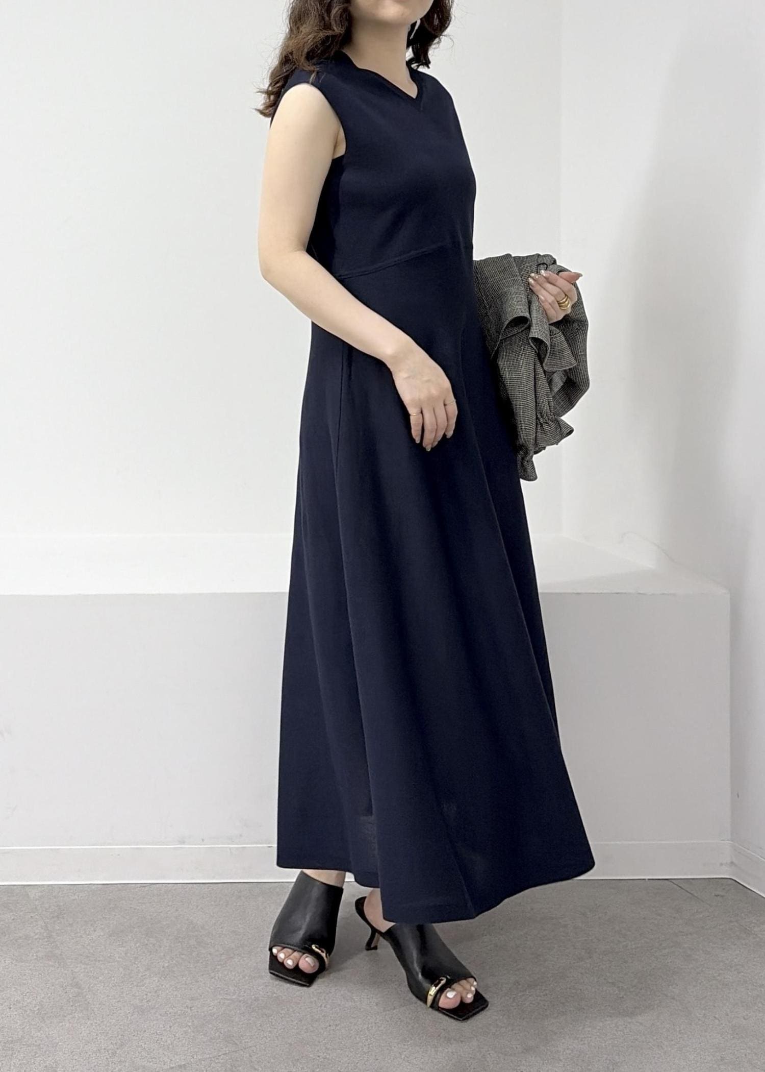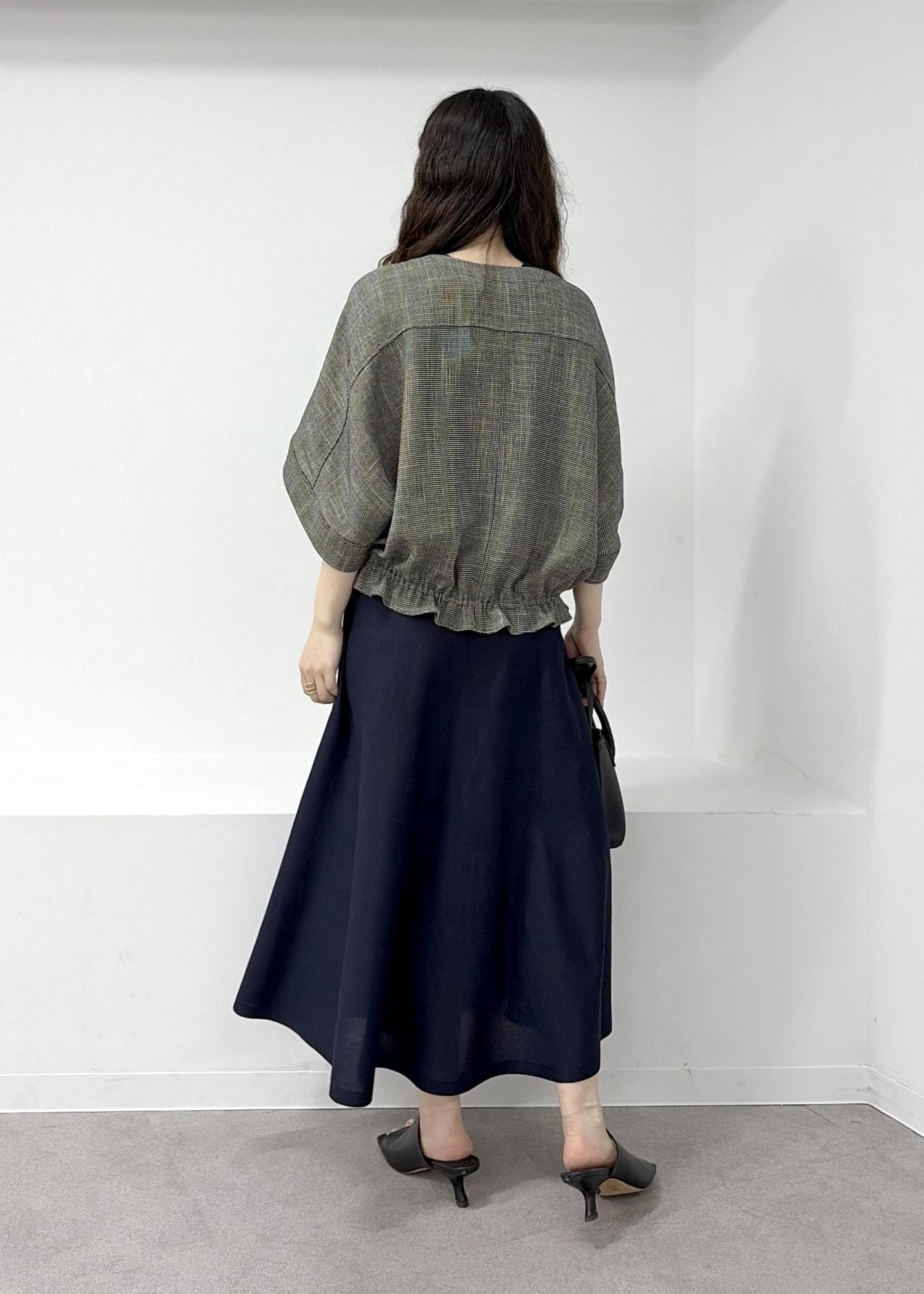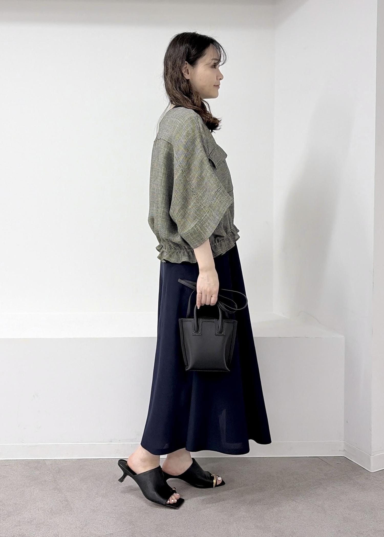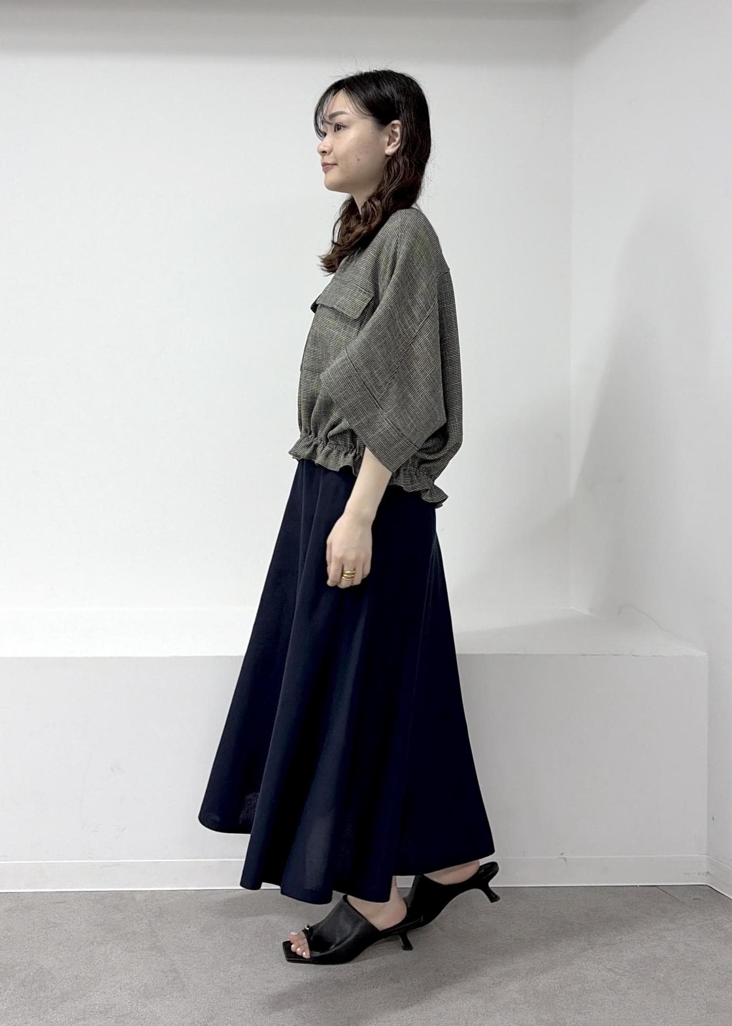 着丈はふくらはぎ真ん中より下あたり。上半身は程よいフィット感があり、高めのウエスト位置からAラインに広がるシルエットなのでお腹周りは気になりませんでした◎