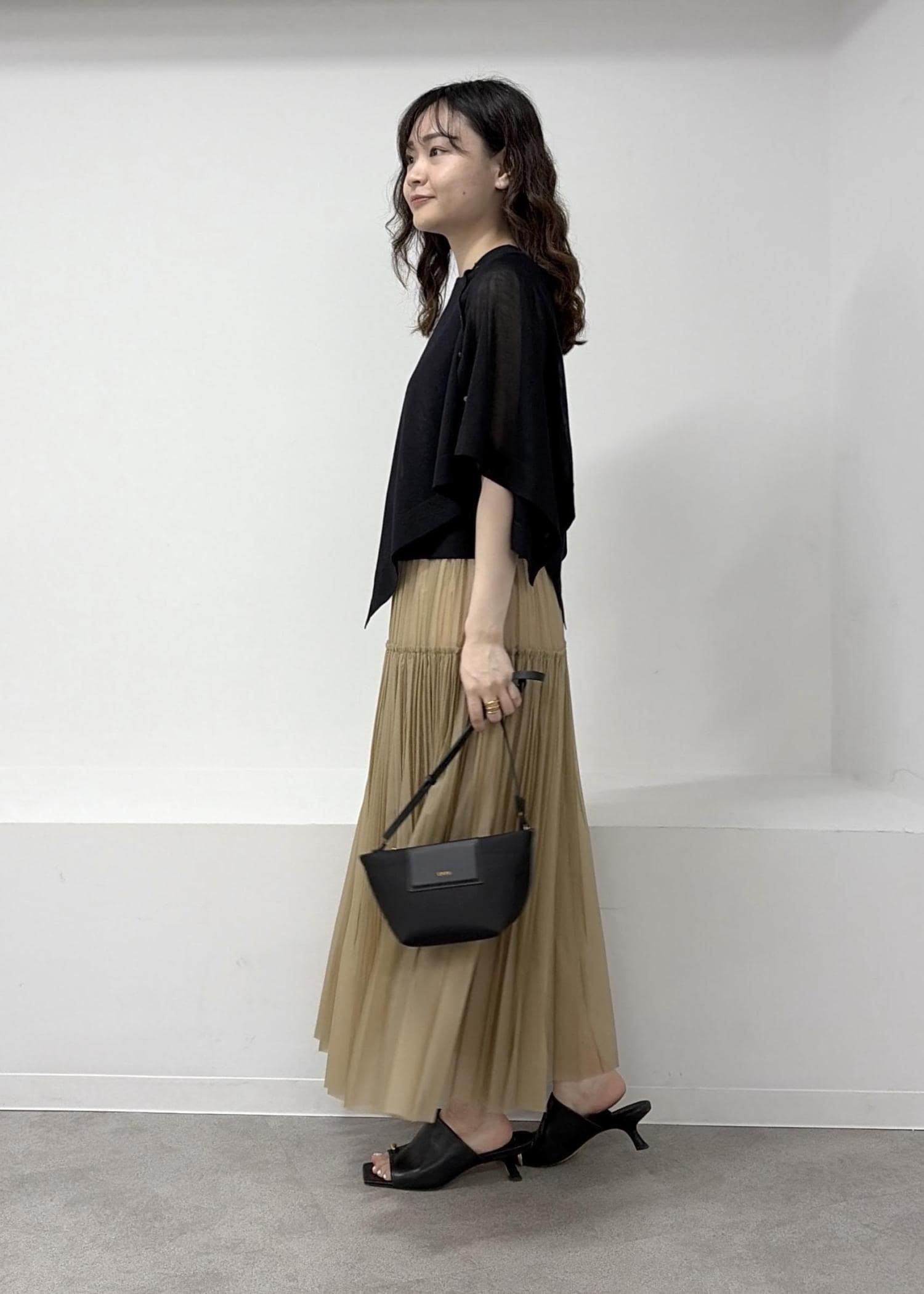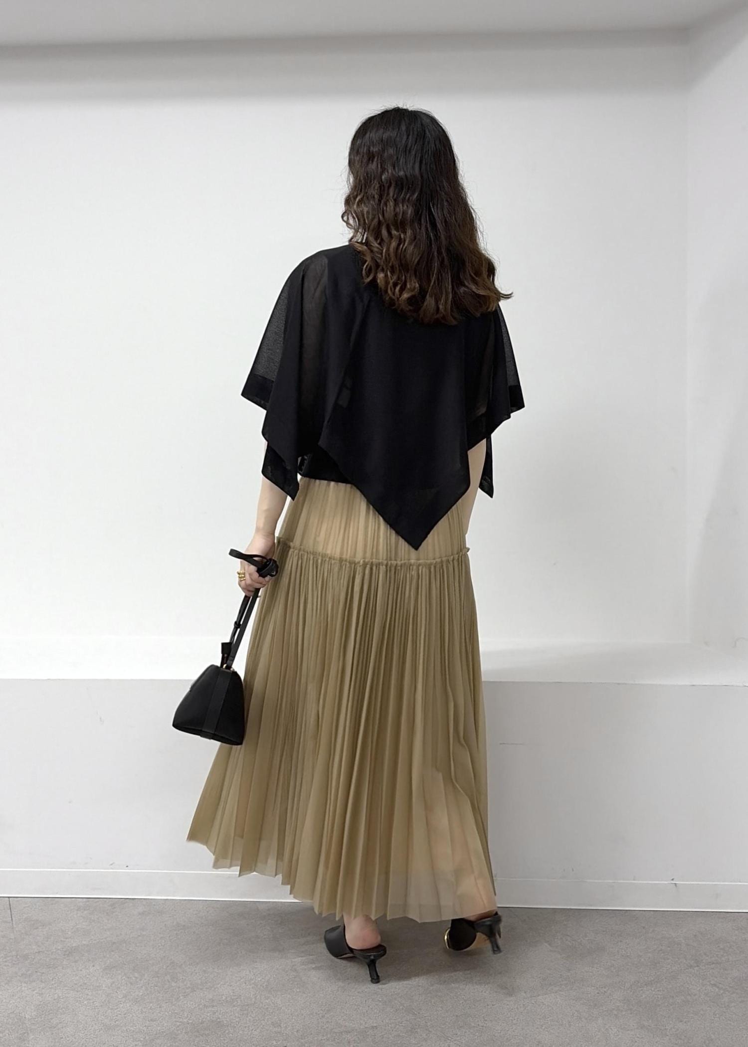 ブラックのケープトップスと