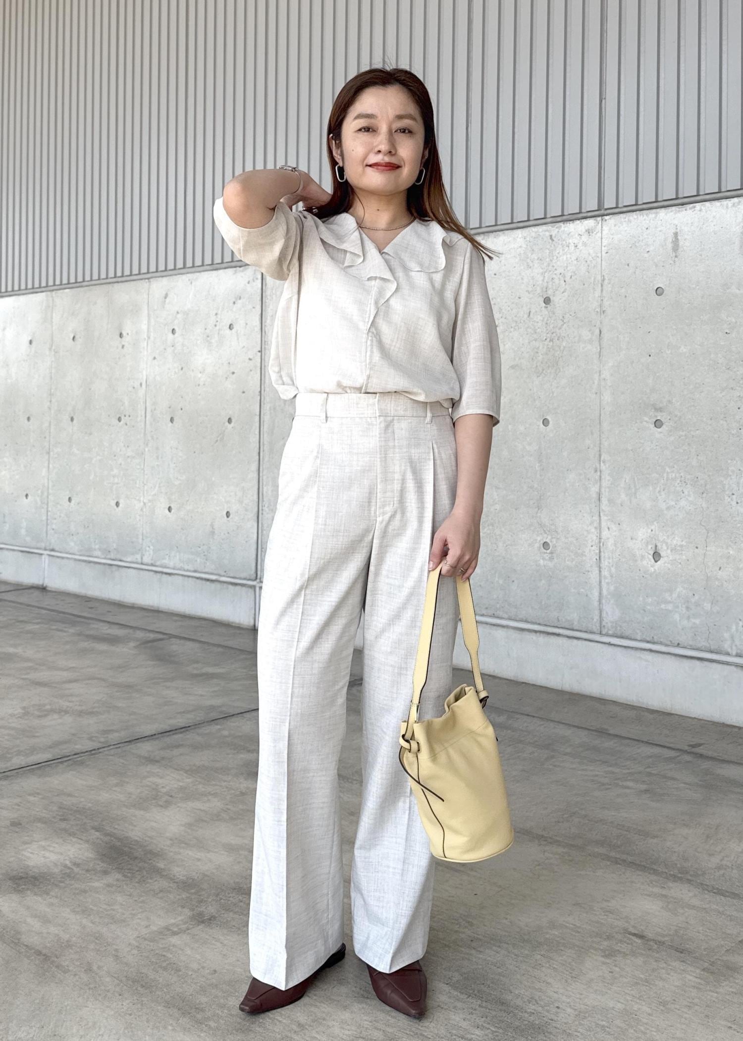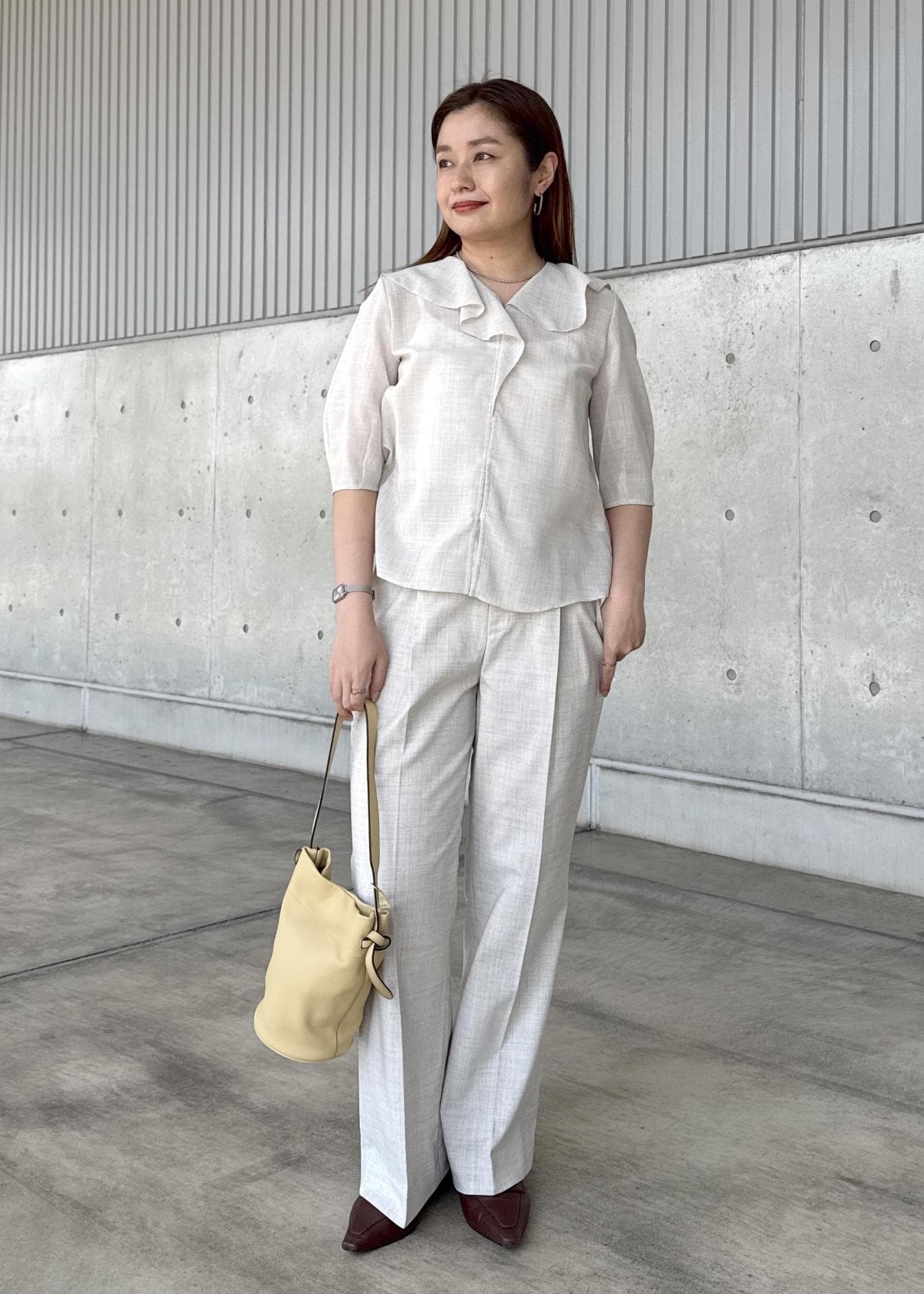 ROPÉリネンライクセミフレアパンツ/セットアップ対応・イージーケアベージュ / 38¥19,800レビュー膝当たりが少しシェイプしているフレアラインです。