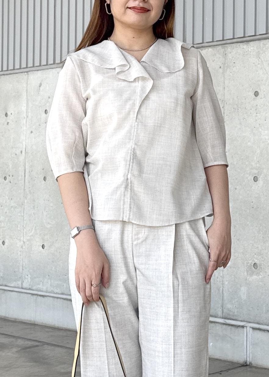 ROPÉリネンライクフリルカラーブラウス/セットアップ対応・イージーケアベージュ / 38¥19,800レビューほんのり透け感のある、リネンライクの素材です。インナーを白にしていただくと透け感は気にならなかったです。リネン特有なチクチク感がなく、シワになりにくい万能素材です。