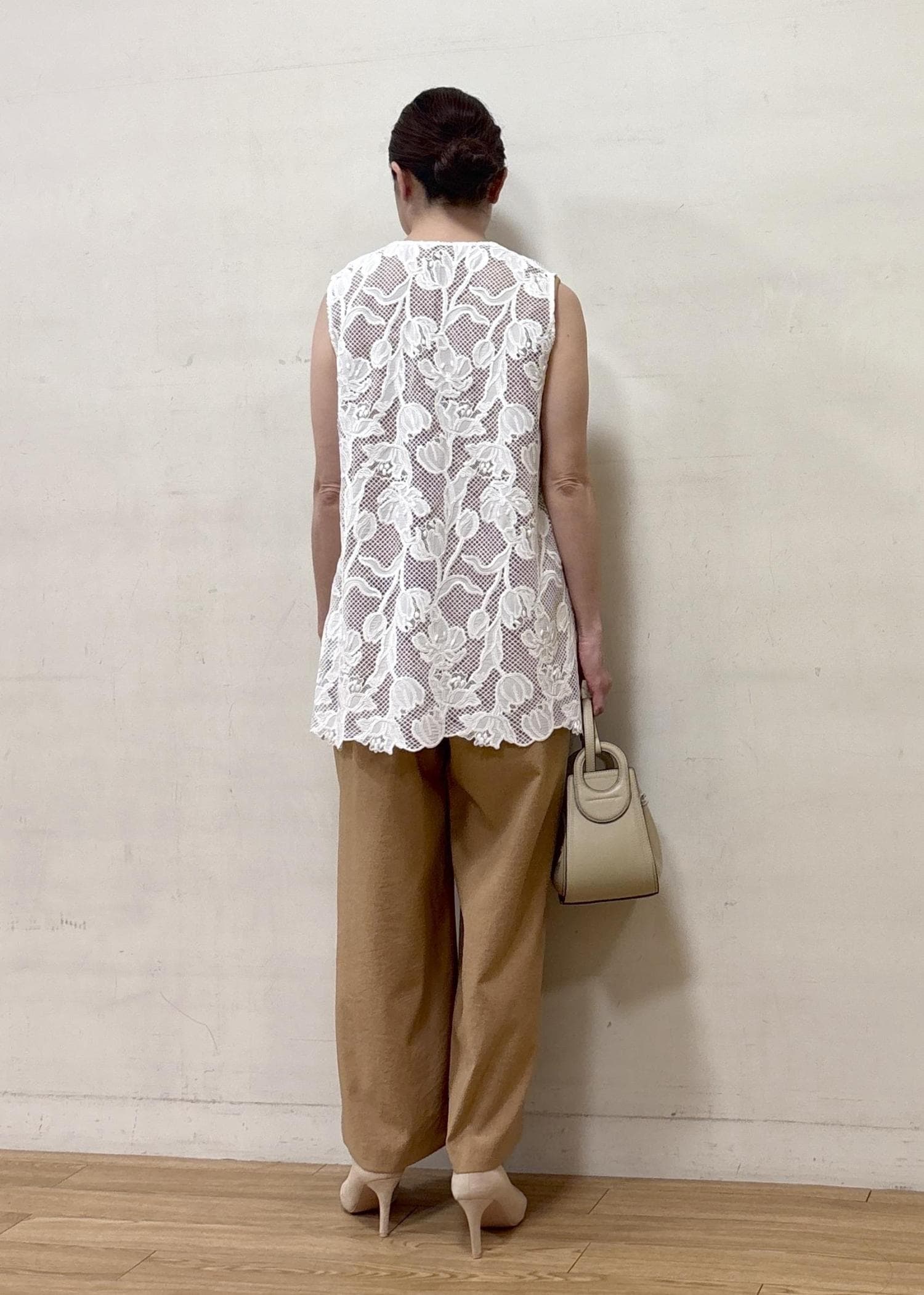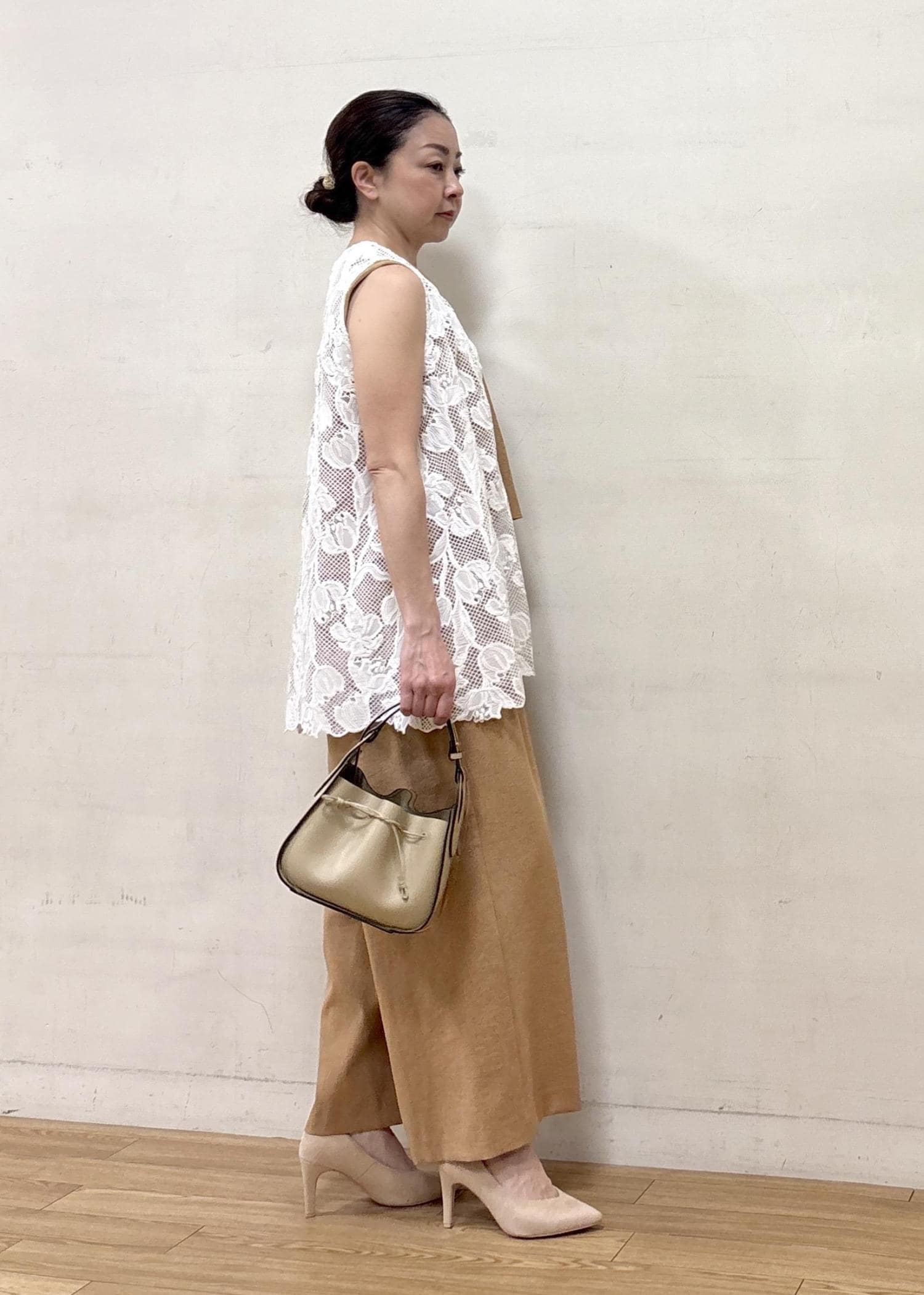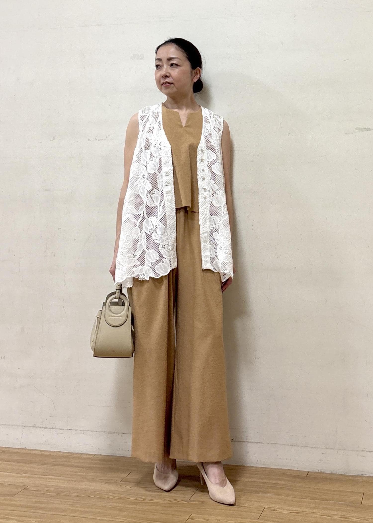 オシャレ感のあるレースのジレを合わせて気分の上がるスタイリングにしました。