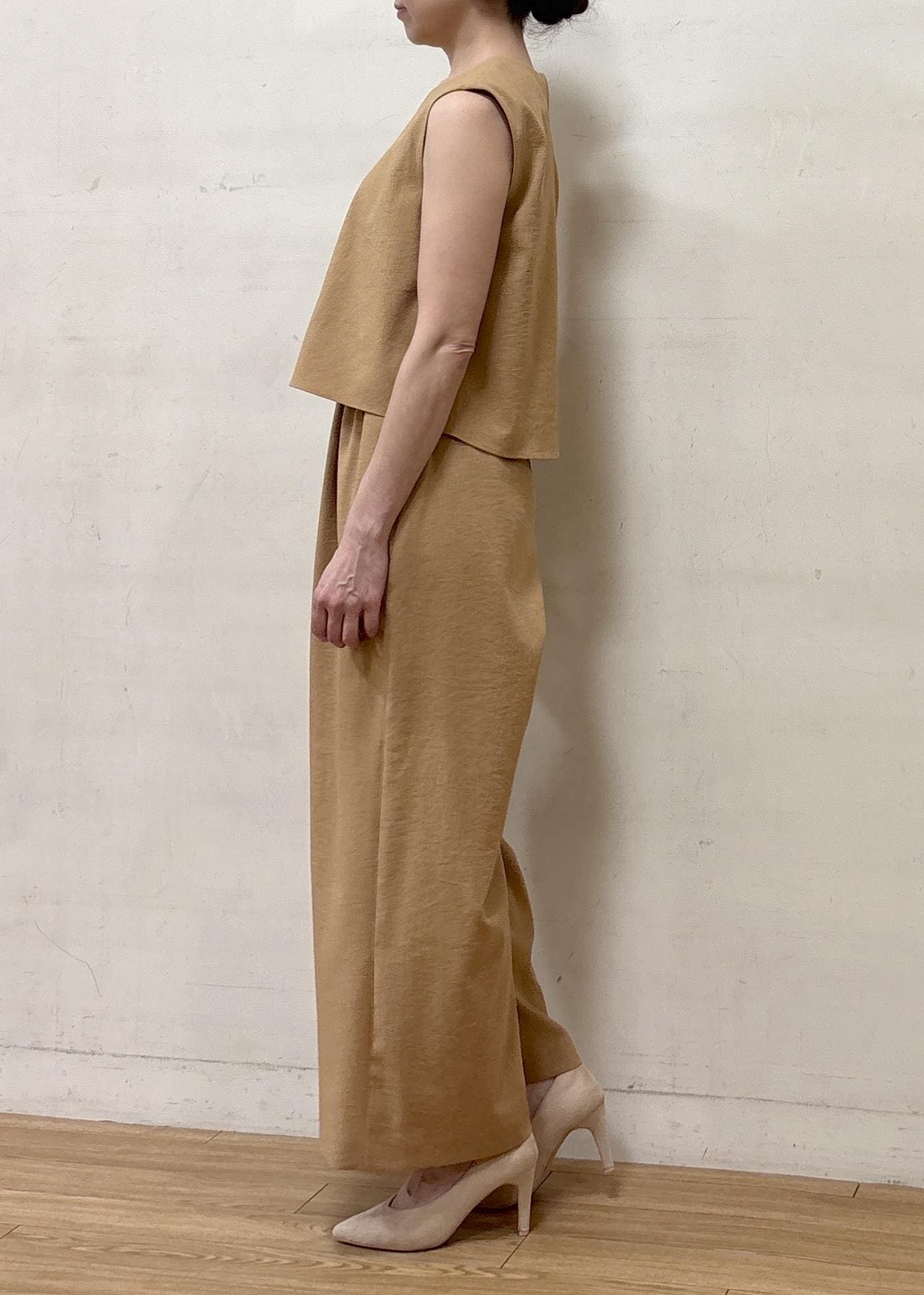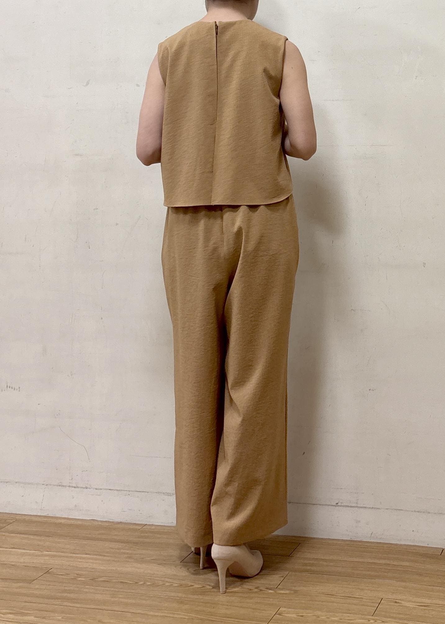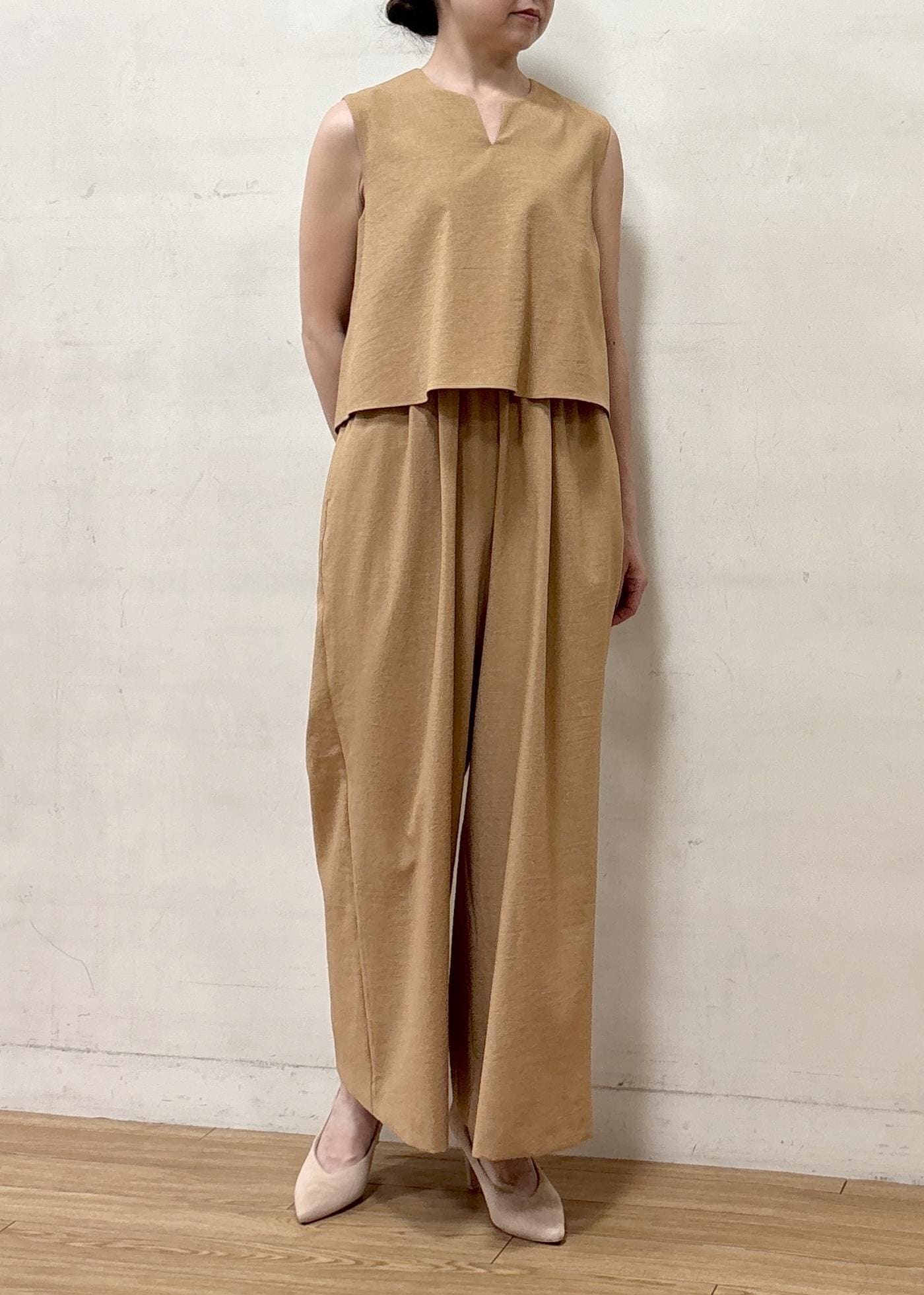 トップス部分のデザインが印象的なオールインワン。目線が上に行き、女性の気になるところを程よくカバーしつつスタイルアップできるので、これからの季節に使いやすいアイテムです。ボトム部分もワイドパンツスタイルなので体のラインを拾わず、ストレスフリーで着用できます。