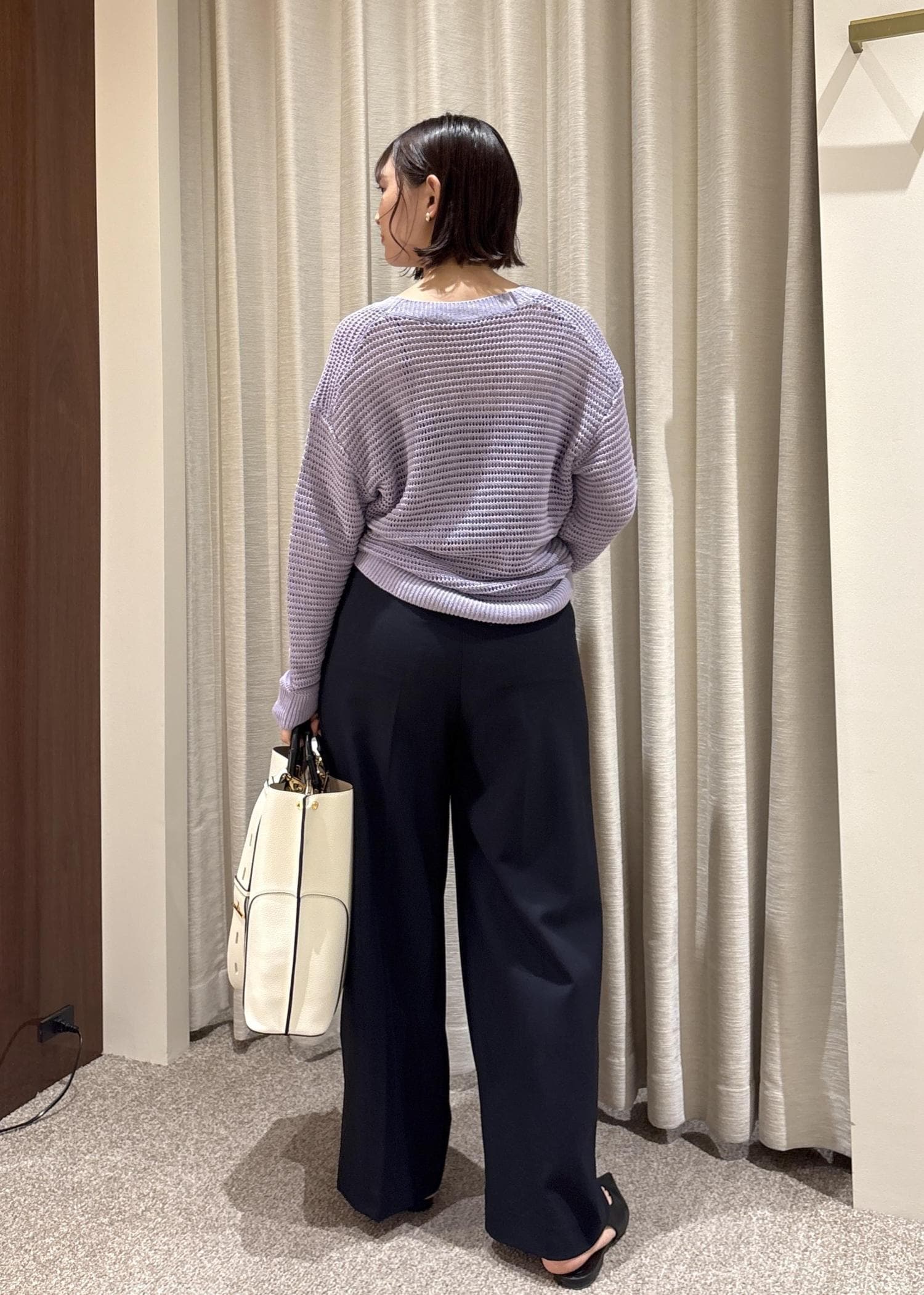 きれいなパープルカラーのニットにシンプルなネイビーの