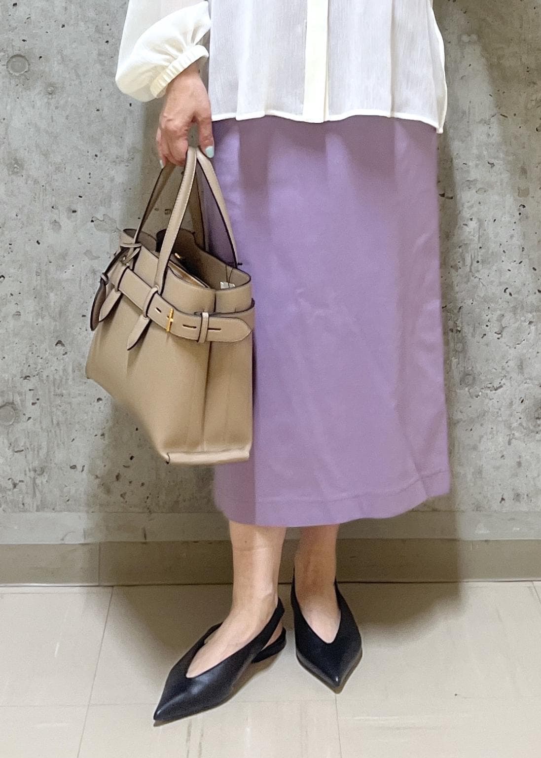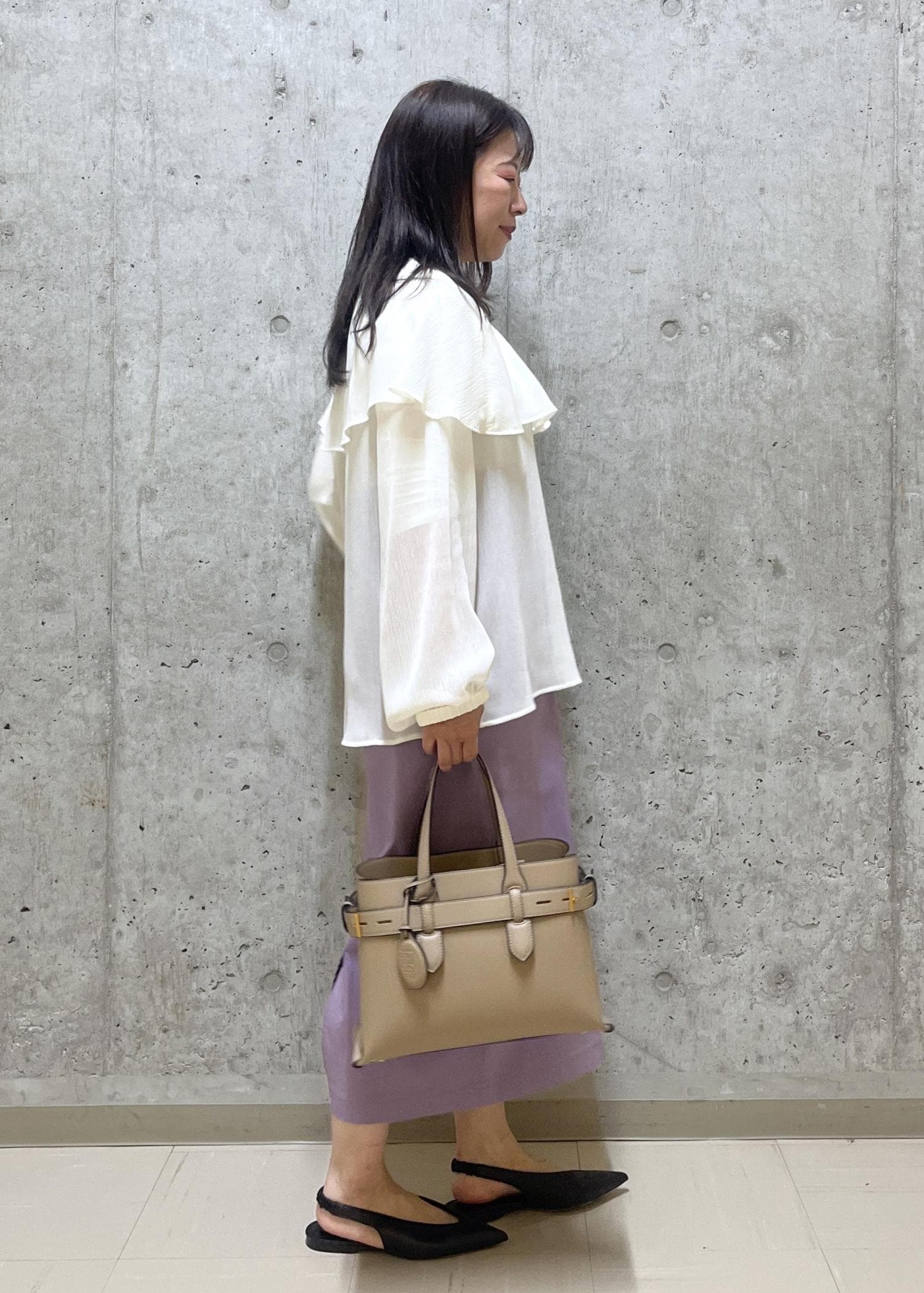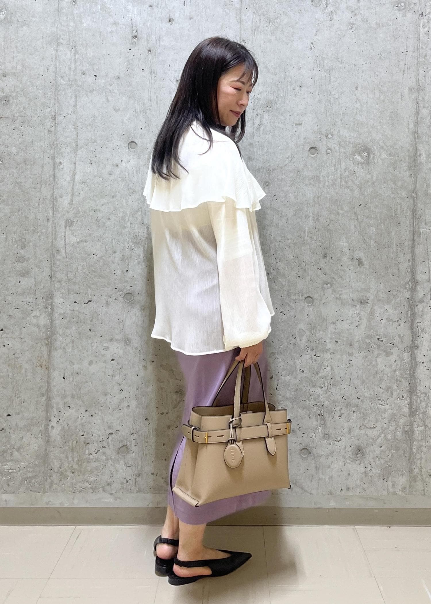 フリルが可愛いブラウスと、タイトで落ち着いた雰囲気のスカートを合わせてフェミニンな感じにしました。