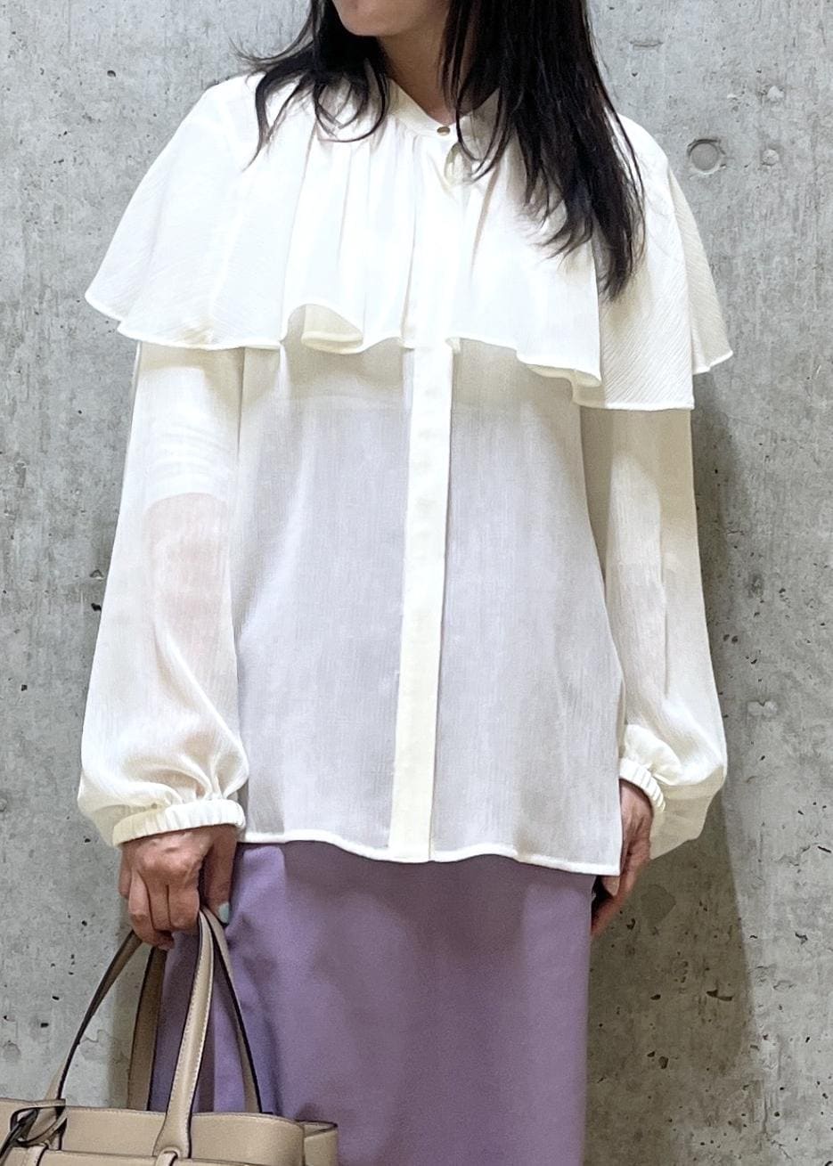 ROPÉ楊柳フリルブラウス/イージーケアオフホワイト / F¥27,500レビューケープを重ねたような襟元とバルーン袖が華やかなブラウスです。