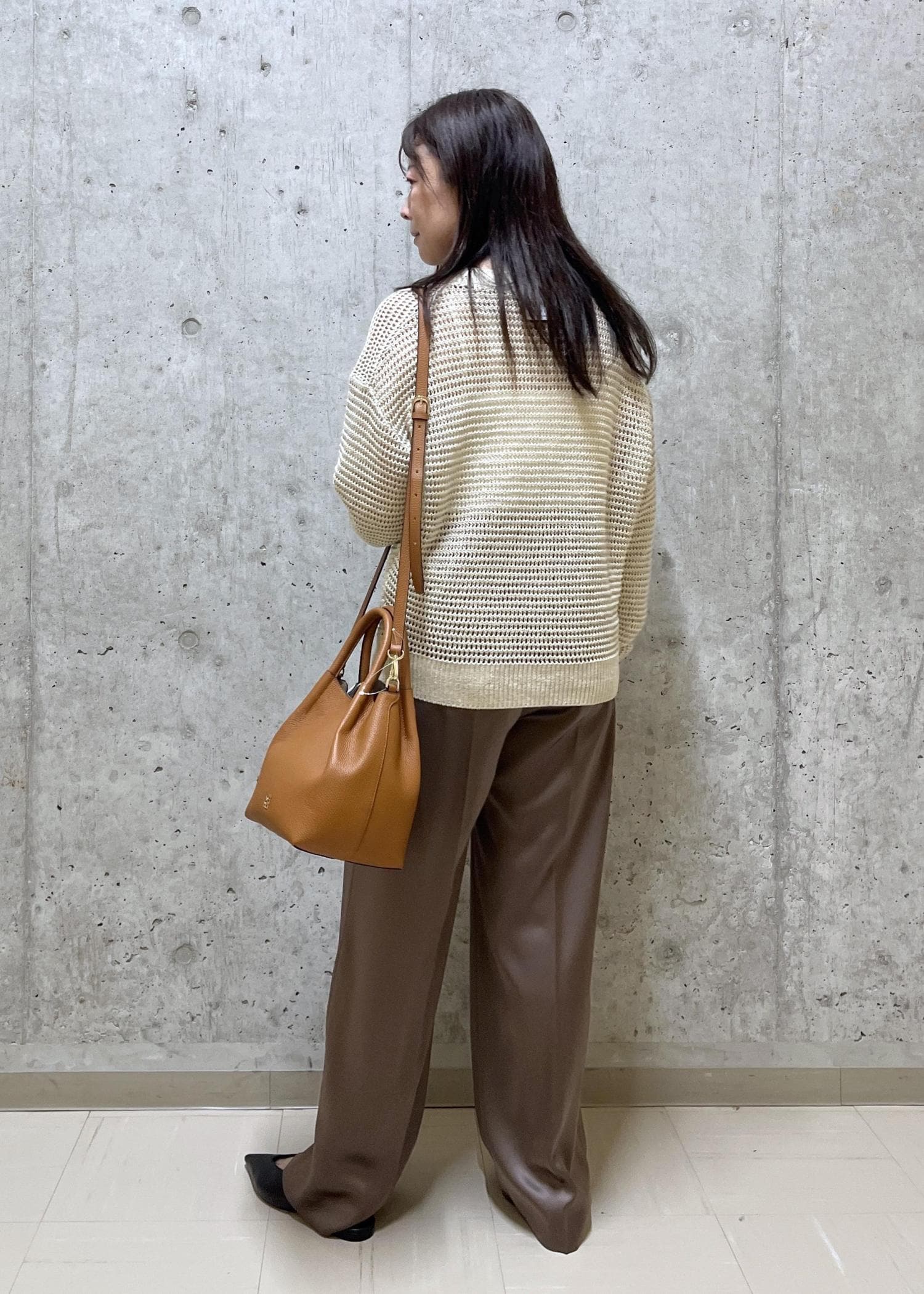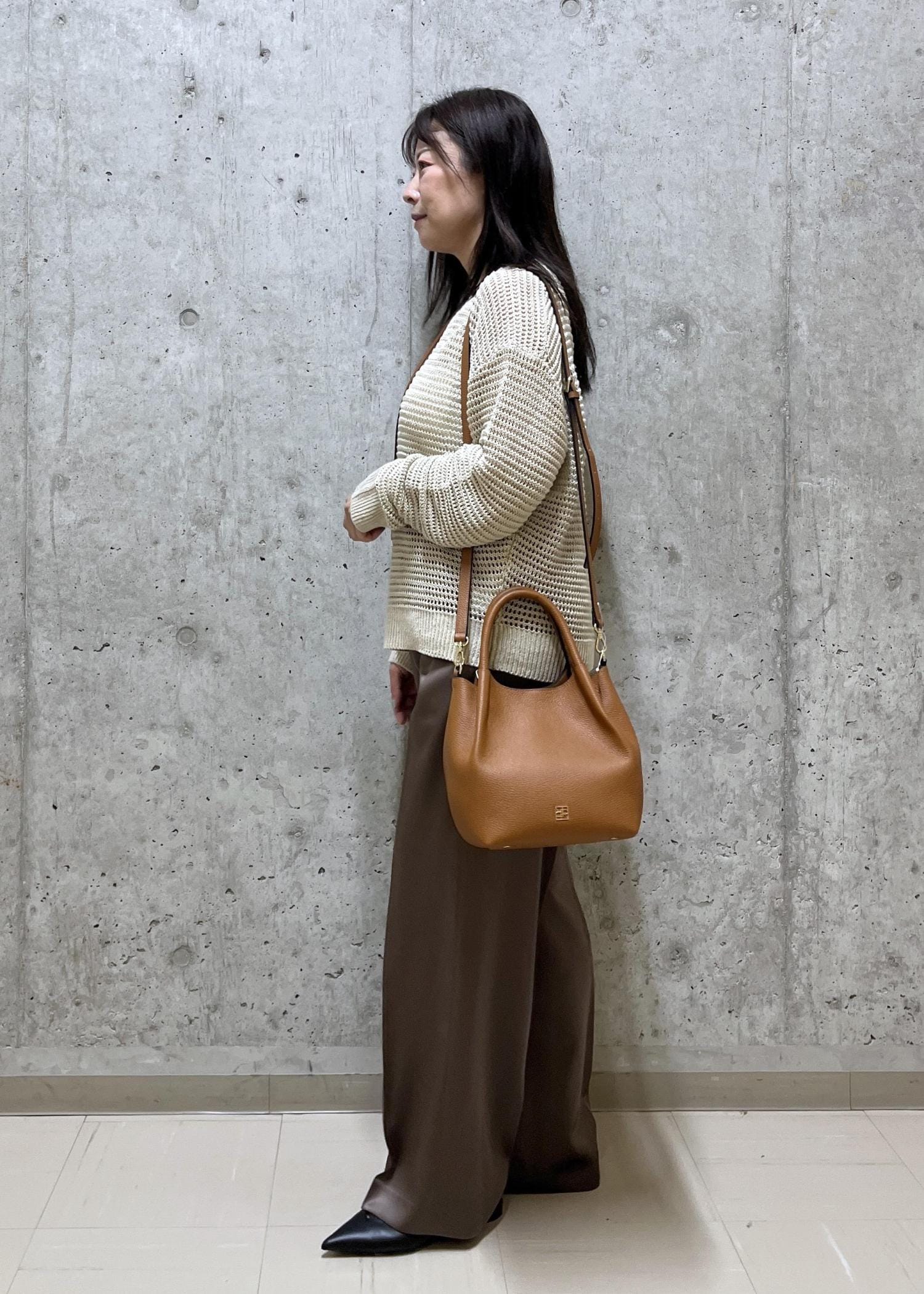ブラウン系でまとめた落ち着いた雰囲気て、バックとネックレスの色をお揃いにした所がポイントです。