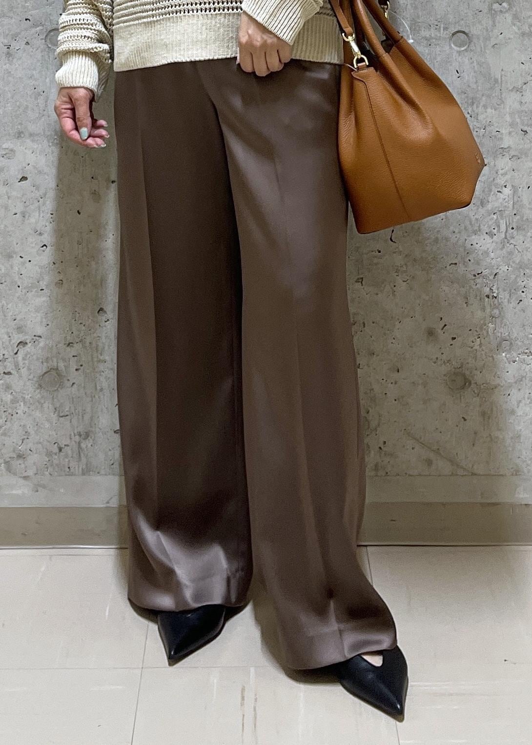ROPÉドレープサテンイージーパンツ/セットアップ対応・イージーケアキャメル系 / 36¥25,300レビューフラットなシューズでギリギリ床に付かない長さでした。