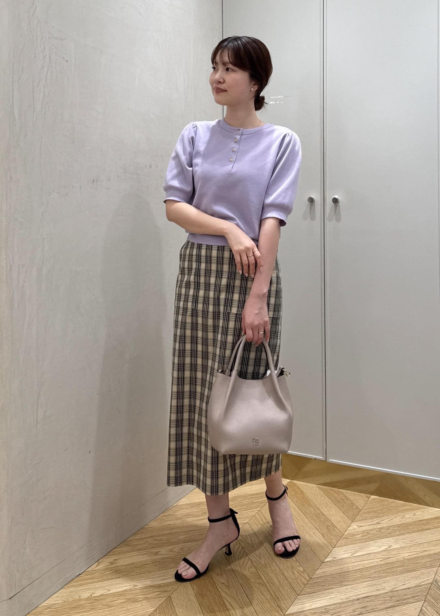 モーヴカラーのトップスと合わせて