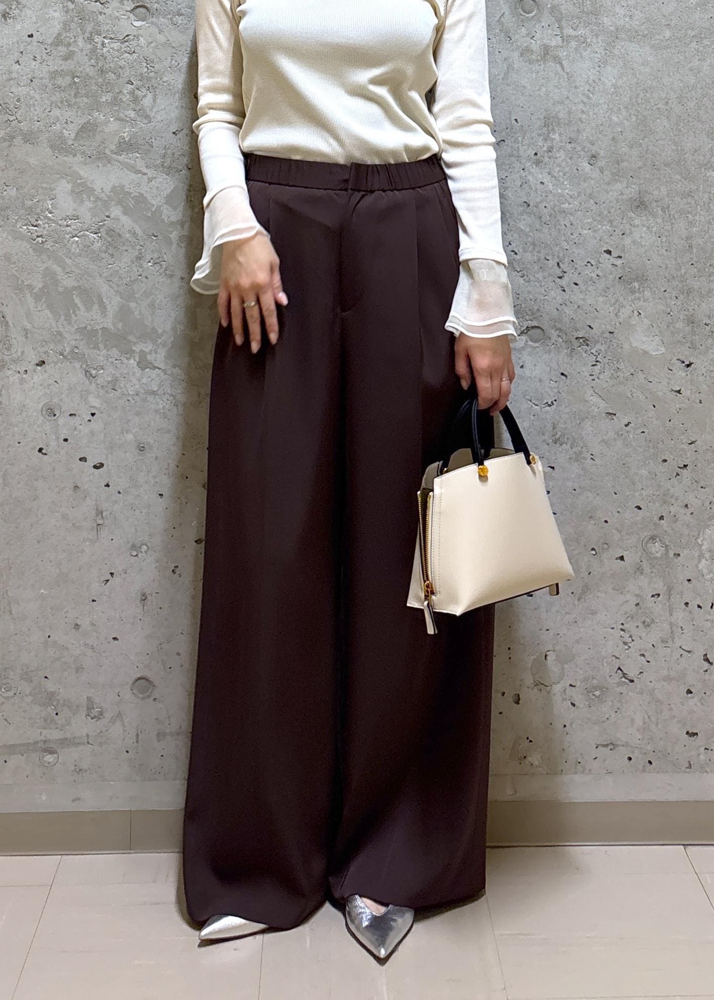落ち感のあるワイドパンツとフレア袖のインナーで