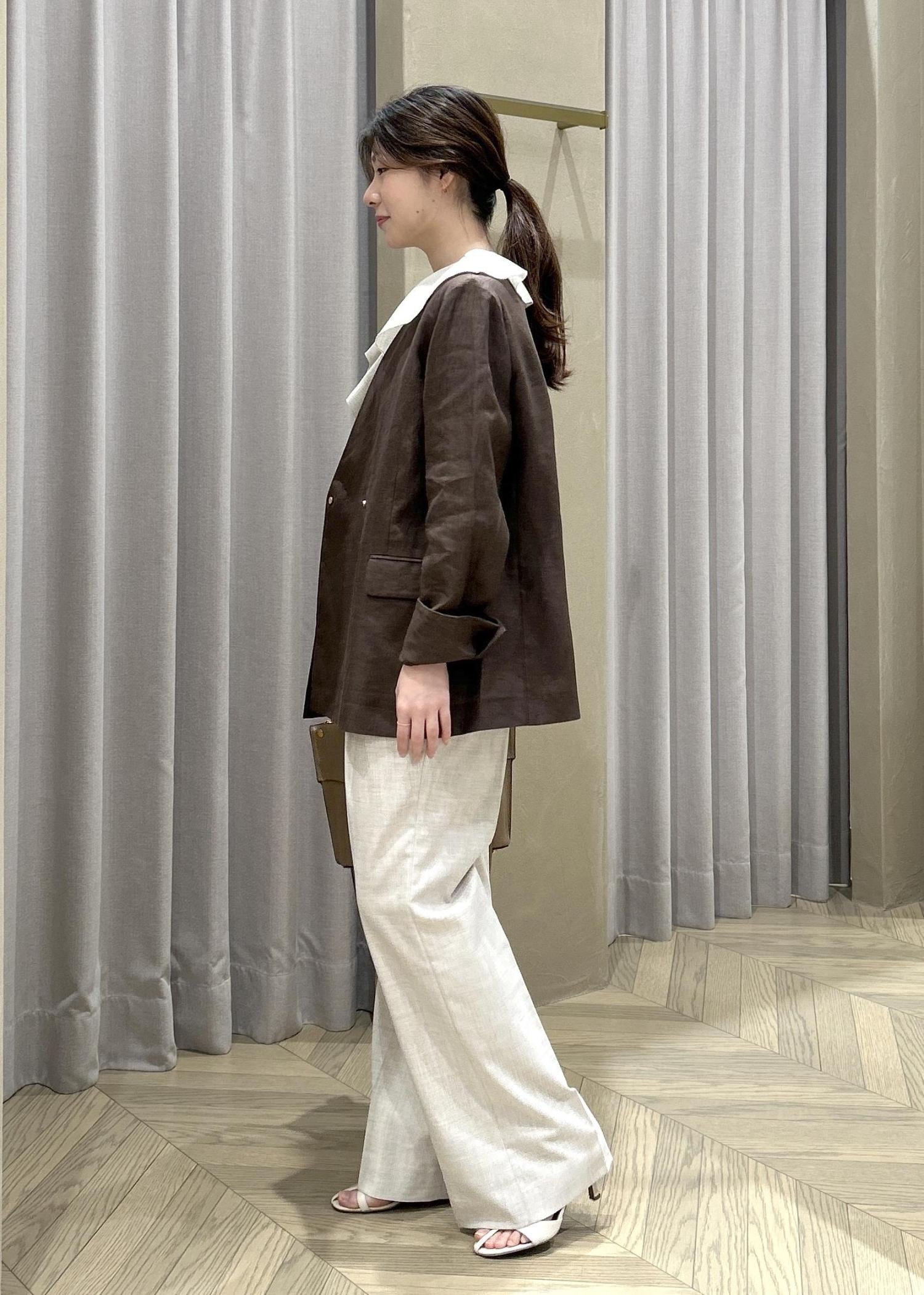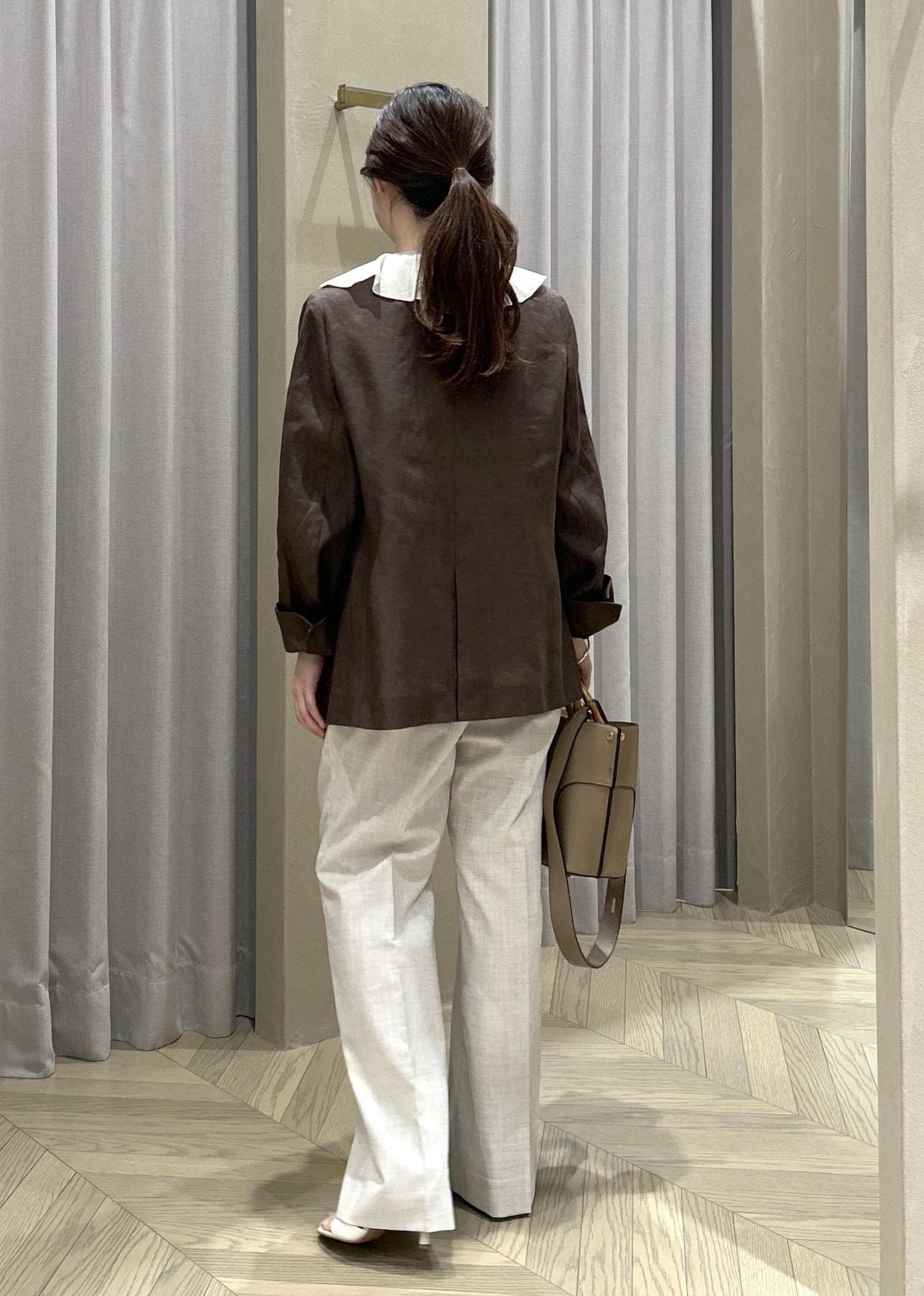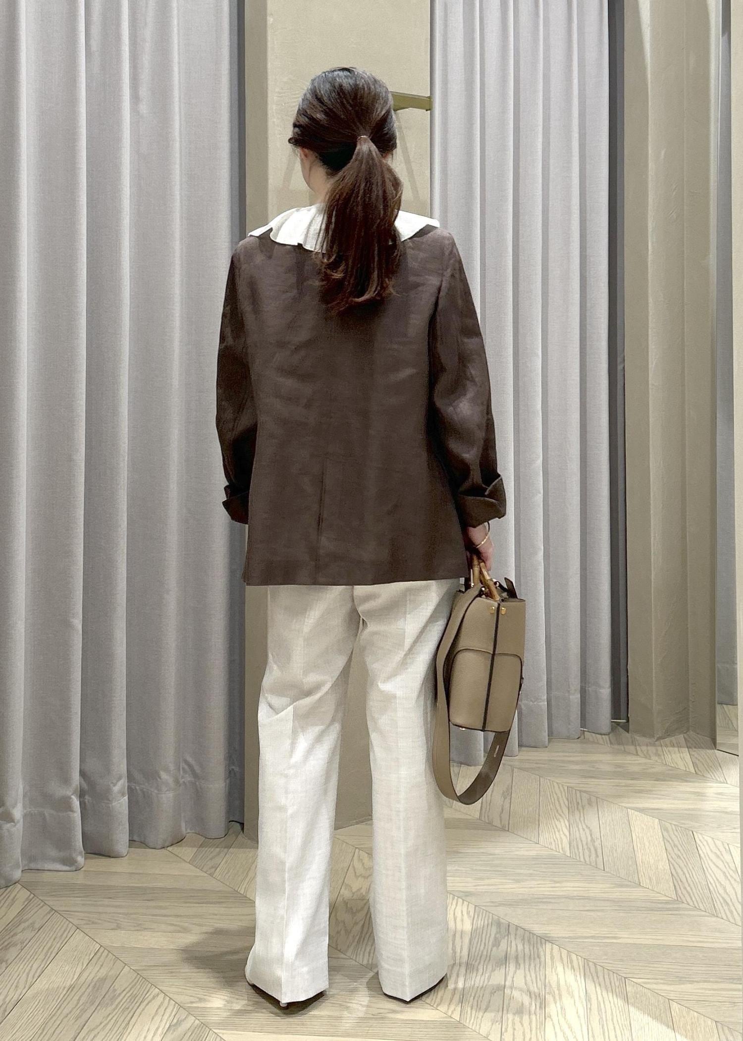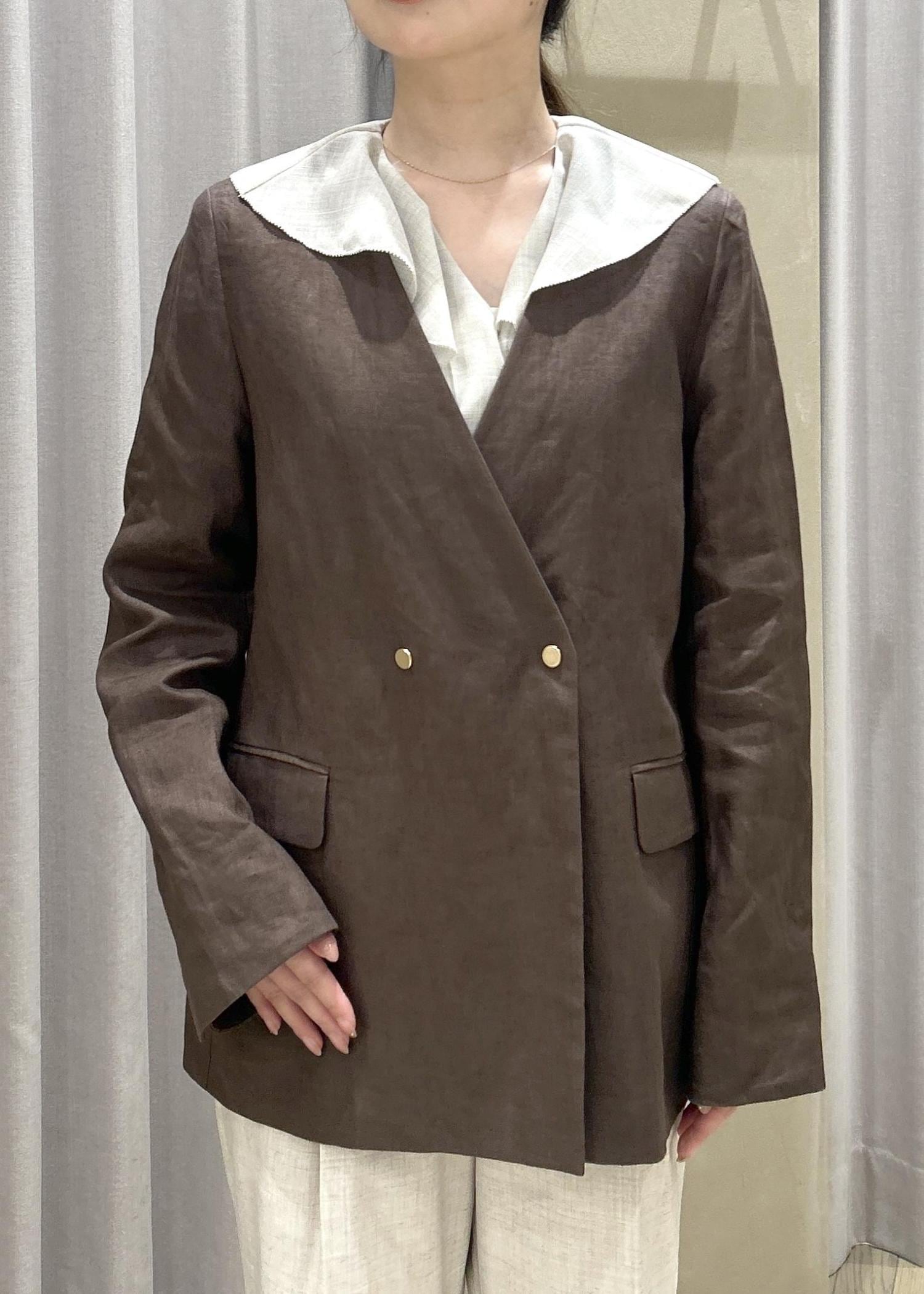 ROPÉリネンノーカラージャケット/セットアップ対応ダークブラウン系 / 36¥38,500レビュー36サイズを着用して、ヒップが隠れるくらいの丈感で袖丈は手の甲まで隠れる長さです。