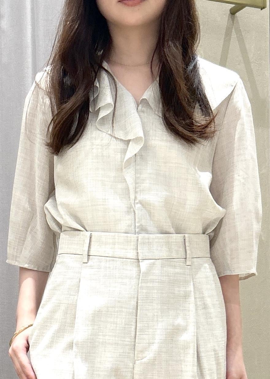 ROPÉリネンライクフリルカラーブラウス/セットアップ対応・イージーケアベージュ / 38¥19,800レビュー38サイズを着用して腰が隠れるくらいの丈感、袖丈は肘まで隠れる長さでした。