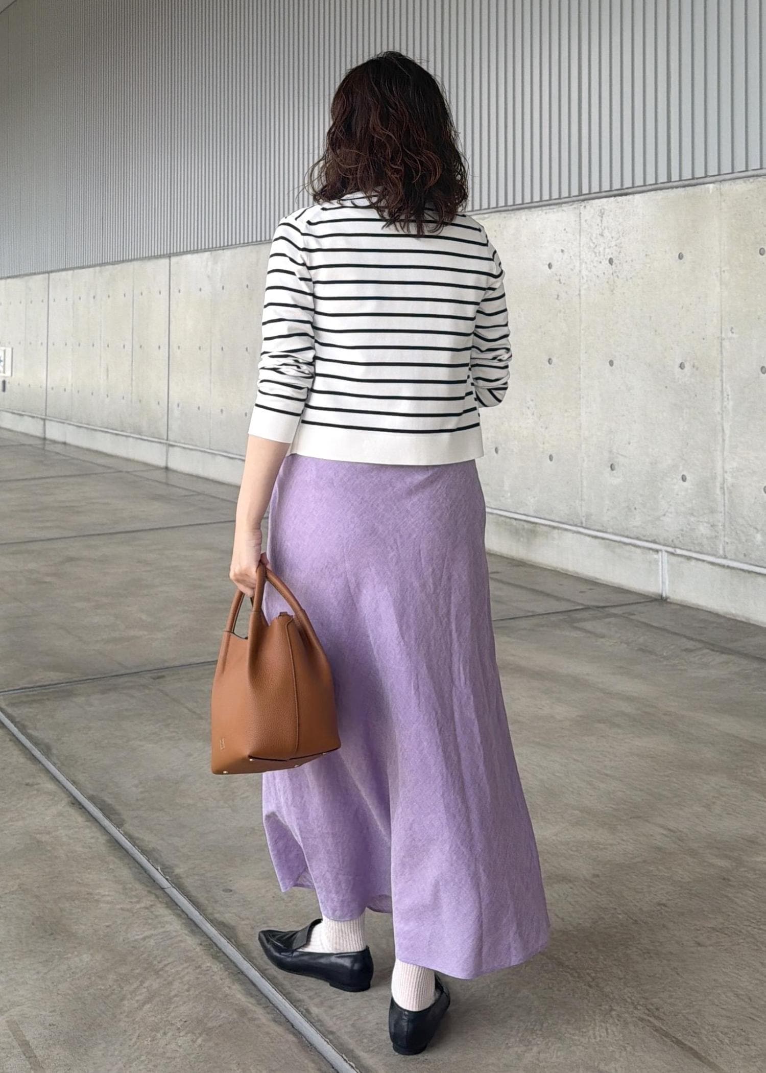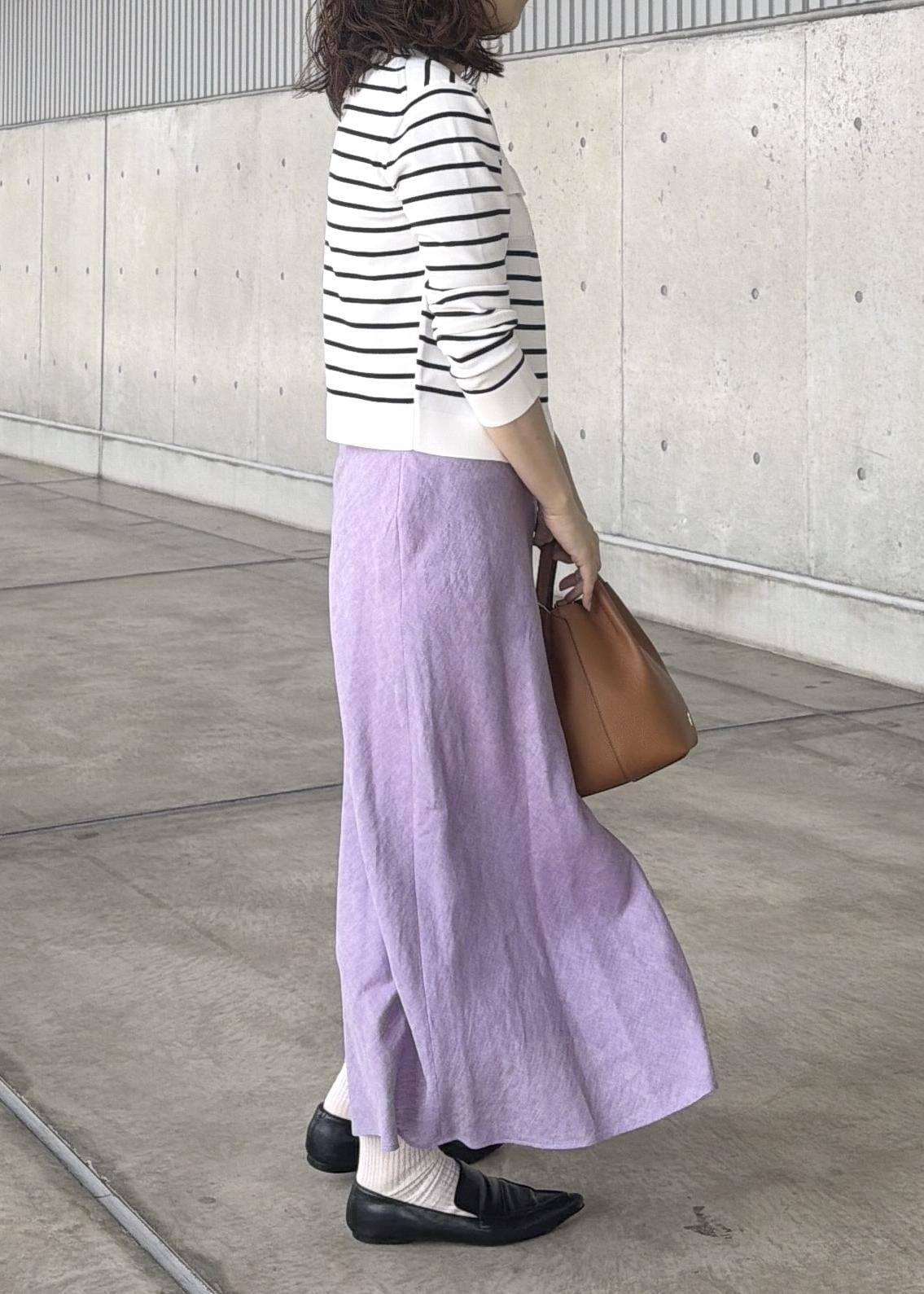 ハイウエストで腰まわりはすっきりと、マーメイドシルエットが歩くたびに裾が軽やかに揺れる春夏らしいスカートです。
