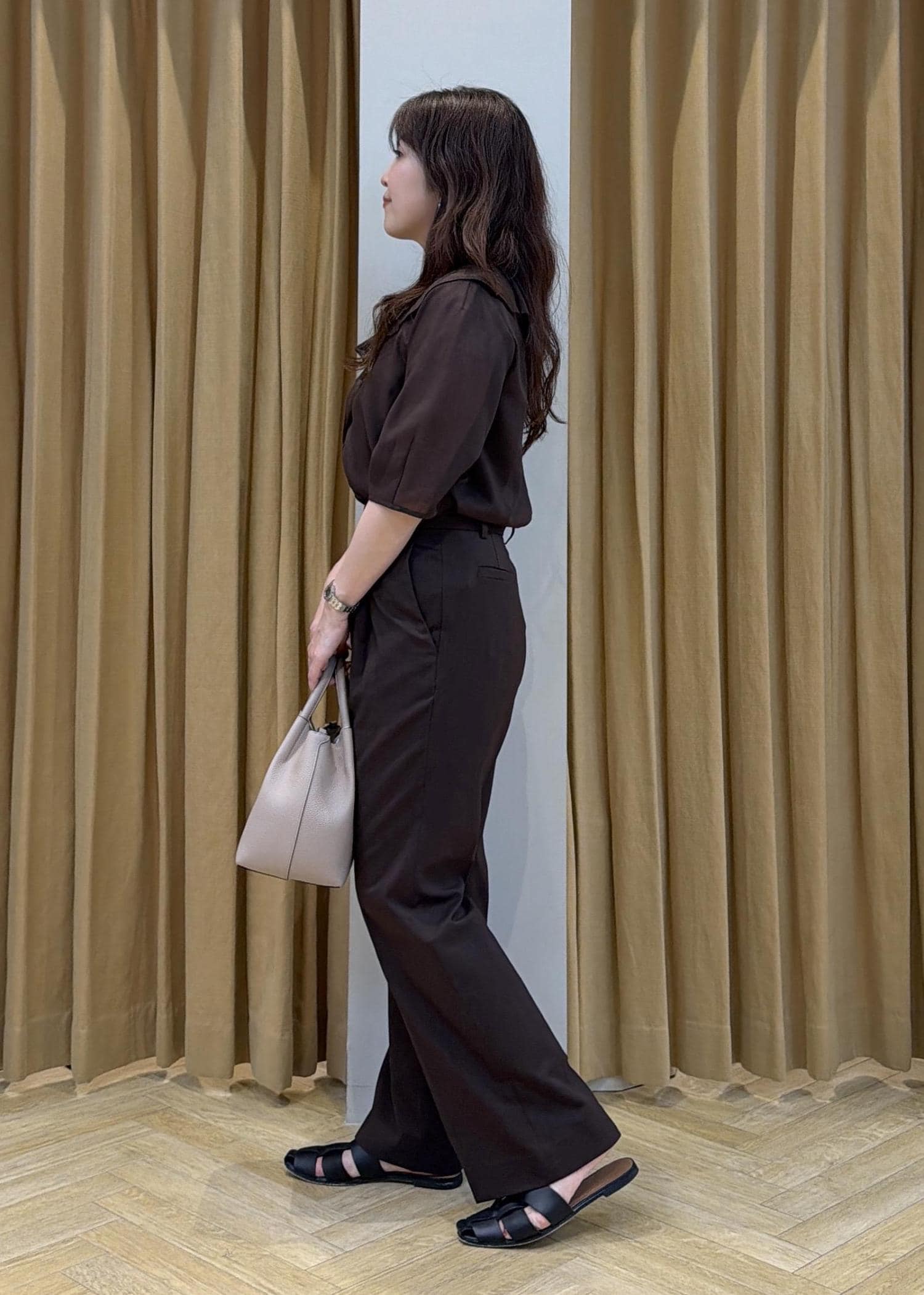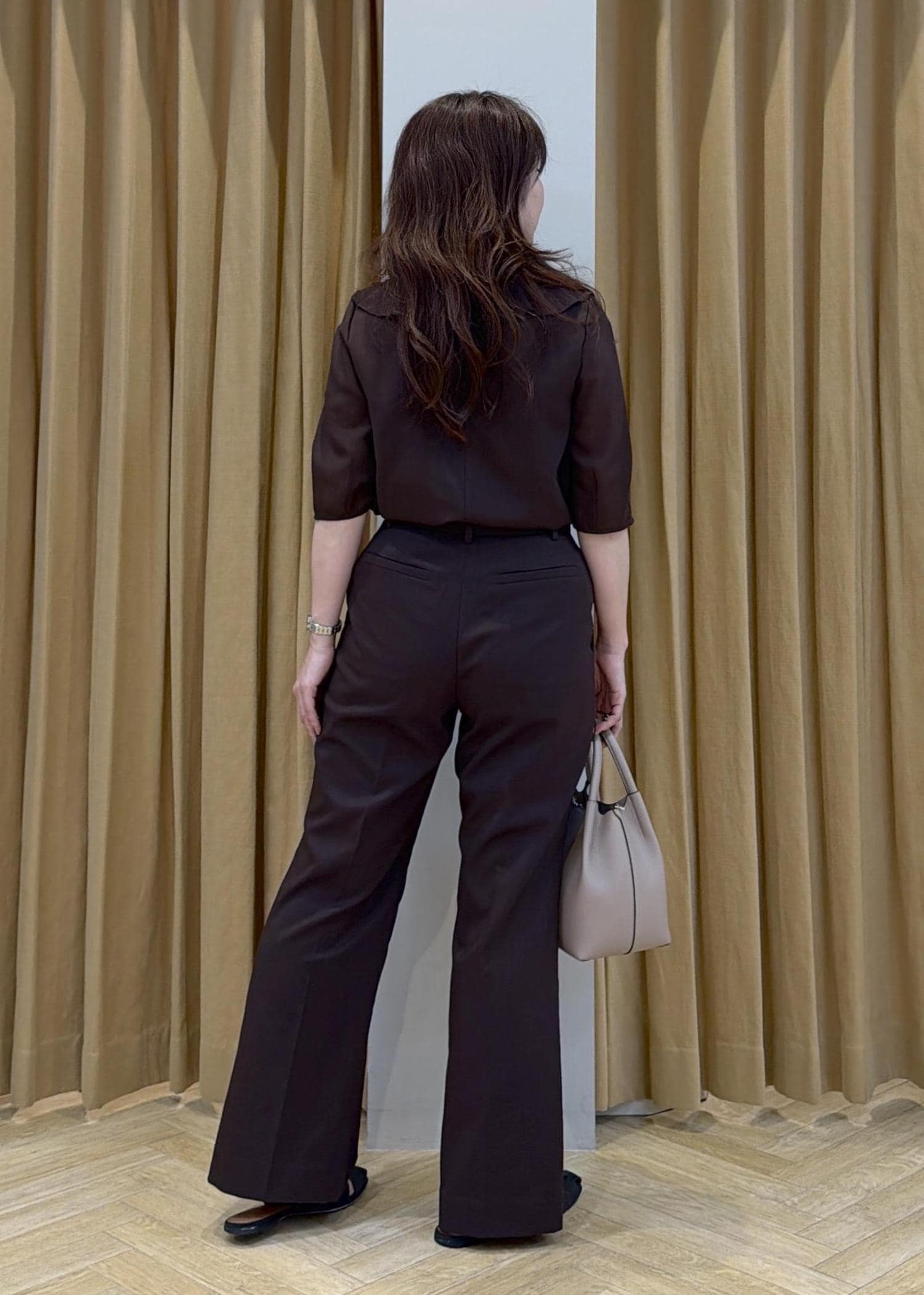 ROPÉリネンライクセミフレアパンツ/セットアップ対応・イージーケアダークブラウン / 38¥19,800レビュー38サイズ着用。
