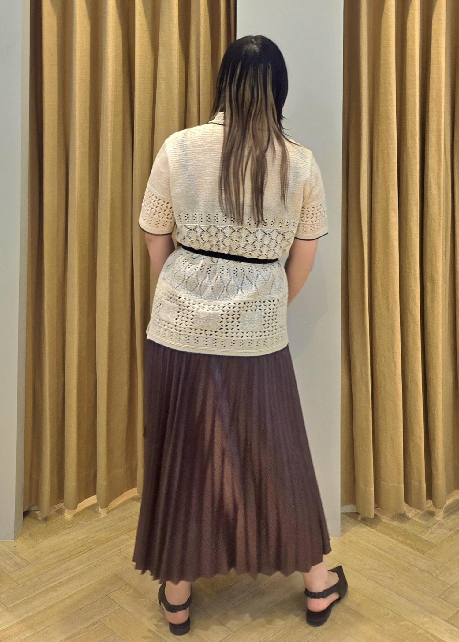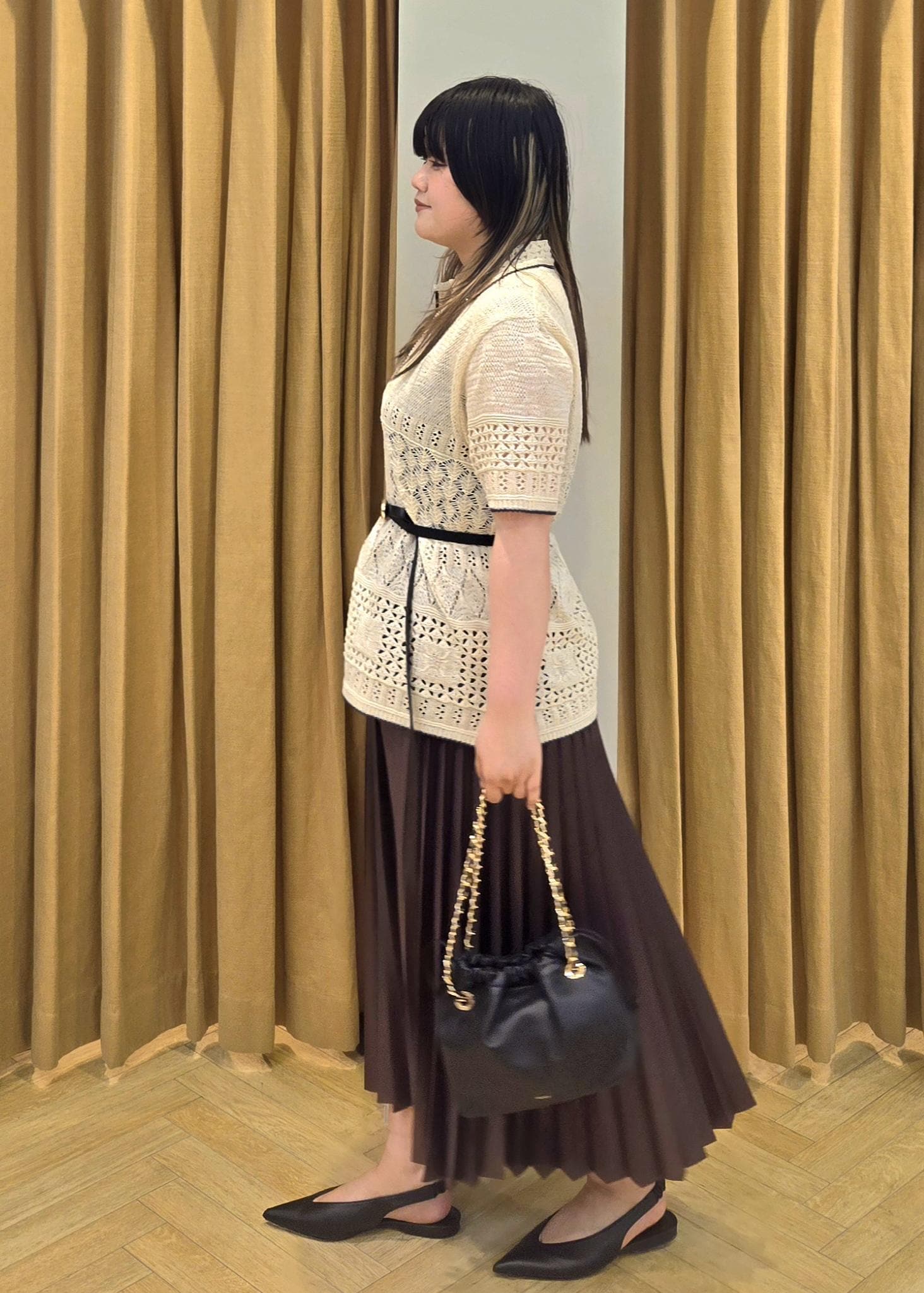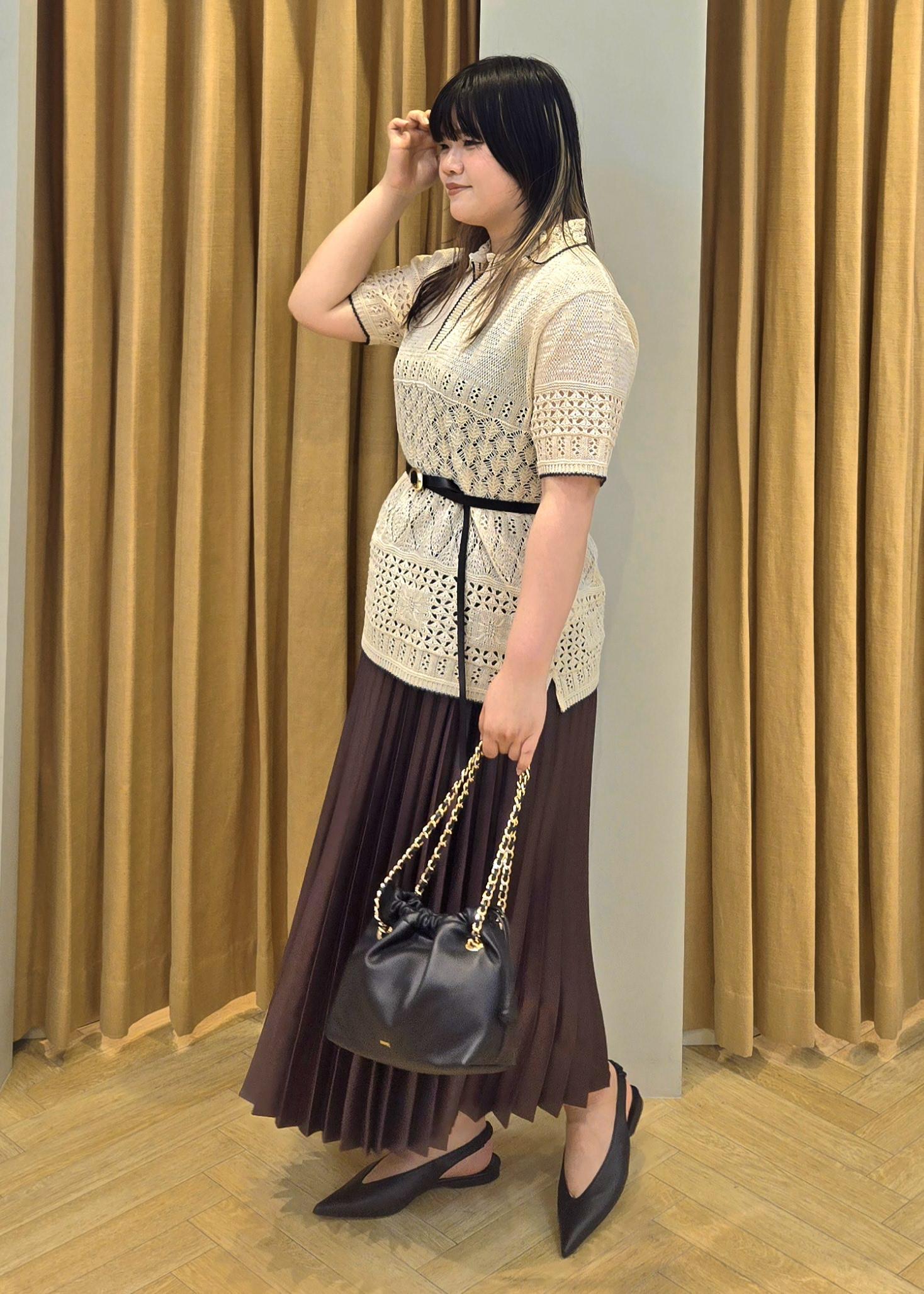 サマーニットが清涼感を演出してくれ、スカートの艶感が華やかな印象に見せてくれます。