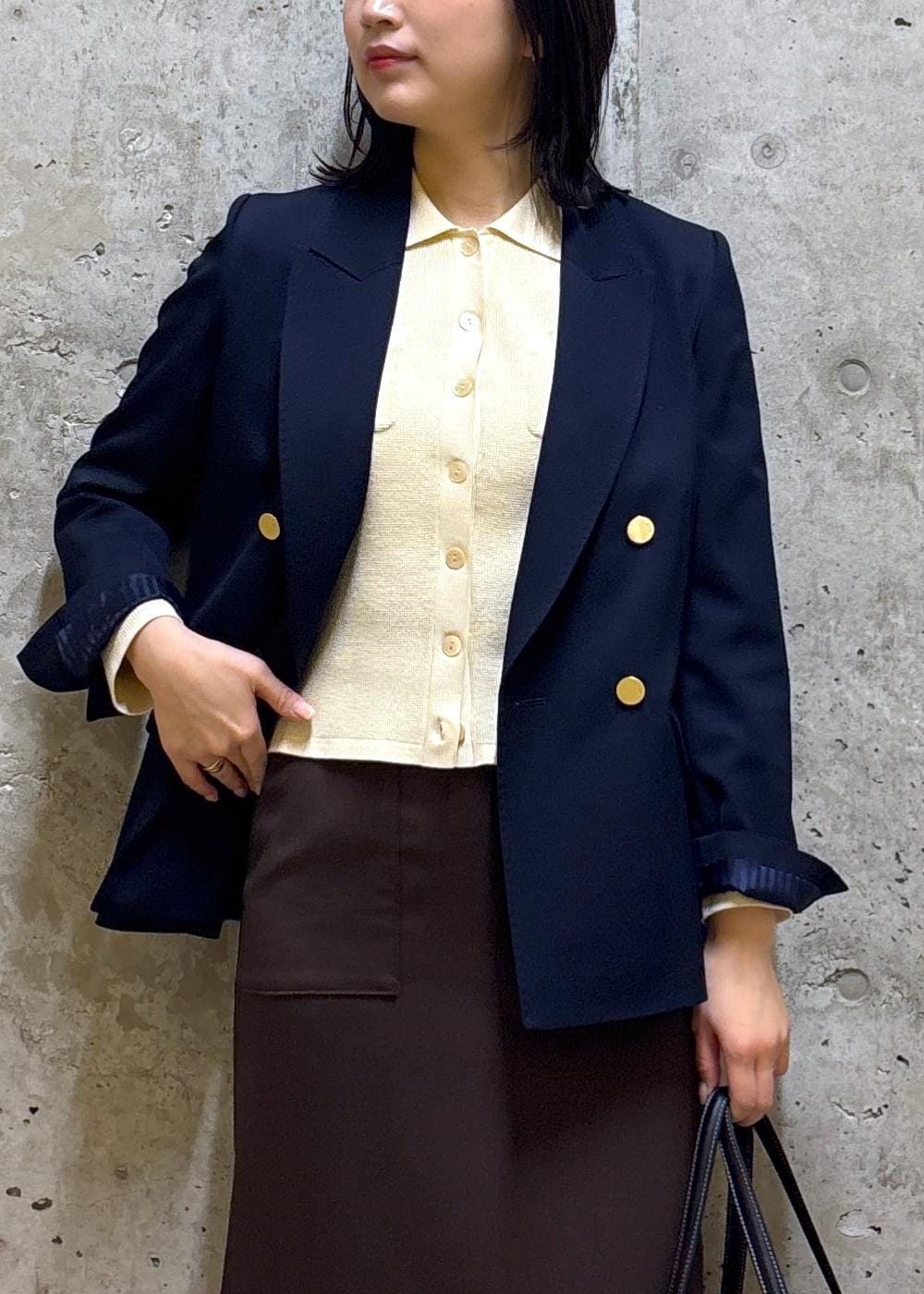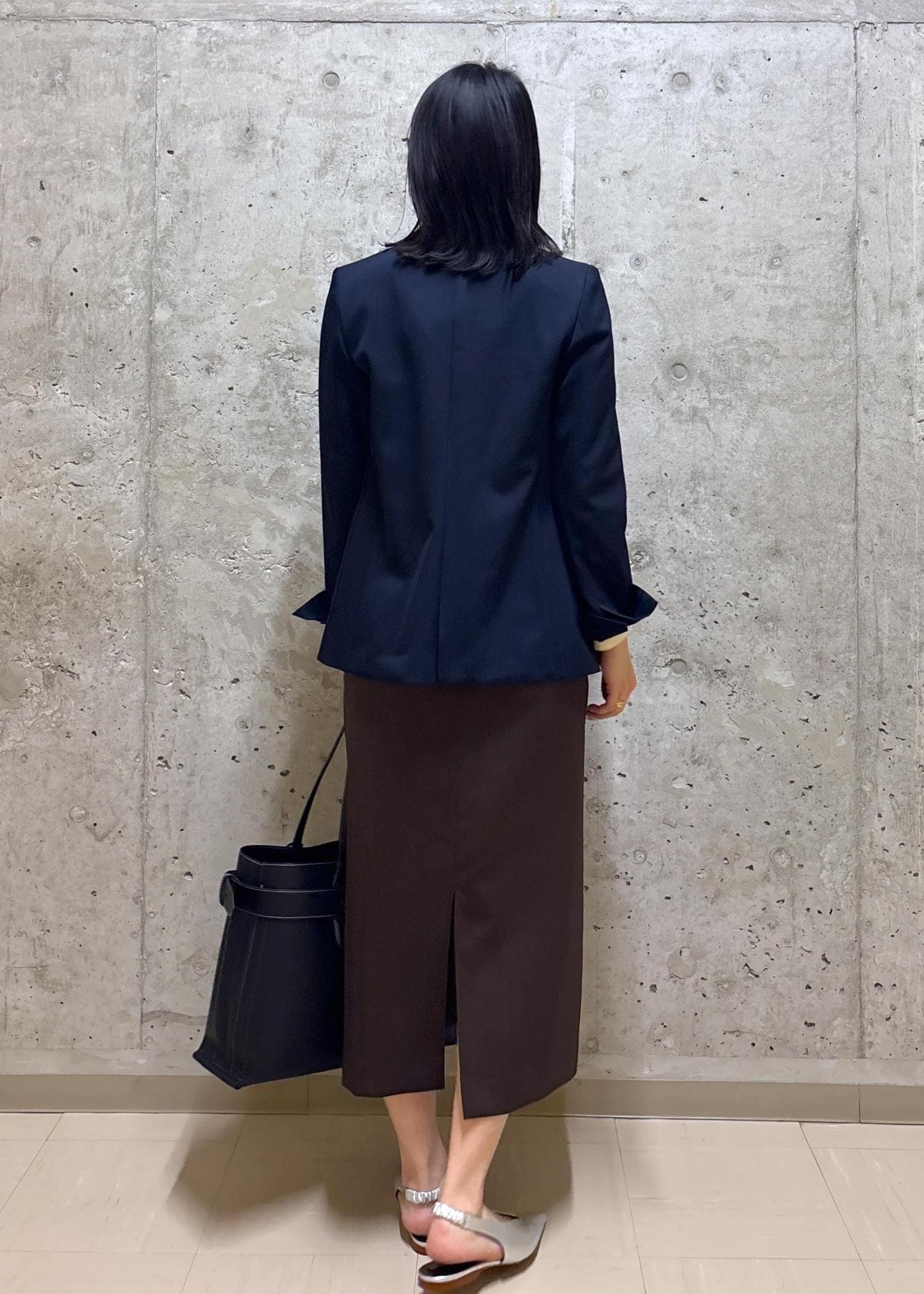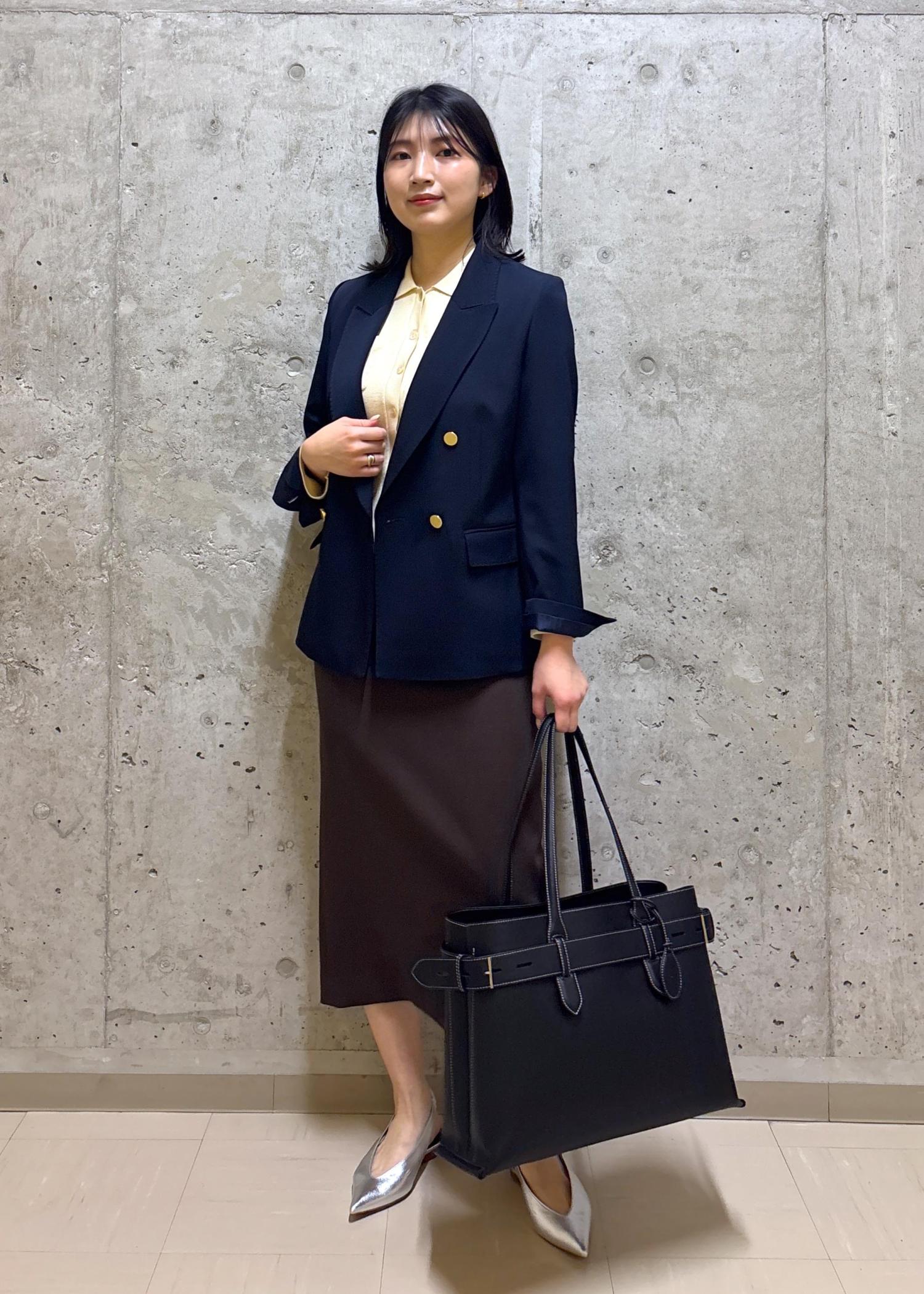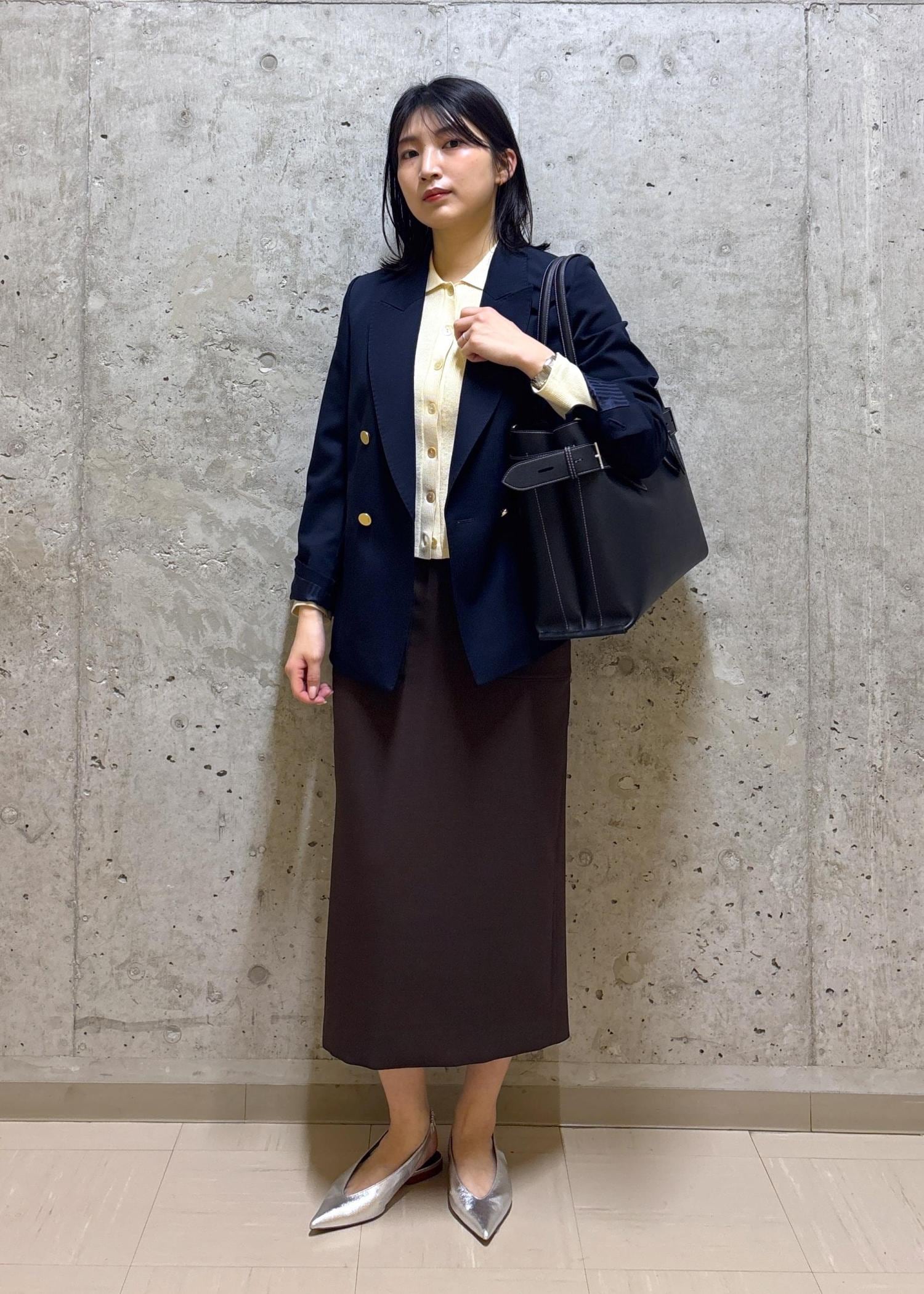 紺ブレザーをイエローベージュのニット×ブラウンのスカートで合わせた固くない通勤コーデ。