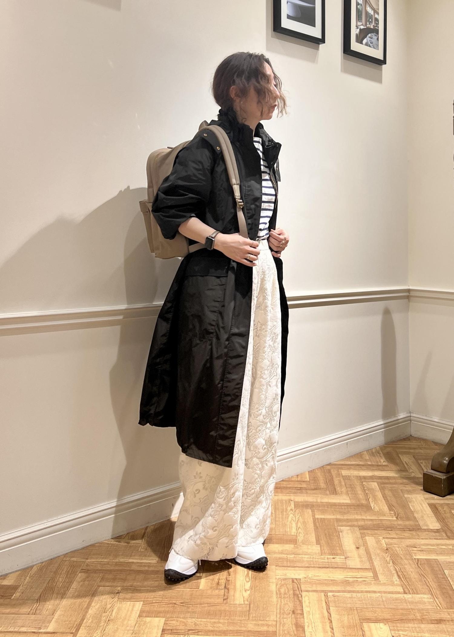 冬の雨よりも、湿度が高くなり通気性がほしくなるので、インナーはコットンのルミノアで快適に。コートとスニーカー、撥水pacsacで完全防備です。