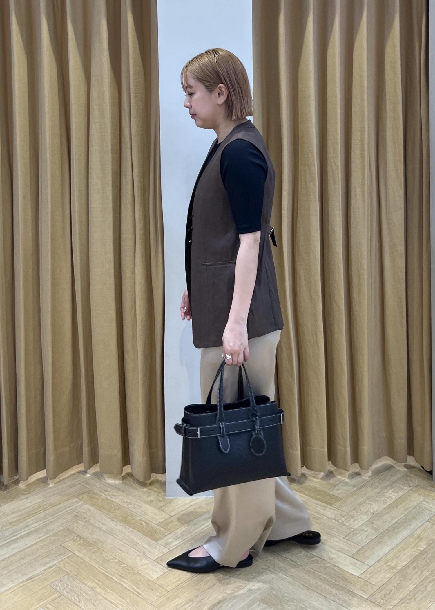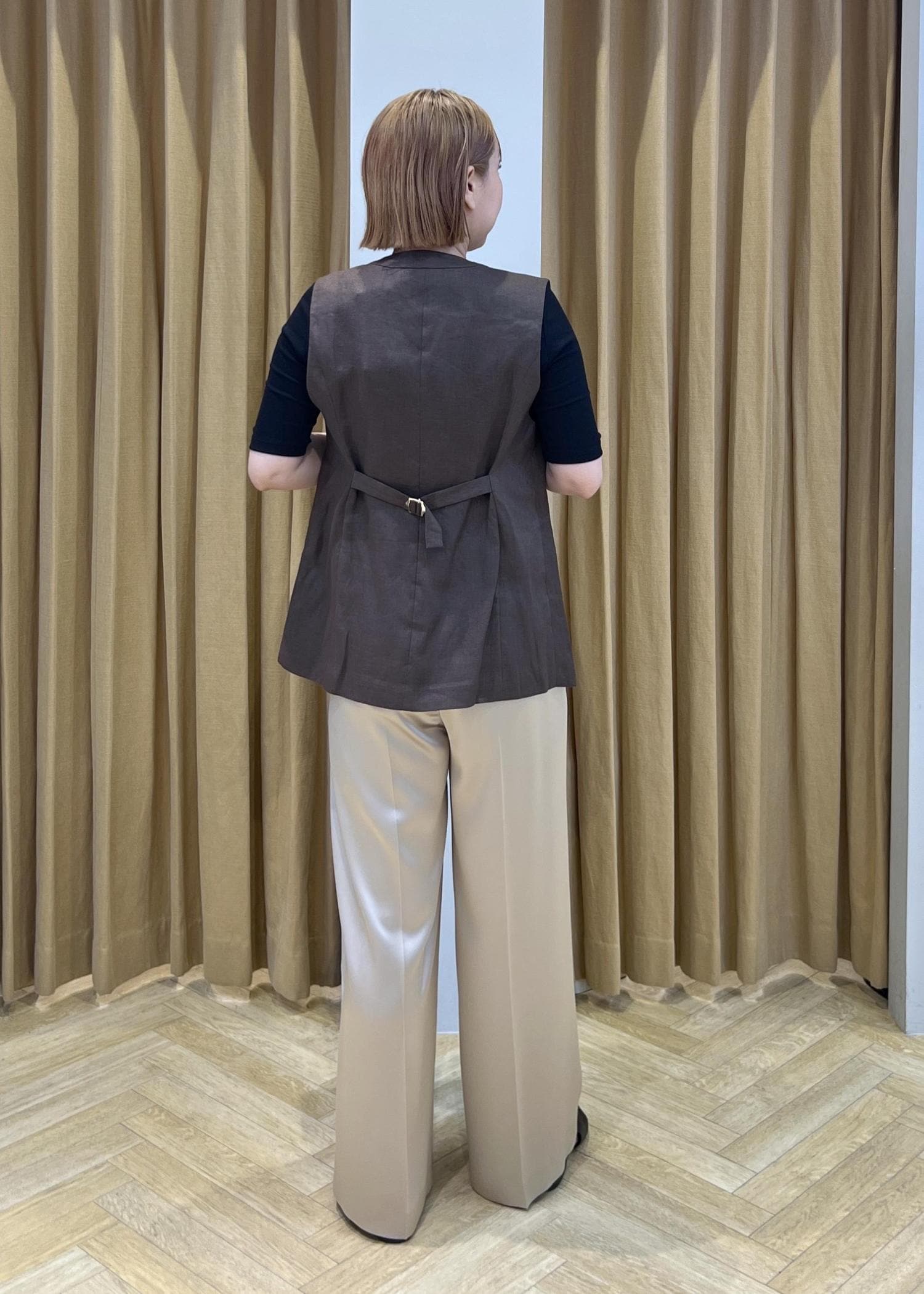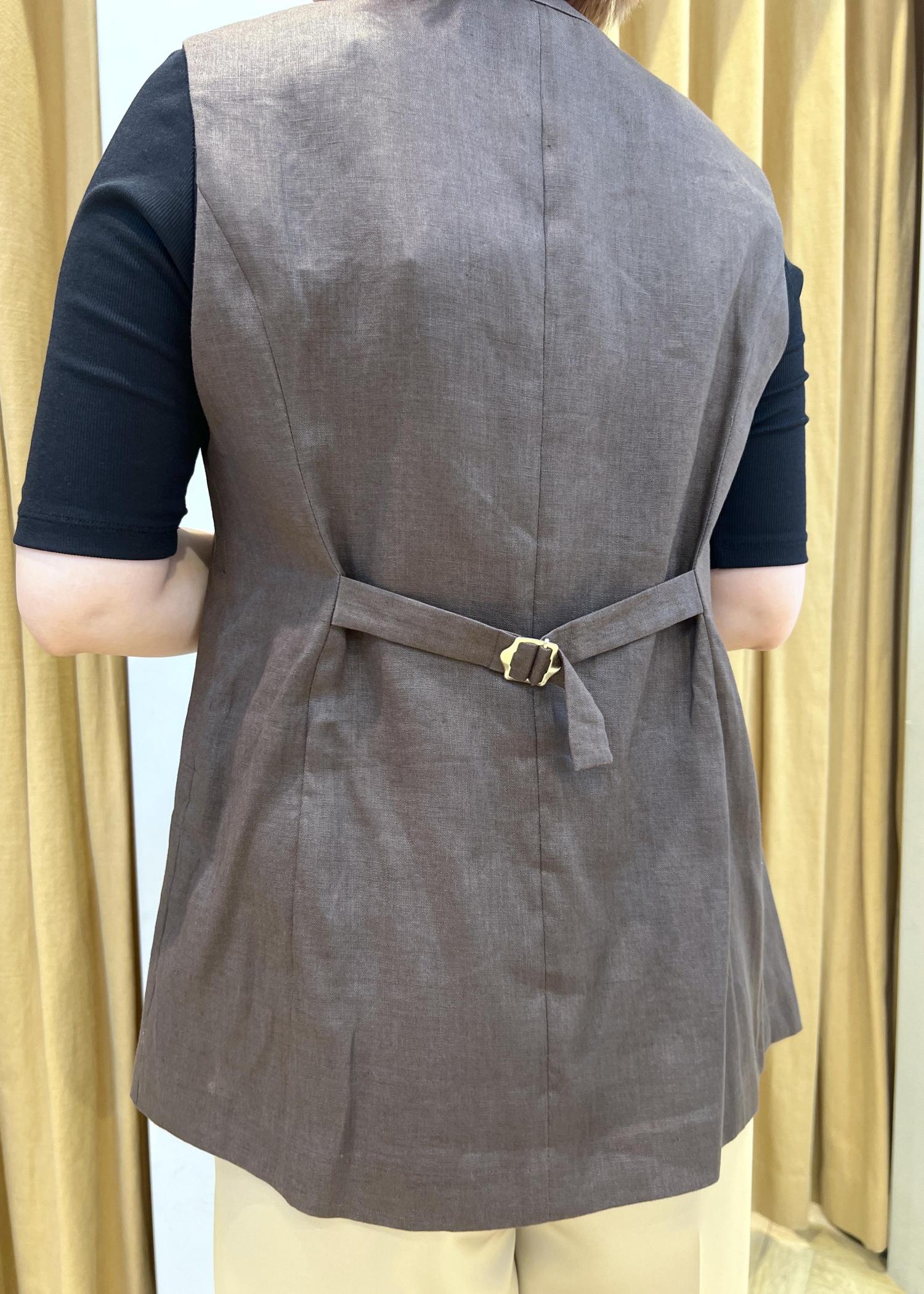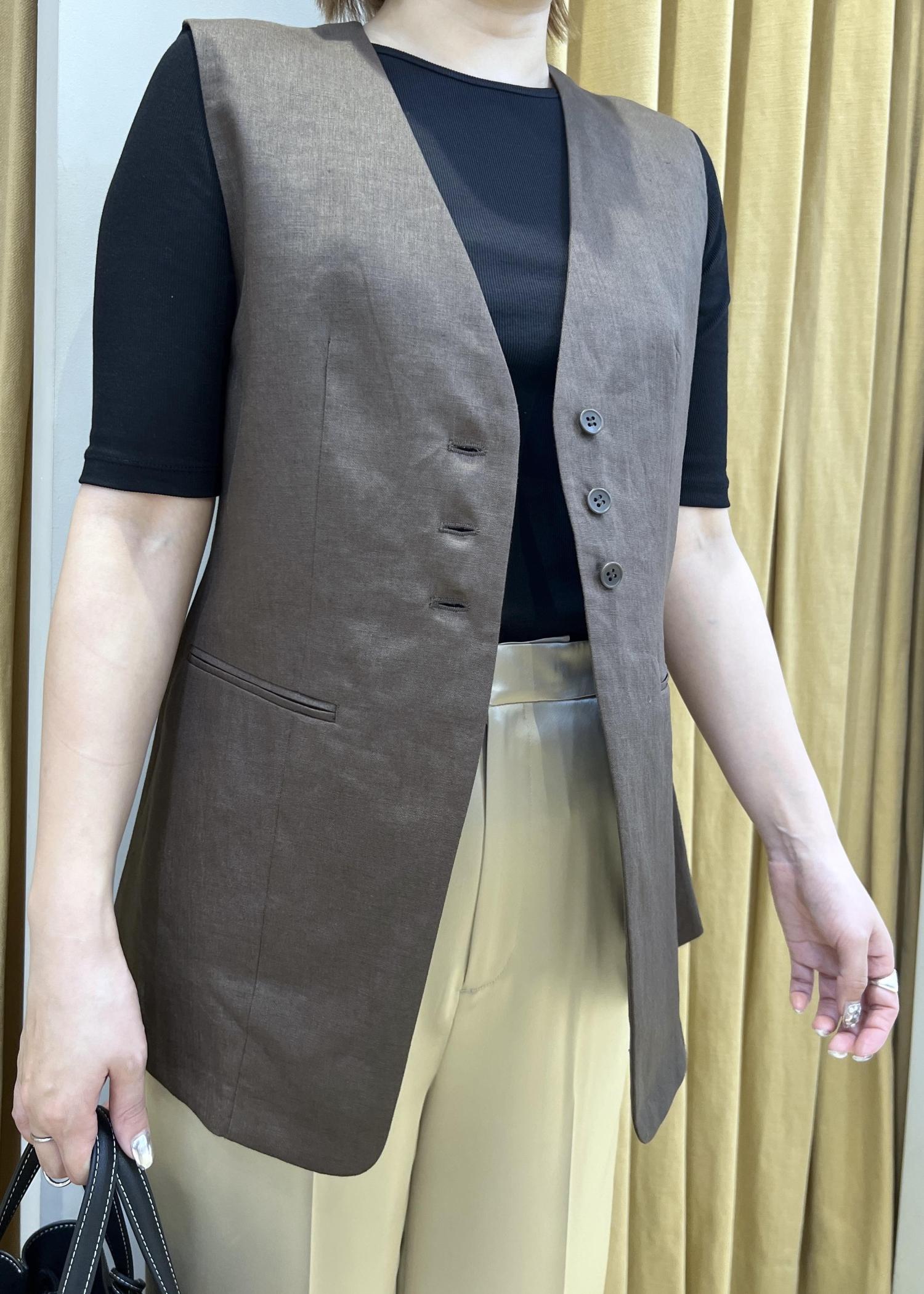 ROPÉリネンスリーブレスジレ/セットアップ対応ダークブラウン系 / F¥27,500レビュー程よいサイズ感で着丈はヒップが隠れる長さです。
