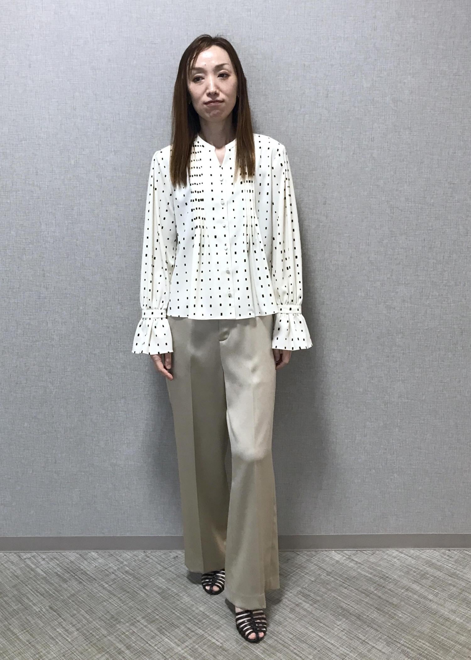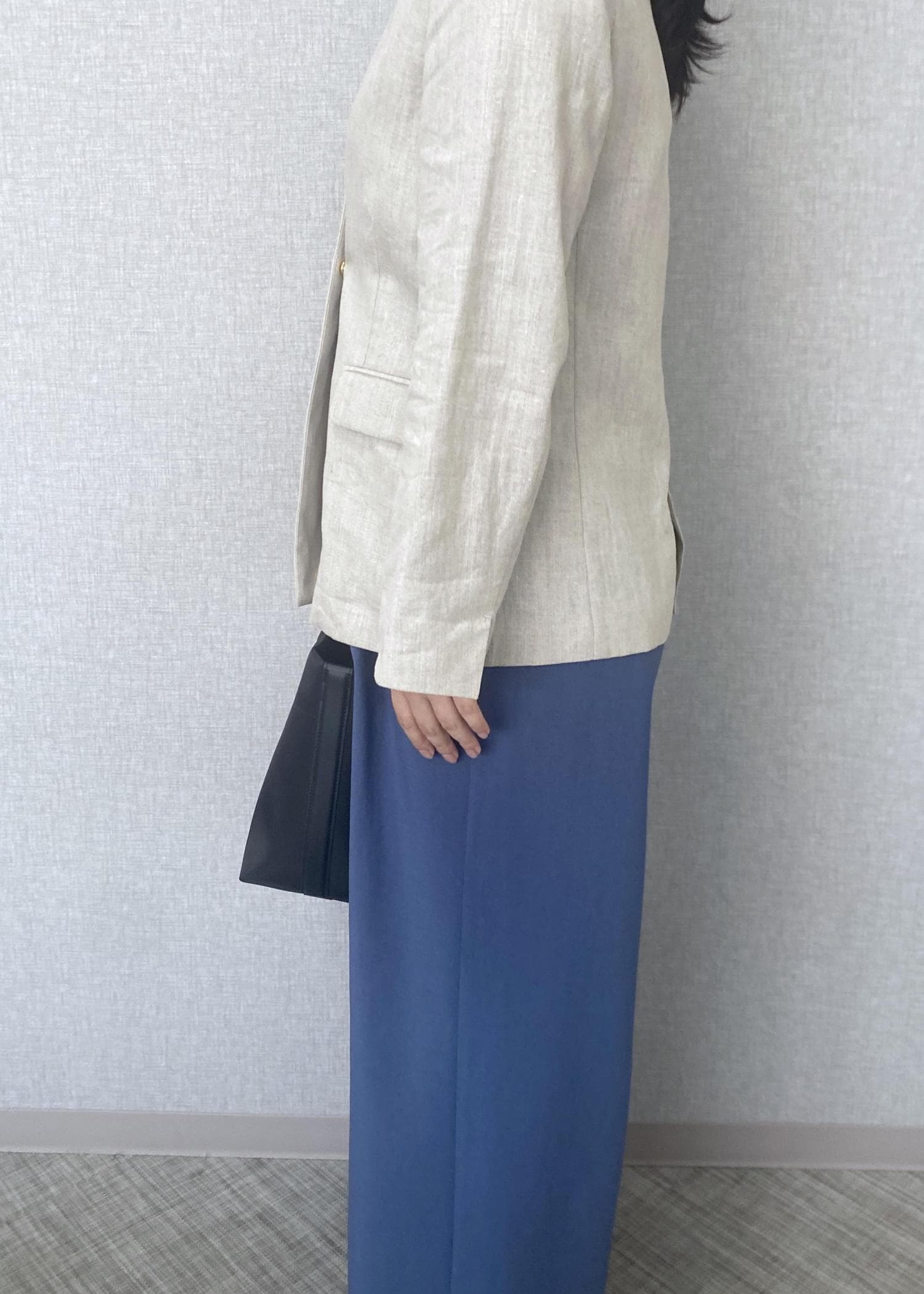 シンプルなシルエットのため、デザイン性のあるブラウスや柄物とも合わせやすく、幅広いスタイリングに対応できる一着です。