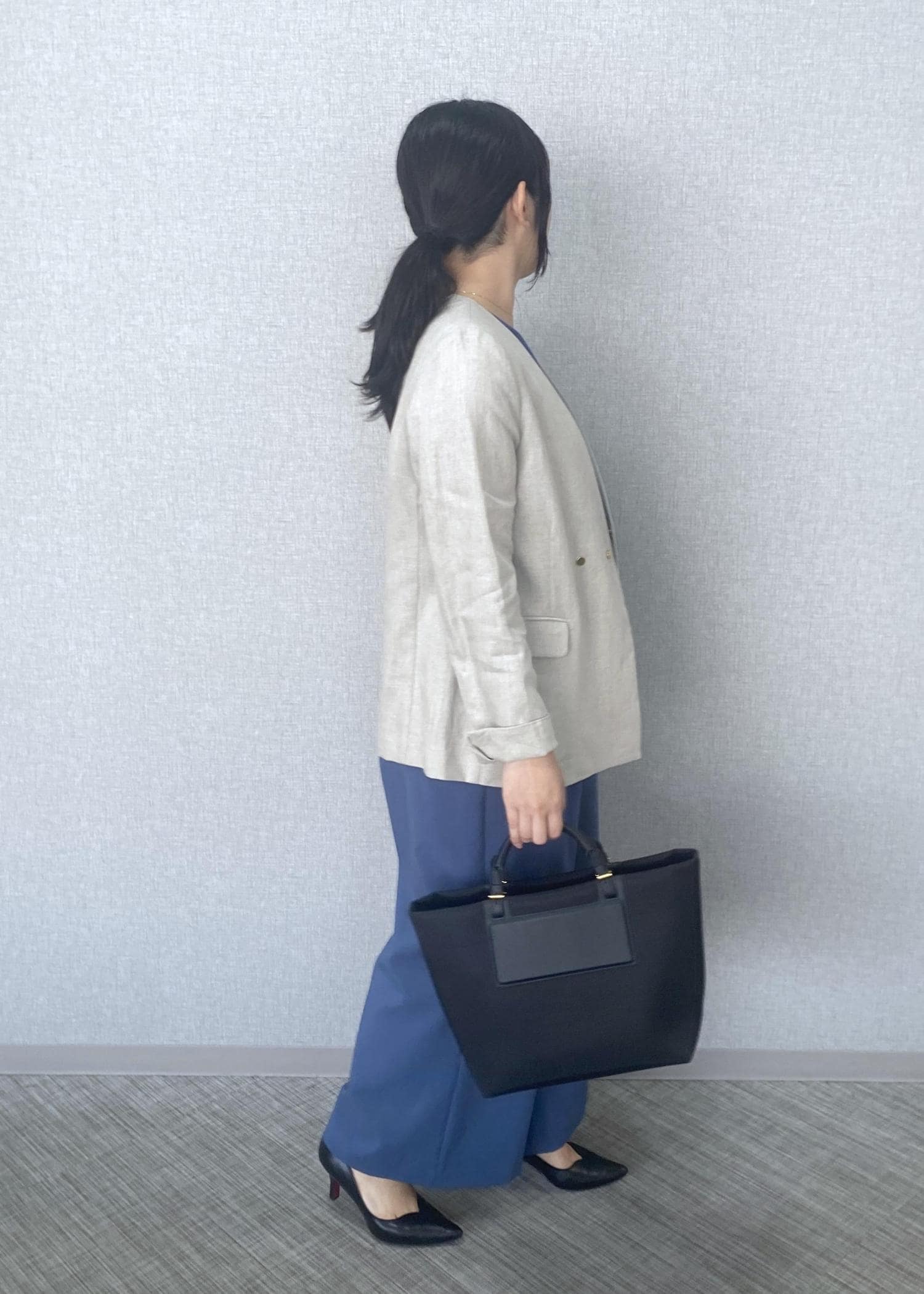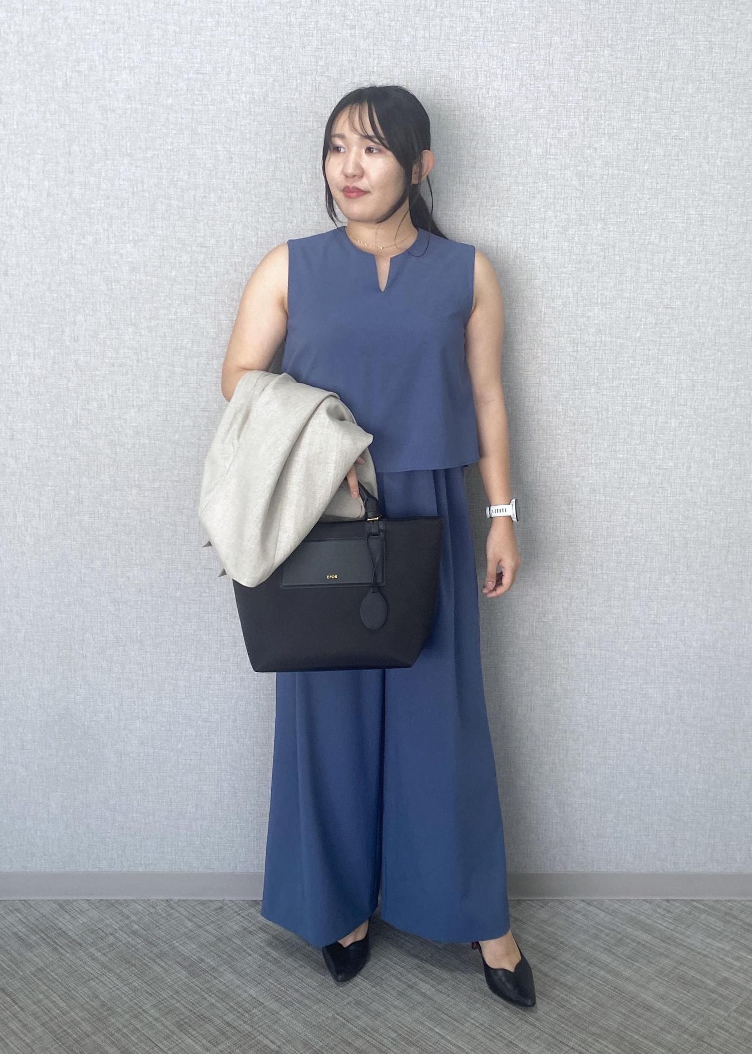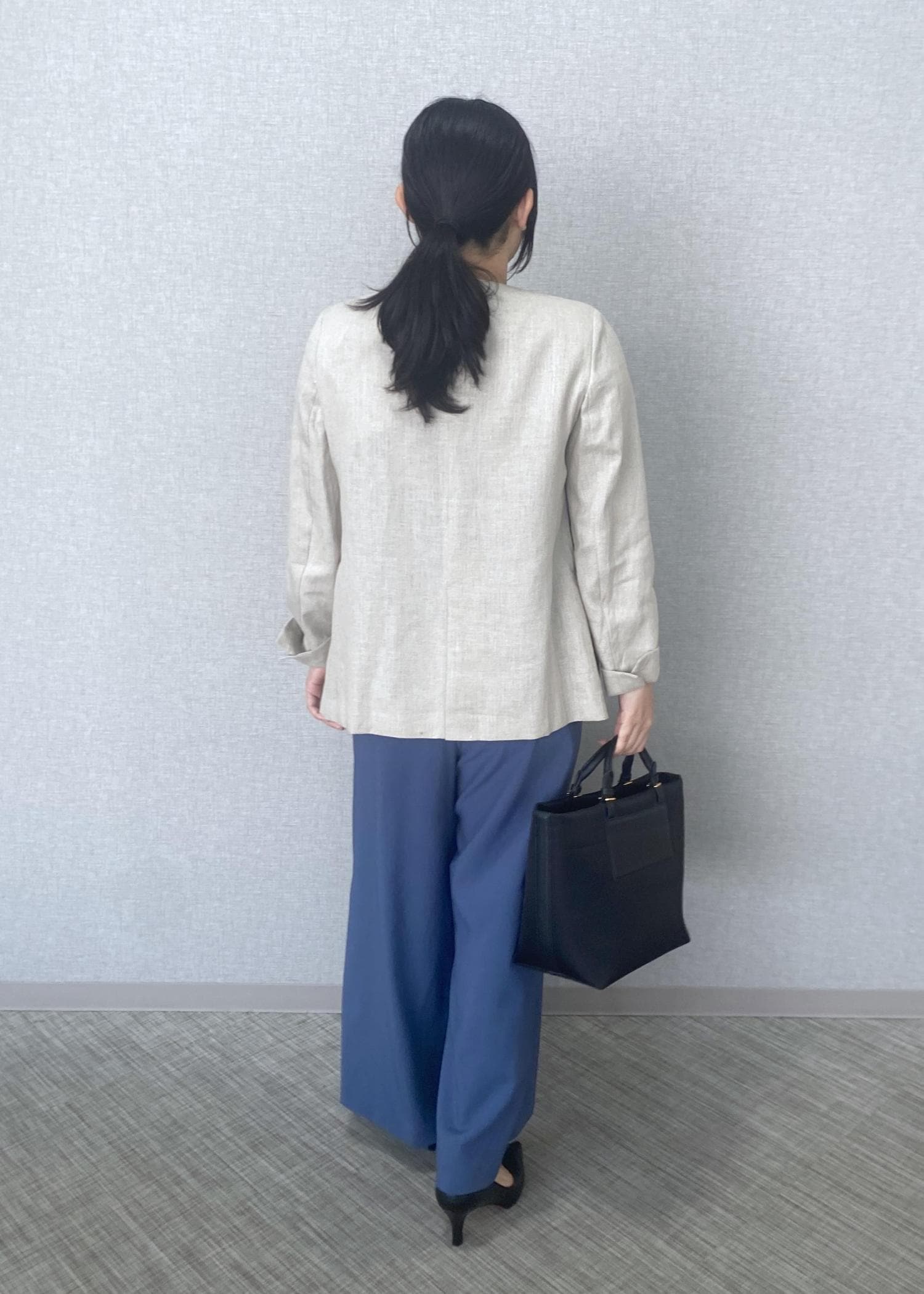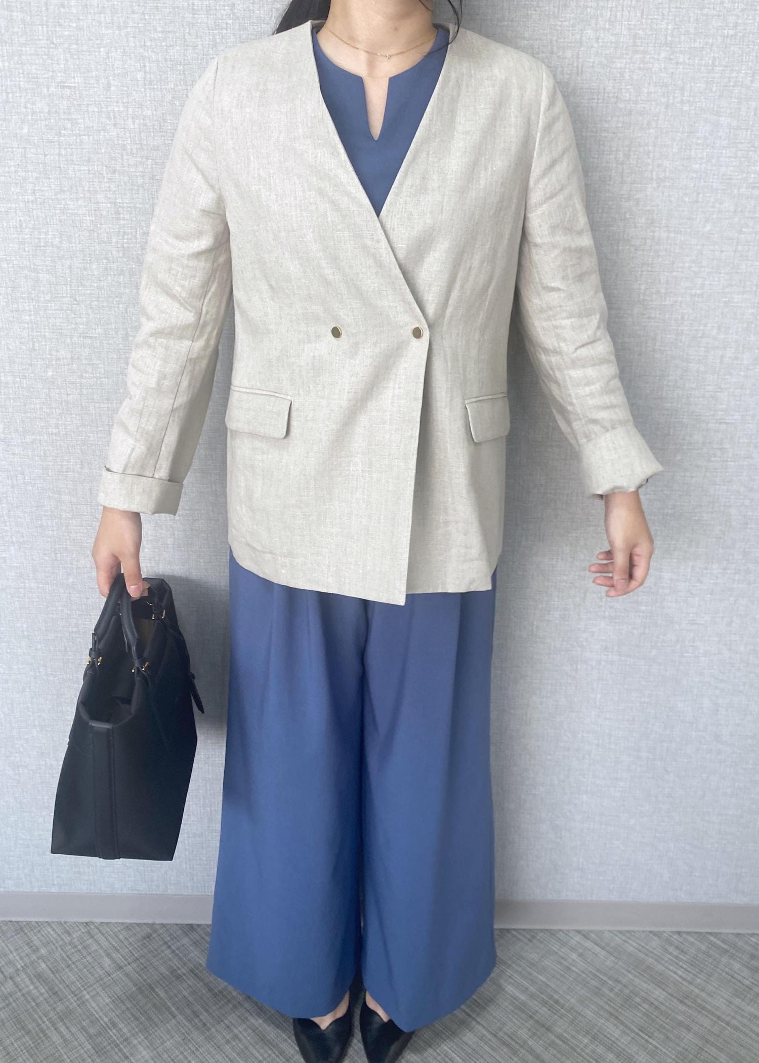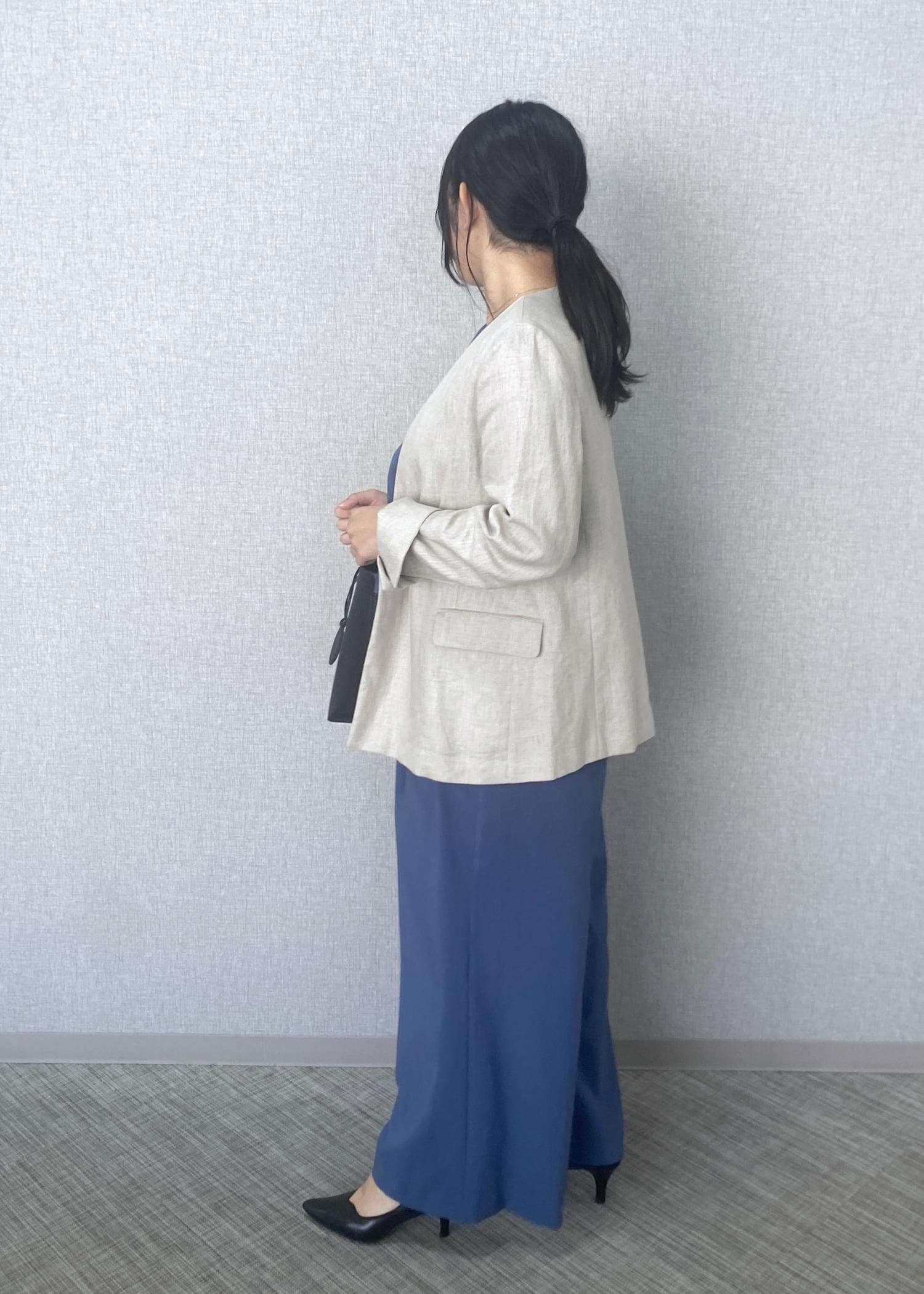 軽やかなオールインワンに、リネンジャケットを羽織ったお仕事コーディネートです。
