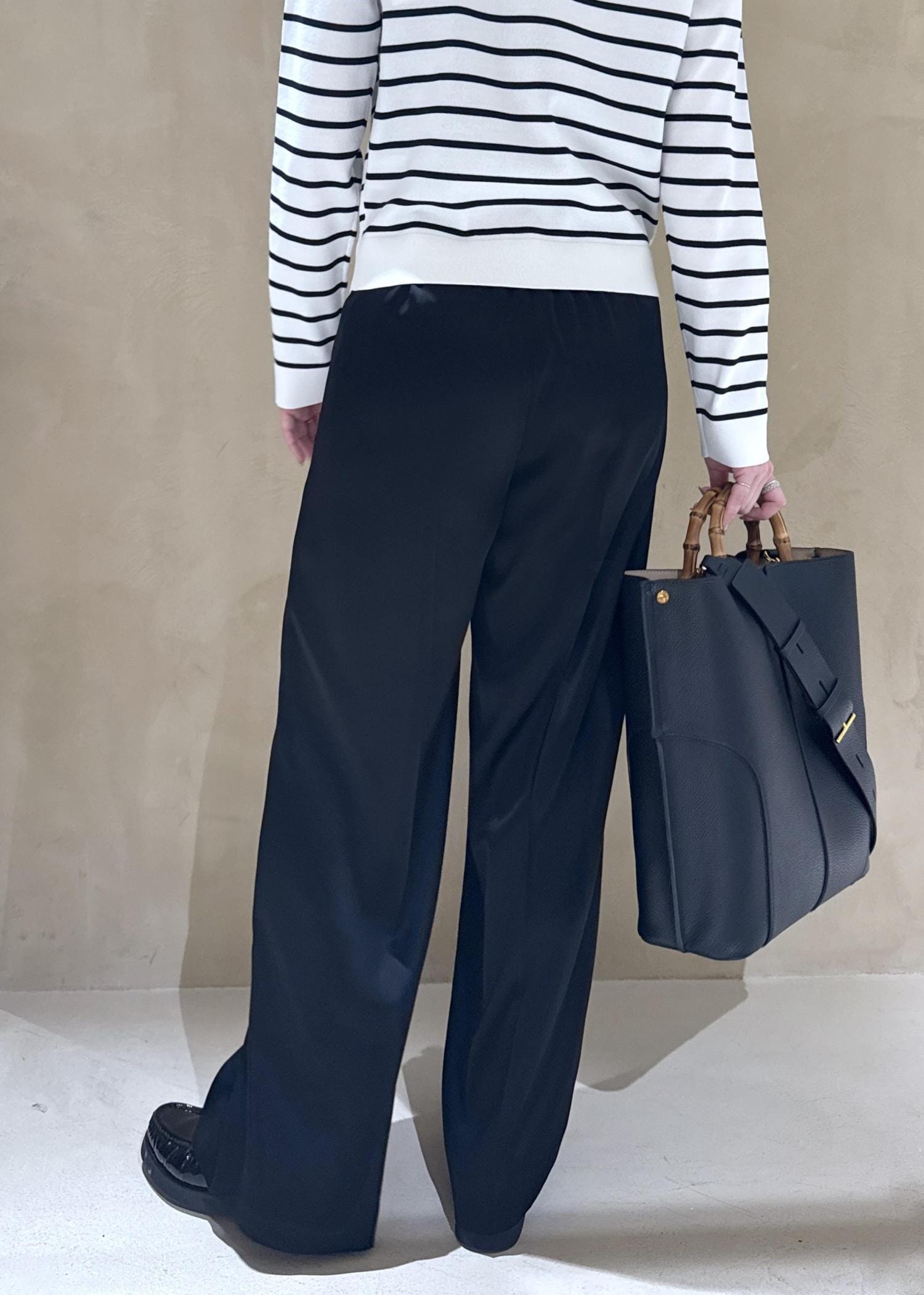 程よい光沢感とセンタープレスできちんとした印象にしつつ、柔らかい生地なのでリラックスした履き心地です。 -