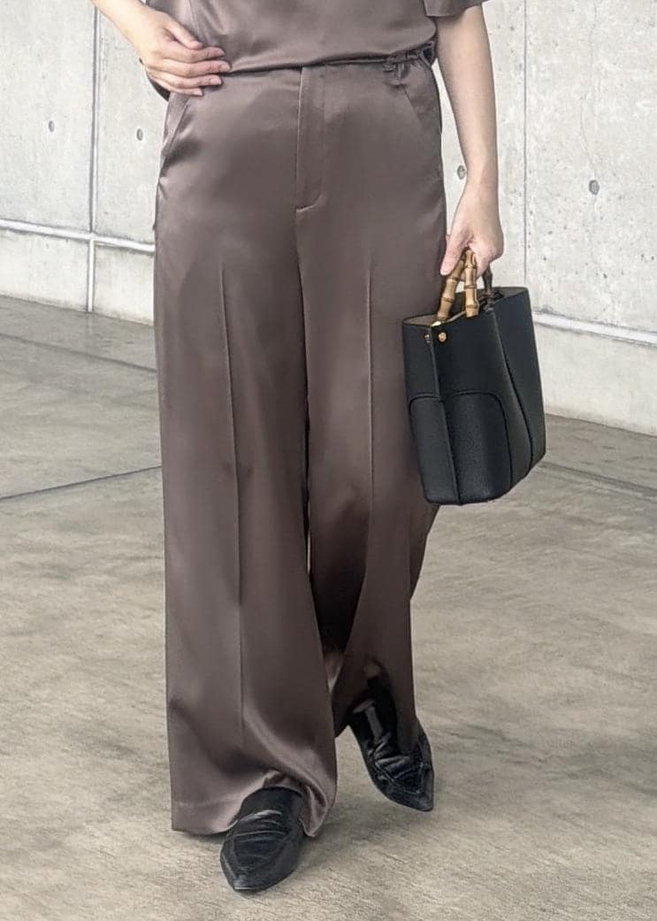 ストレッチ性がありとても着やすいです。光沢があるのでキレイ目にも合わせやすく、カジュアルなアイテムと合わせても大人カジュアルに着ることが出来ます。ウエストもゴムなので楽ちんです。同素材のブラウスもあるのでセットアップでも着ていただけます。 -