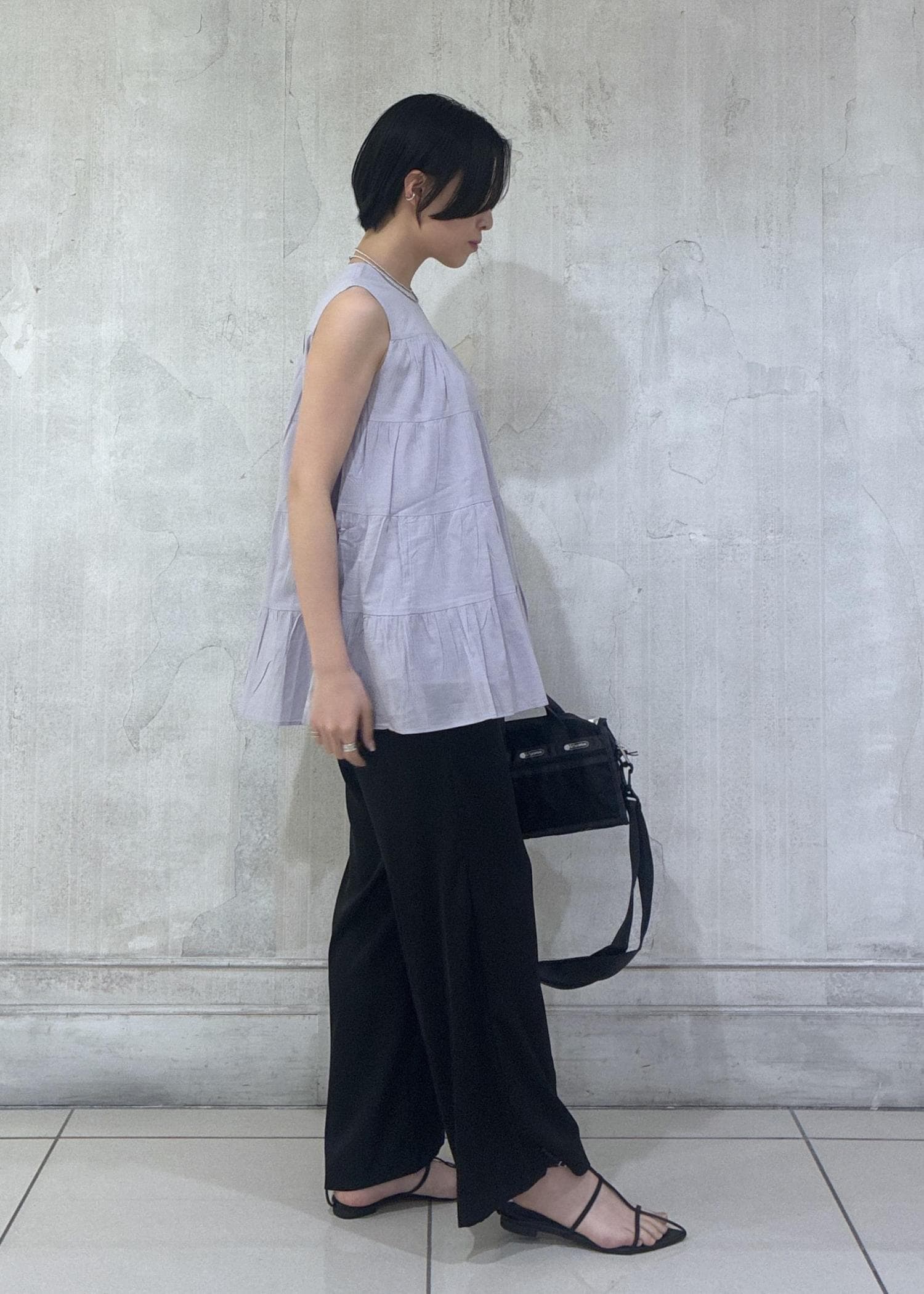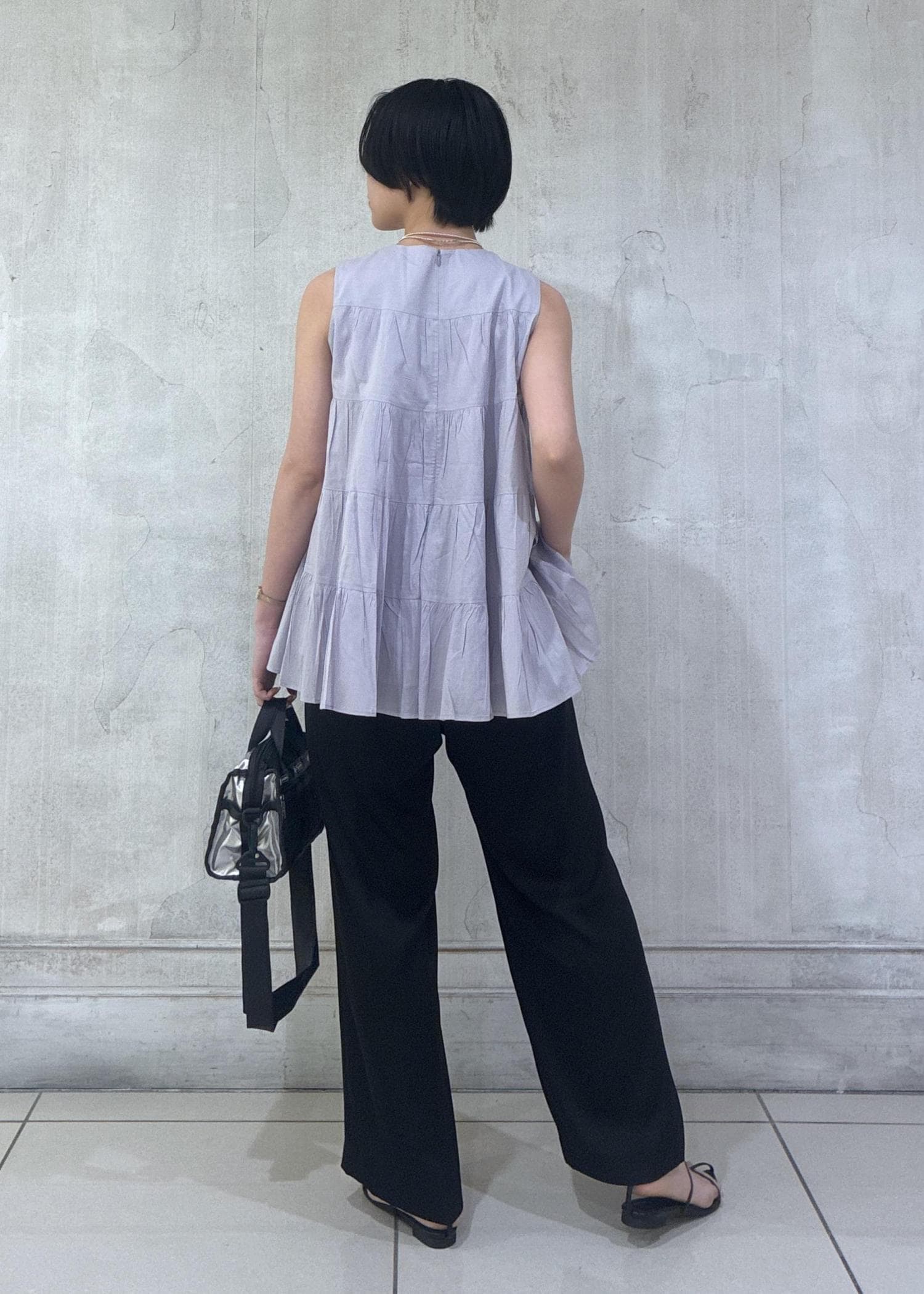 ワイド過ぎない落ち感がキレイなドロストパンツで、足を長く軽やかに履けます。