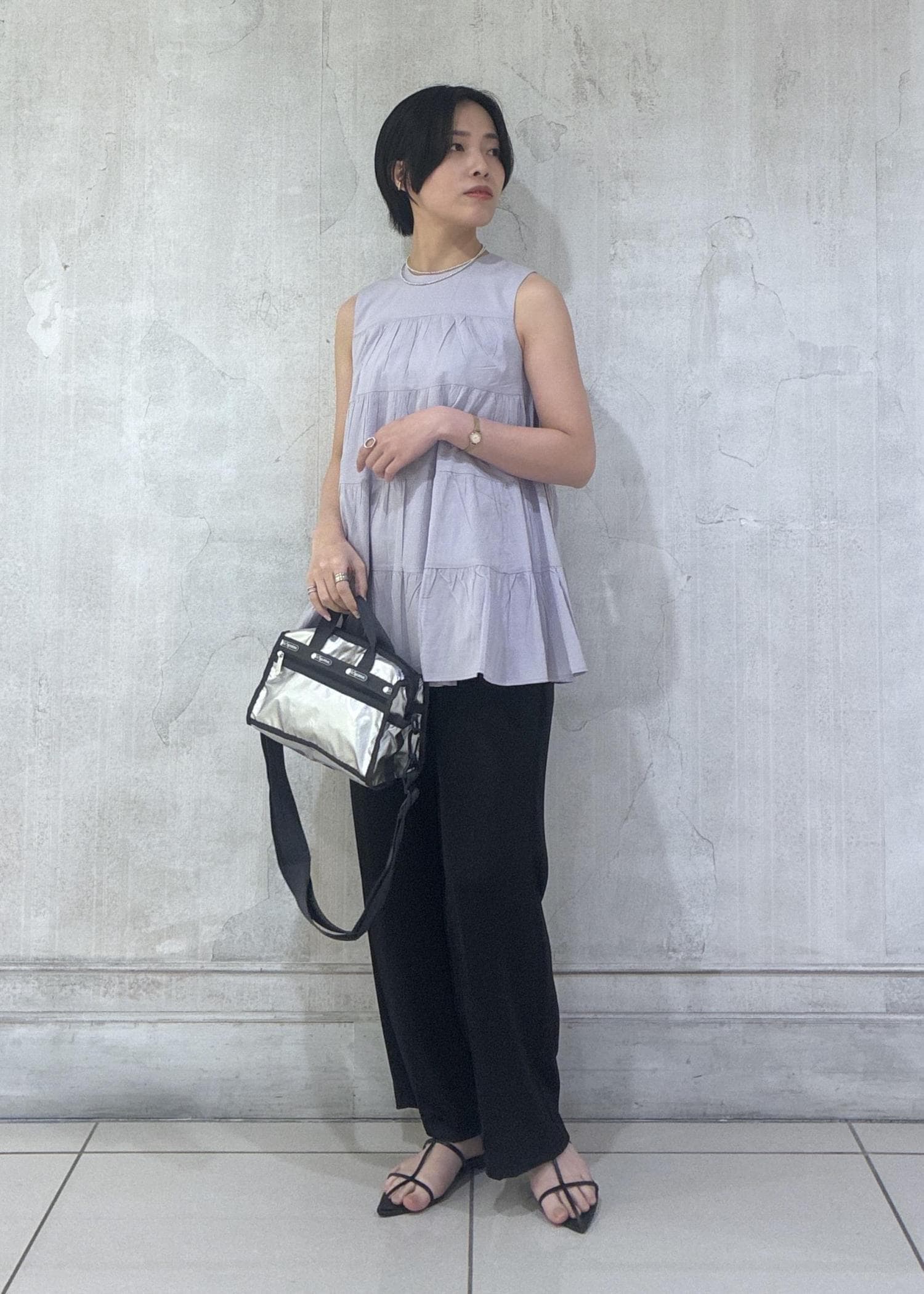 ふわっと甘めなMARIHAのブラウスにシルバーの小物とで大人フェミニンスタイルにまとめたのがポイントです♪