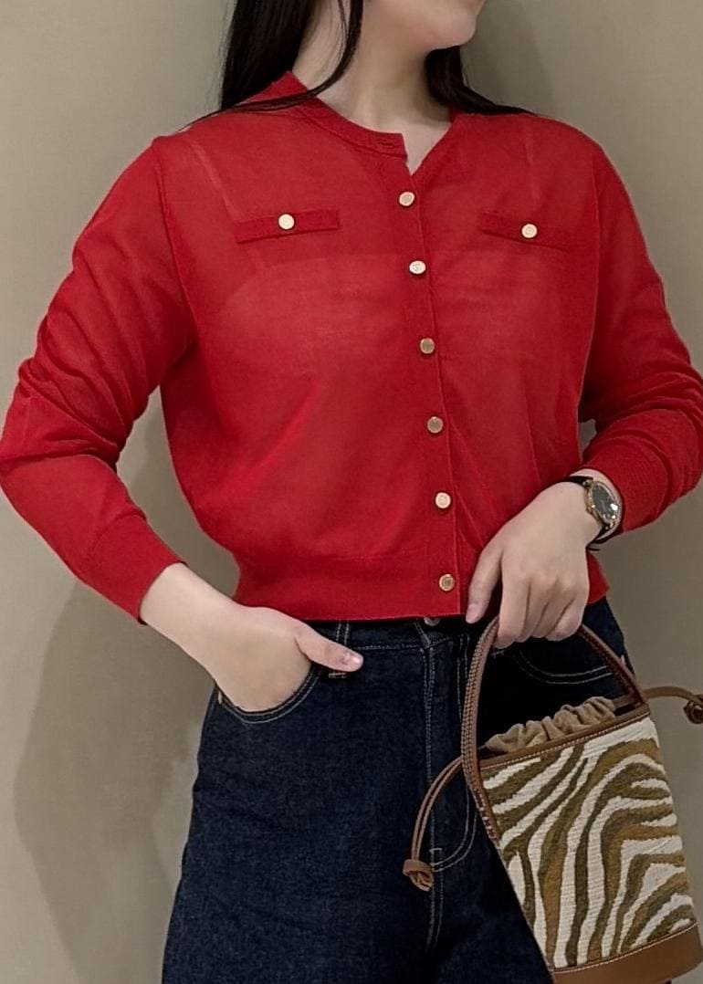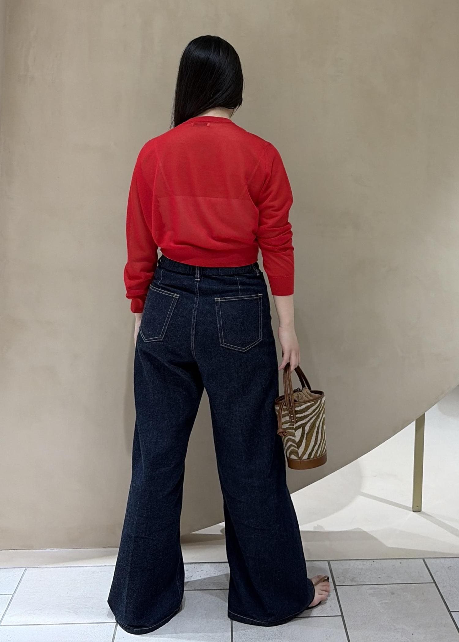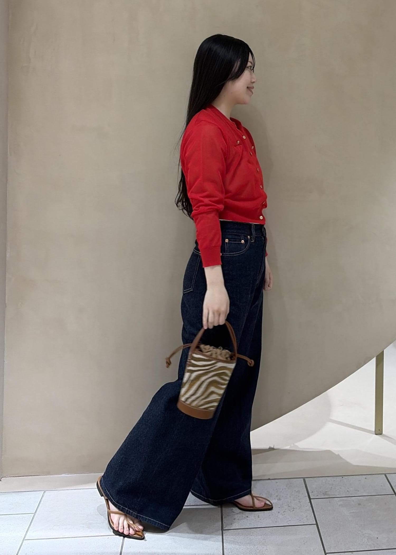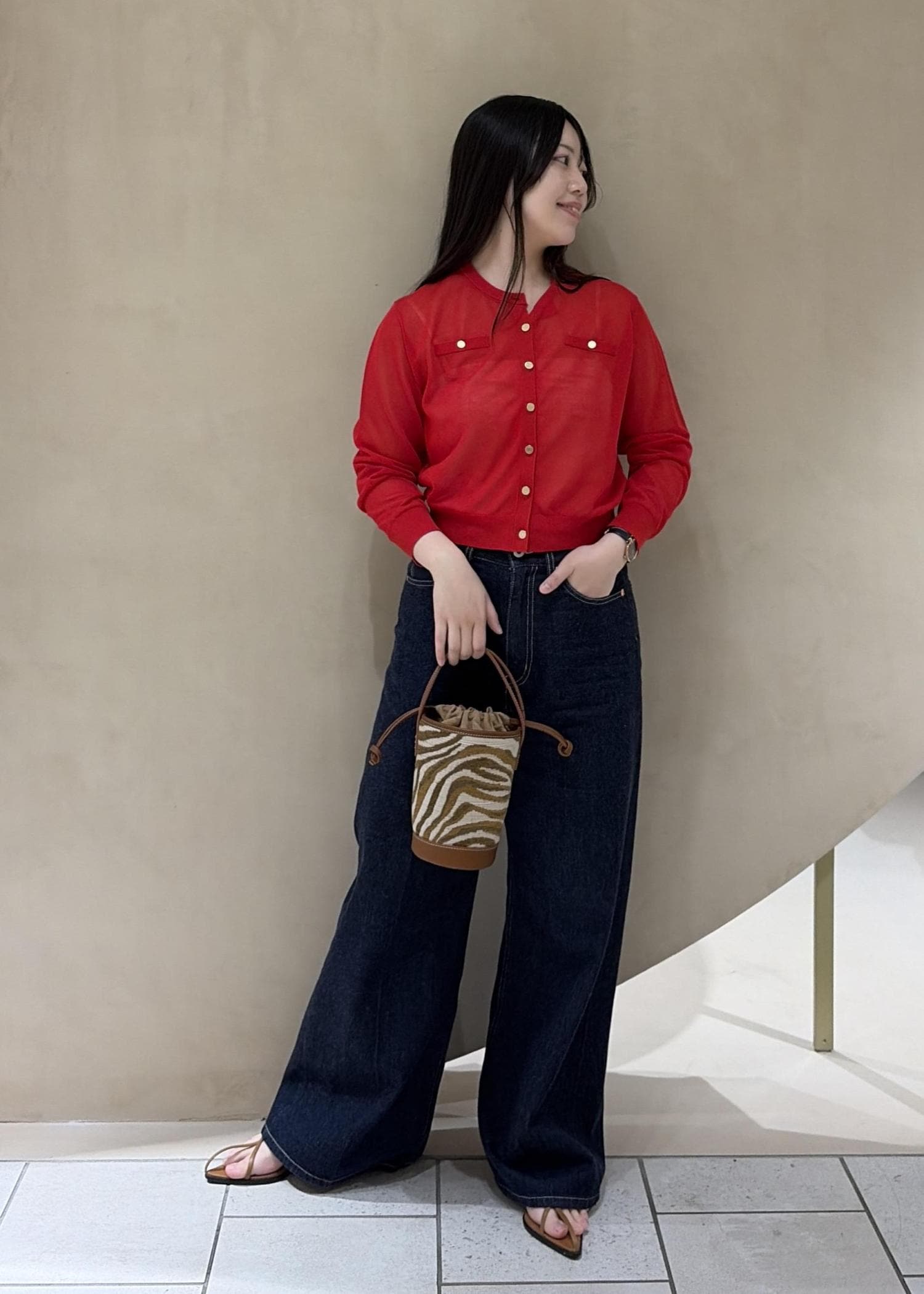 赤とネイビーの組み合わせは少し重たくなりがちですが、カーディガンのシアーな質感が抜け感を出してくれるので、夏でも爽やかに着ていただけます!