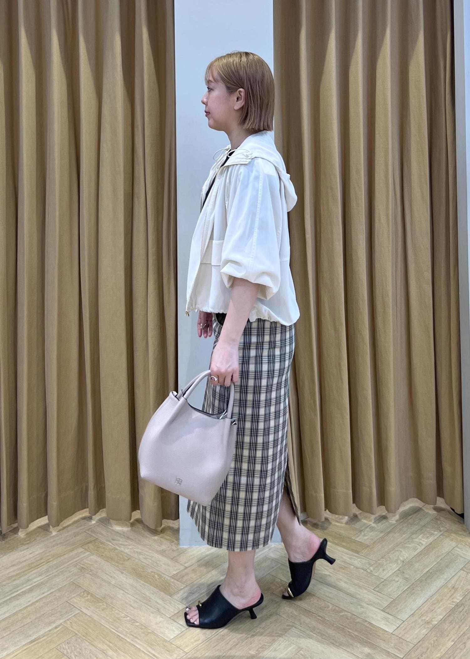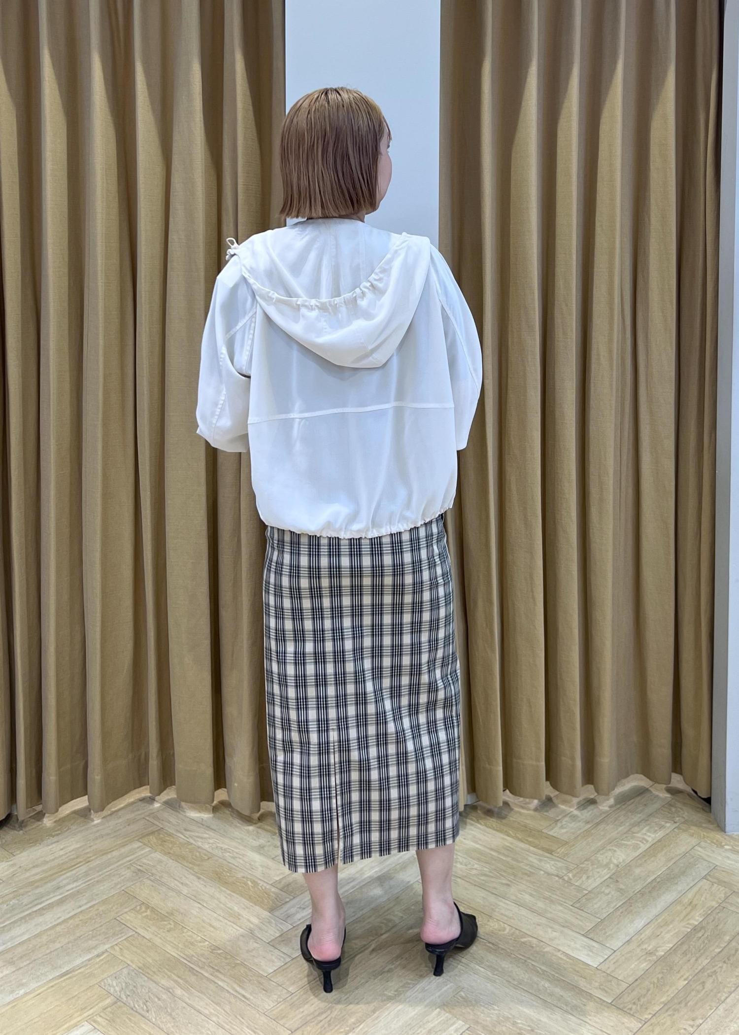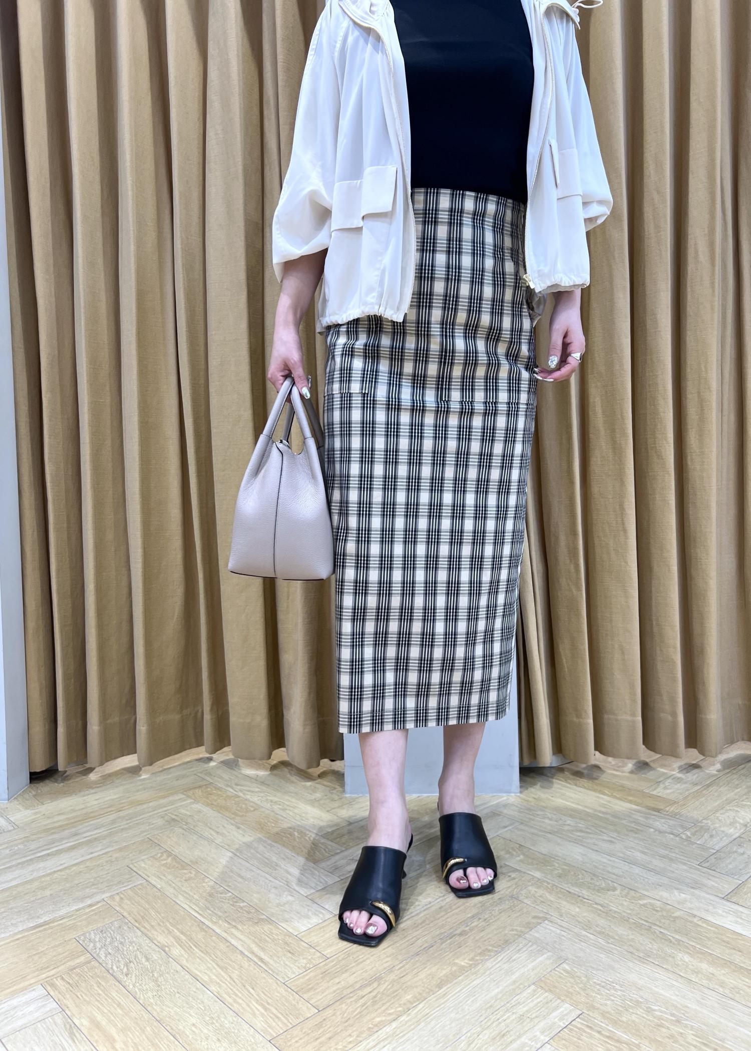 チェック柄が目を惹くタイトスカート。