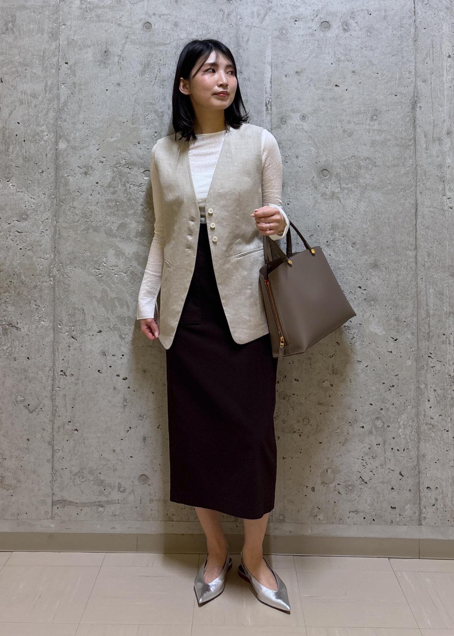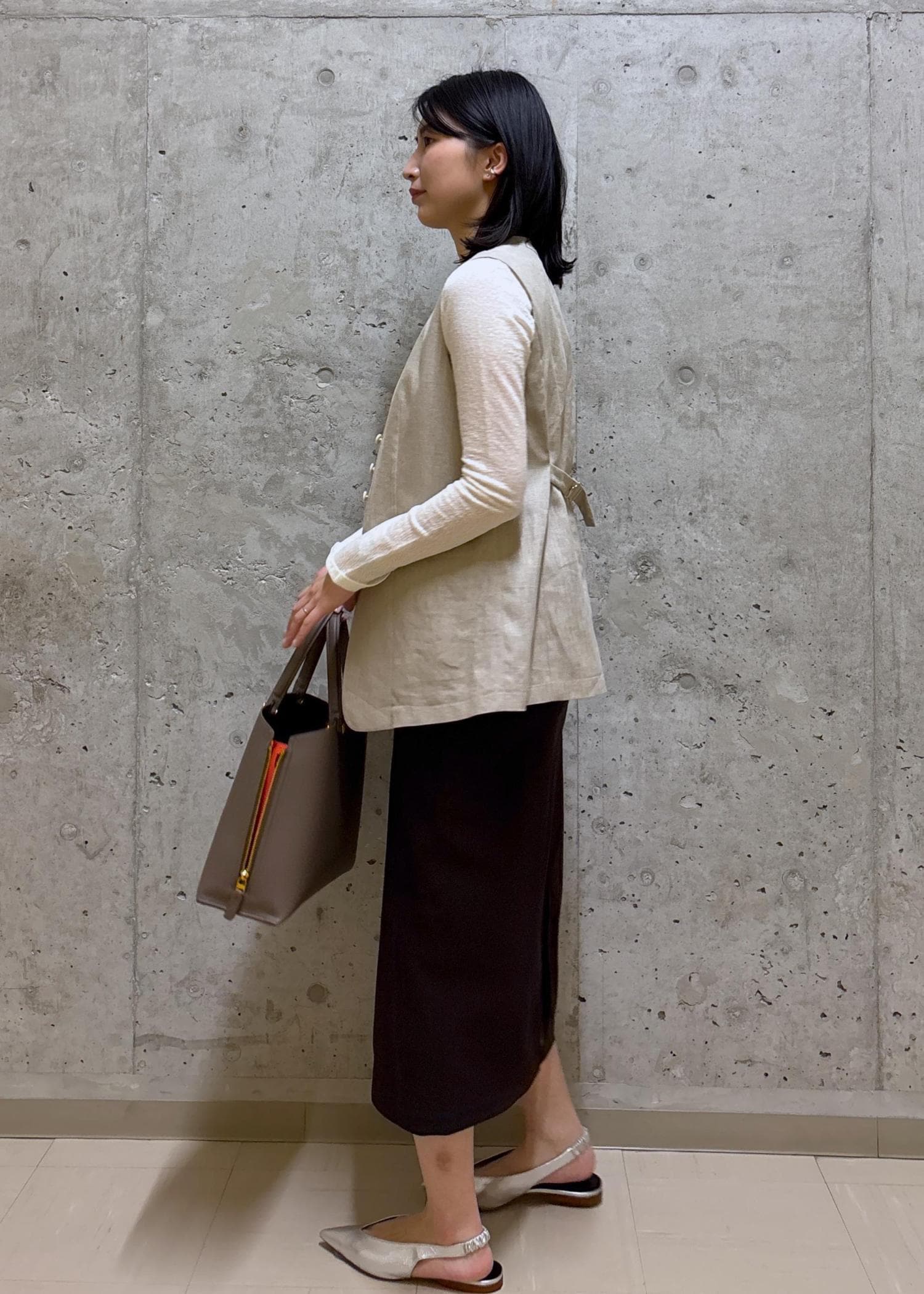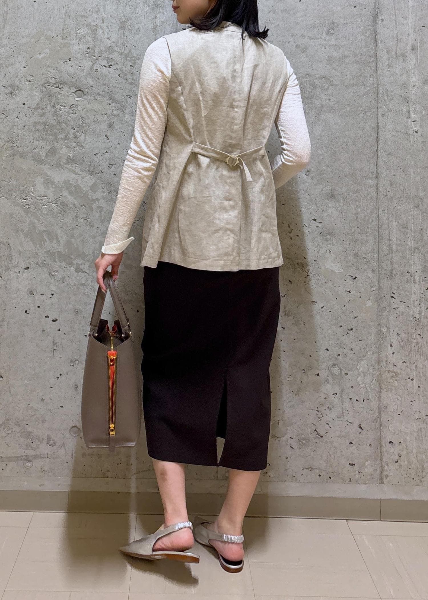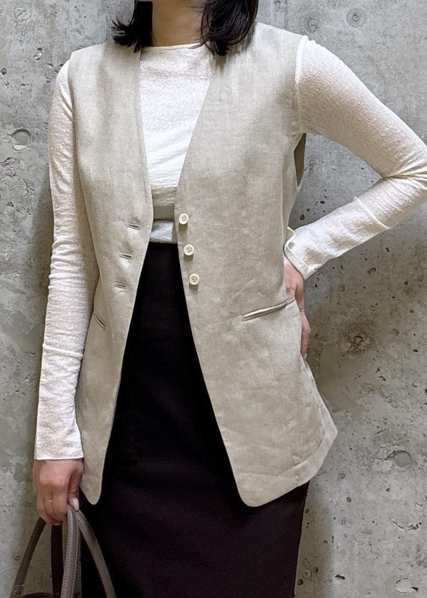 ROPÉリネンスリーブレスジレ/セットアップ対応ベージュ / F¥27,500レビューコンパクトなサイズ感ですが身幅は少し余裕があり、ニットも重ね着できます。