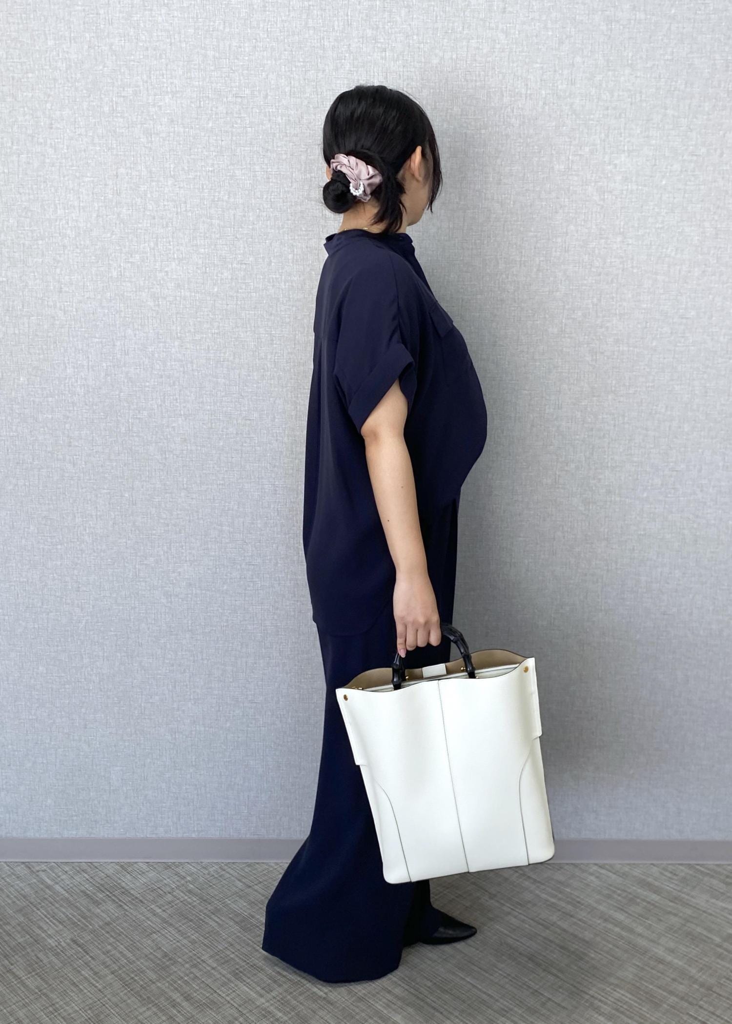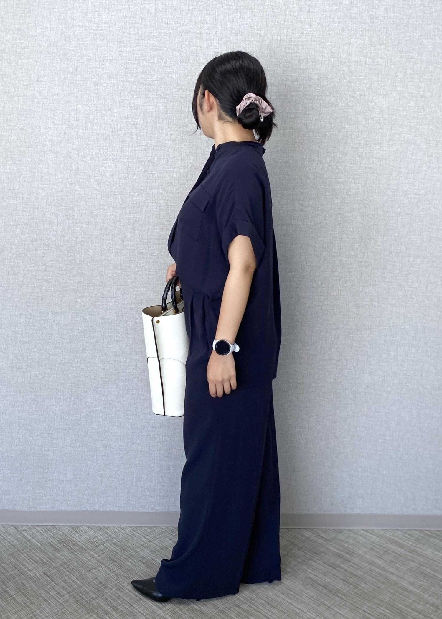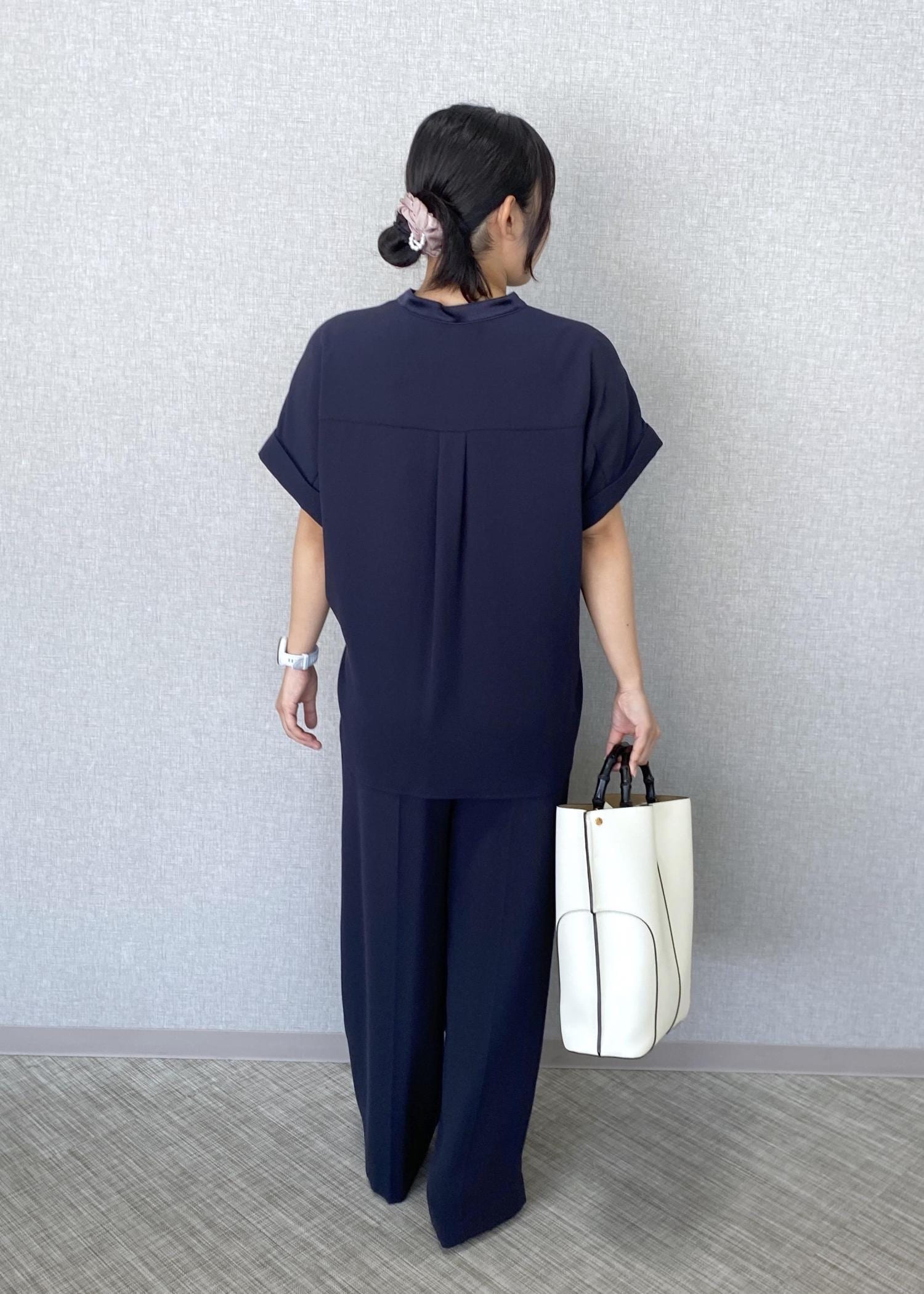ネイビーのトリアセテートシャツとワイドパンツをセットアップで合わせた、上品なお仕事コーディネートです。