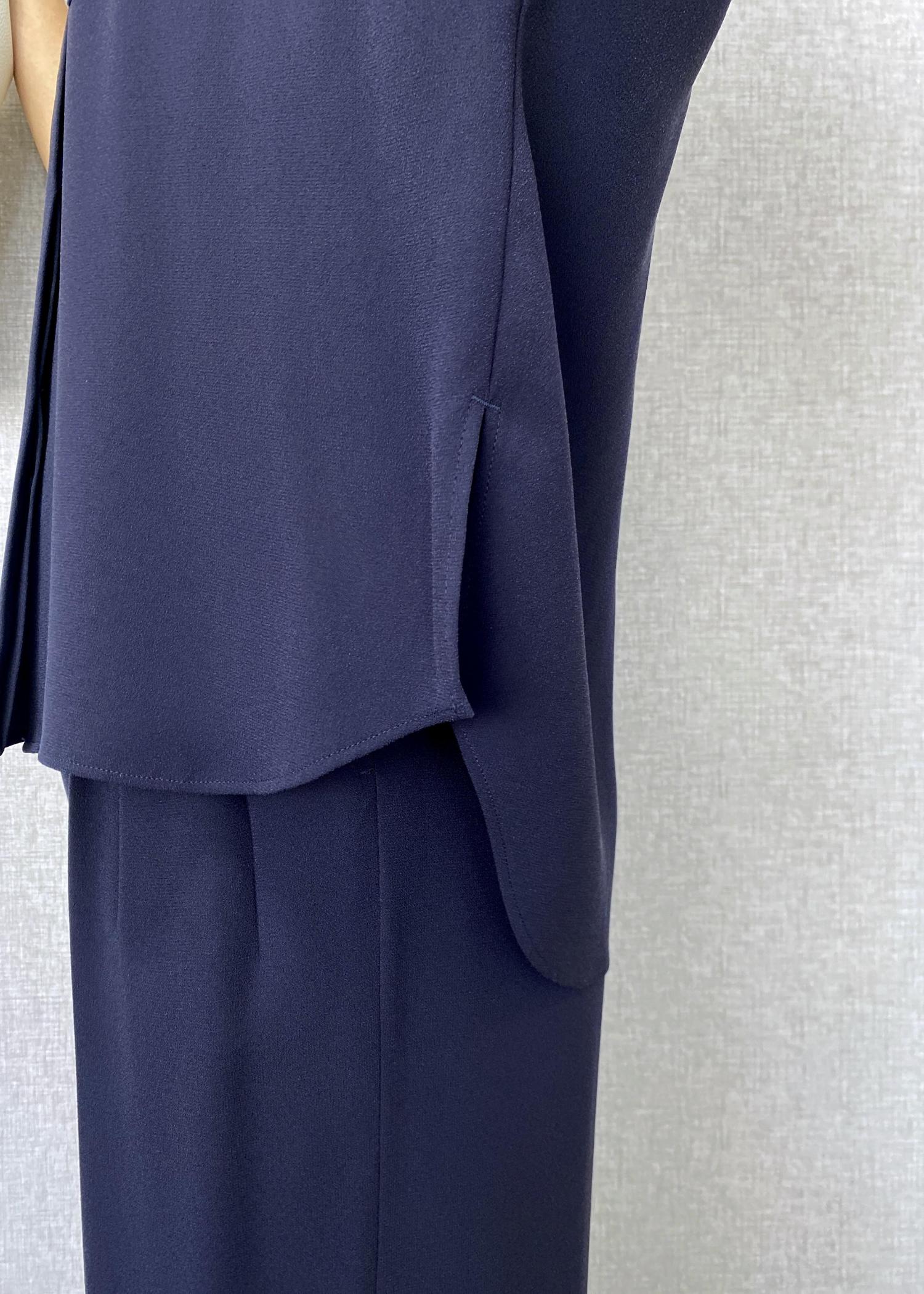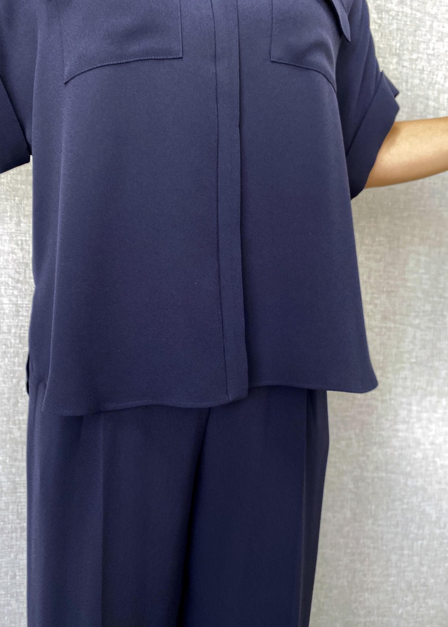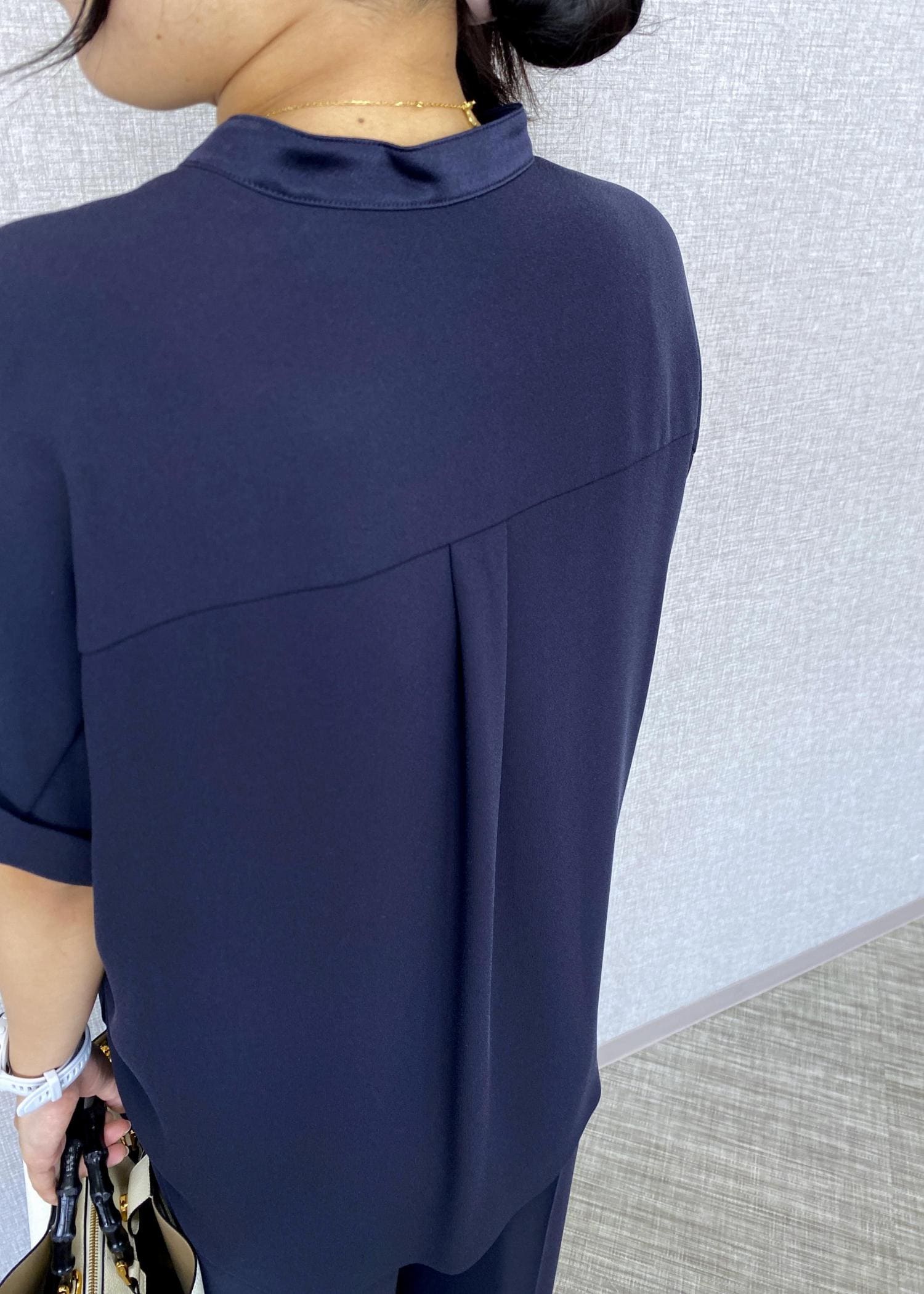 ネイビーのトリアセテートシャツとワイドパンツをセットアップで合わせた、上品なお仕事コーディネートです。
