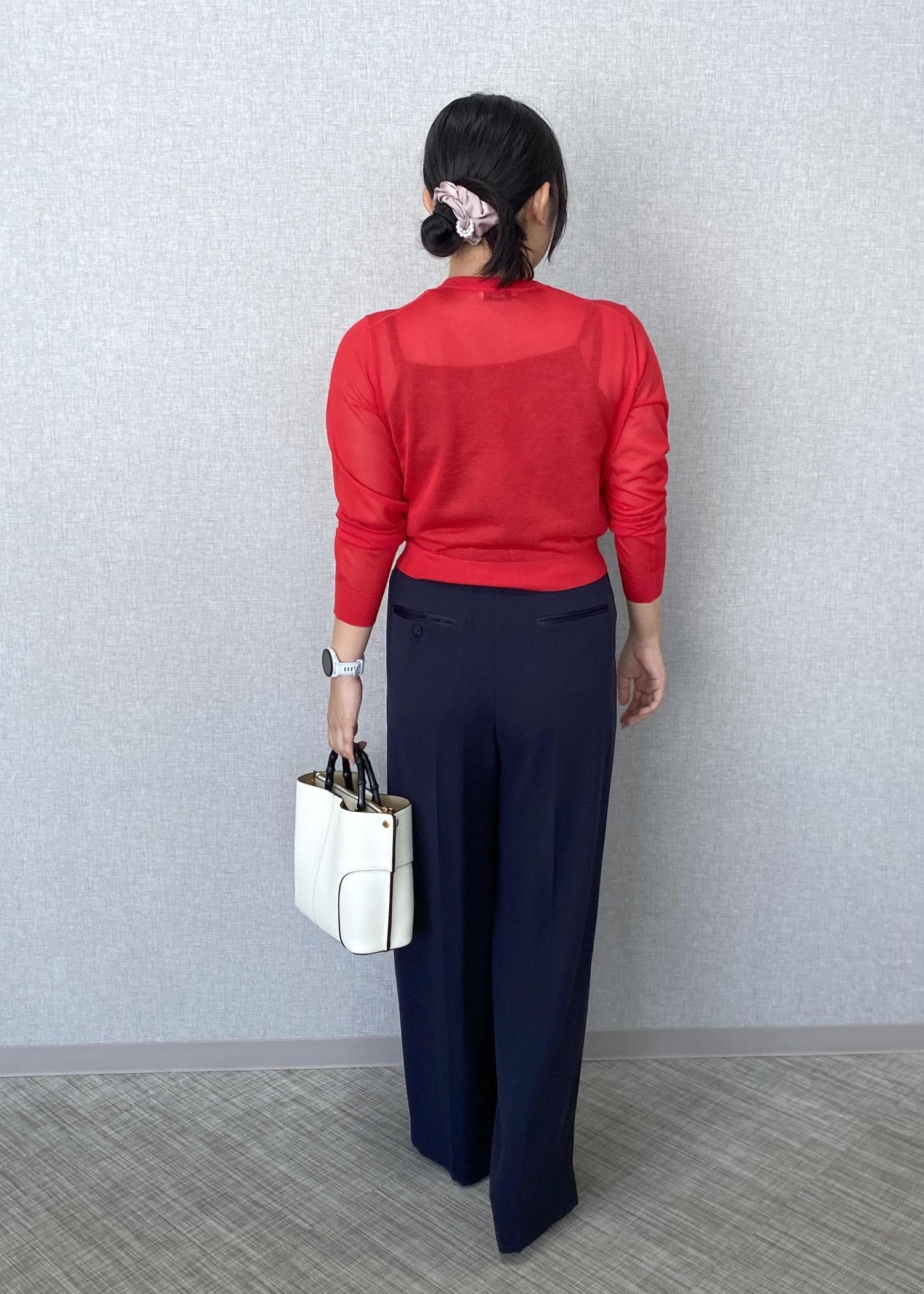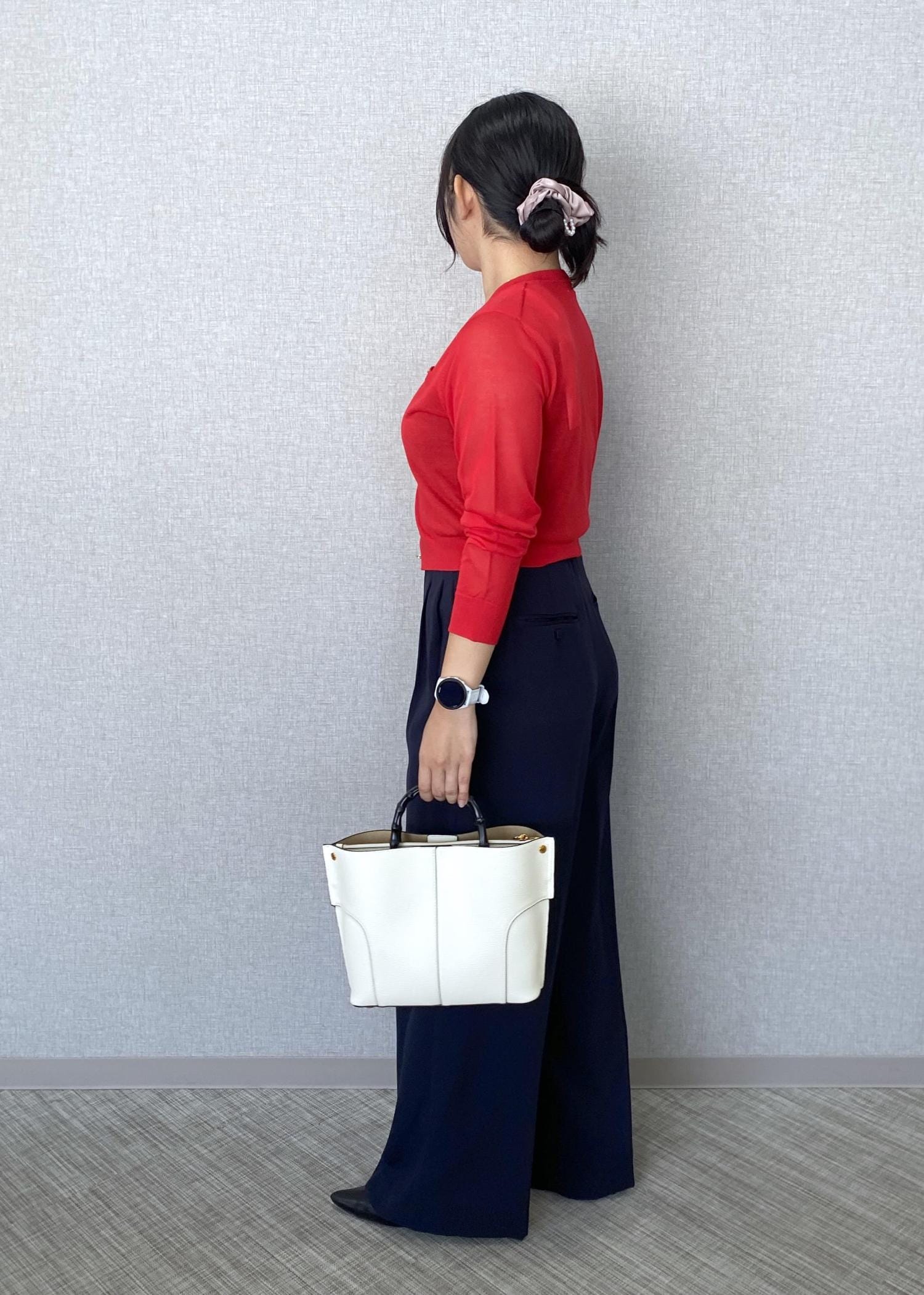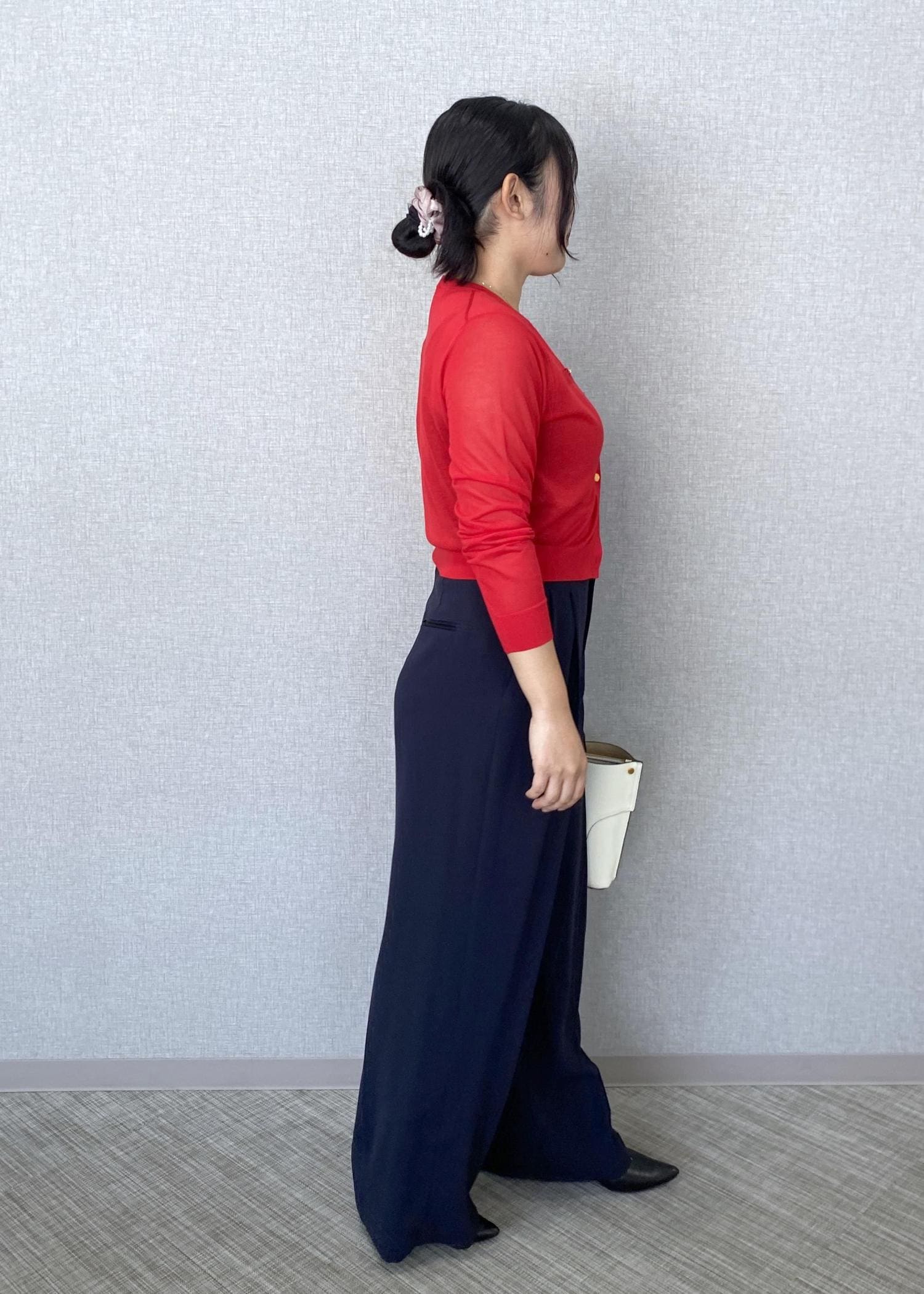 ネイビーのワイドパンツに、LEVITAの赤のカーディガンを合わせたコーディネートです。