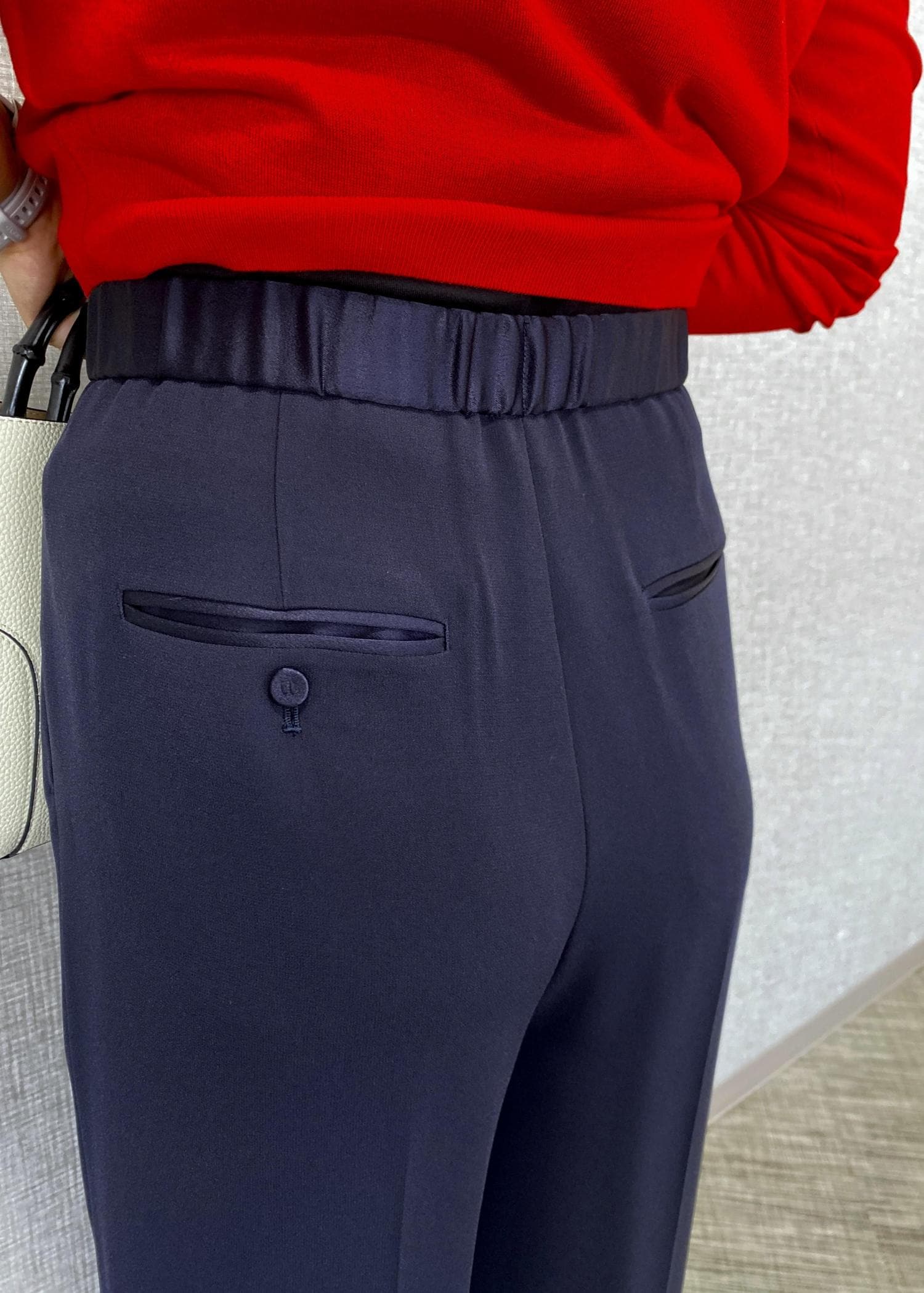 ゴム部分にはほんのり光沢のある素材が使われており、ラフになりすぎず上品な印象に。