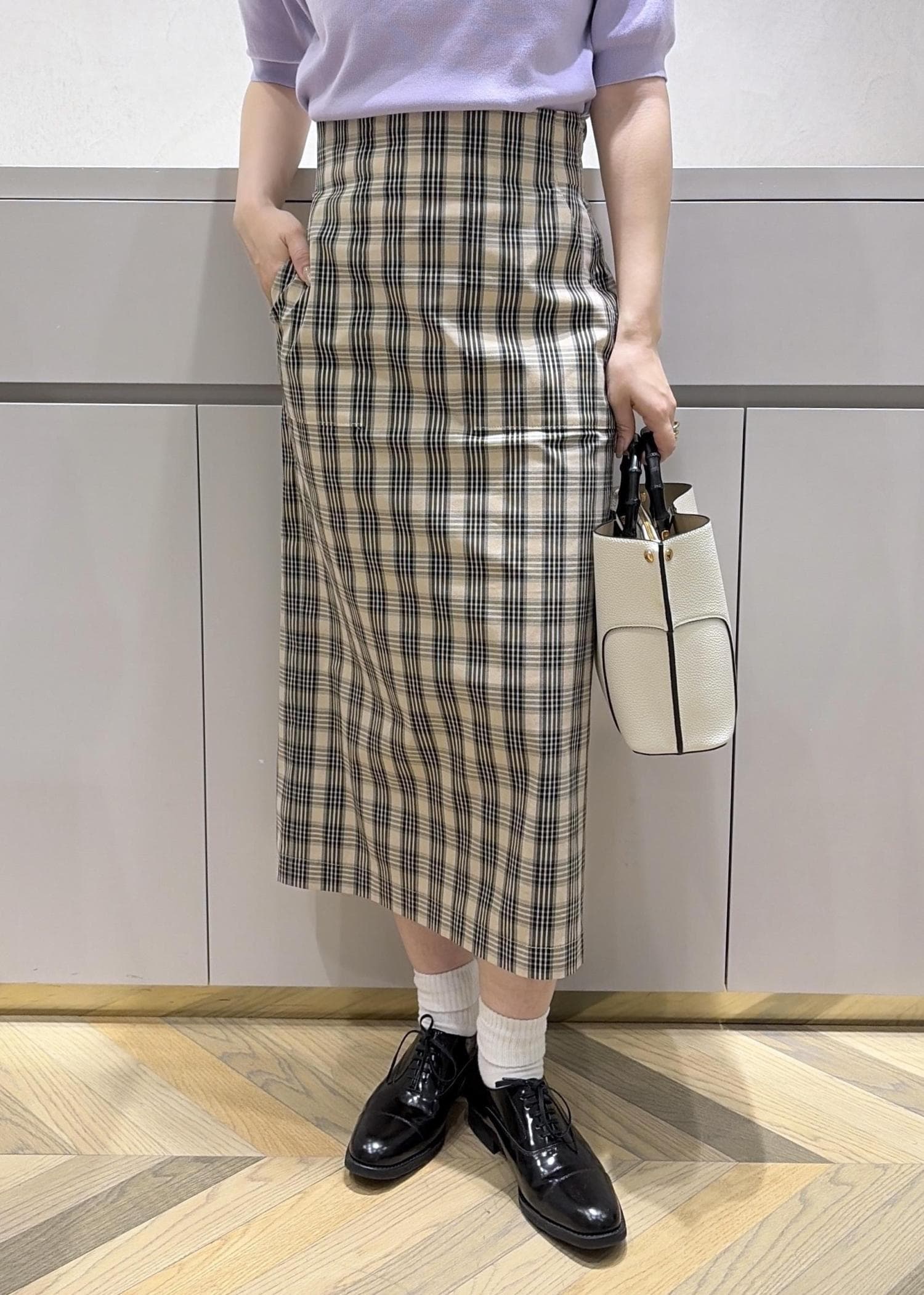 ROPÉ[美人スカート]【DEVEAUX(デヴォー)】別注ハイストレッチチェックポケット付きタイトスカート/26SS・イージーケアベージュ / 38¥29,700レビュー大人気、美人スカートのチェック柄バージョン♪
